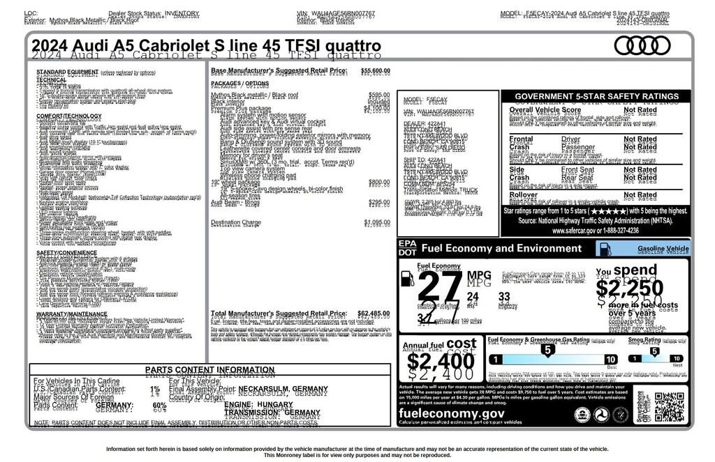 2024 Audi A5 45 S line Premium Plus quattro Recent Arrival! **Prices listed do not include a $250 documentation fee, applicable tax, title, tags, license, or $195 service and preparation. All pricing, vehicle information, and features (such as accessories and color) are believed to be accurate, but we do not warrant or guarantee such accuracy. The prices shown above may vary from region to region, and incentives are subject to change. Some offers listed may not be available to all customers. All online sale commitments are subject to confirmation of continued availability of vehicle. Once availability is confirmed, online sale agreement becomes binding upon the parties. If any information found on the website is thought to be erroneous, please verify information with a customer service representative. See dealer for full details. quattro, Black Leather, 10 Speakers, 4-Wheel Disc Brakes, ABS brakes, Air Conditioning, Alloy wheels, AM/FM radio, Anti-whiplash front head restraints, Auto High-beam Headlights, Auto-dimming Rear-View mirror, Automatic temperature control, Brake assist, Bumpers: body-color, Compass, Convertible roof lining, Convertible roof wind blocker, Delay-off headlights, Driver door bin, Driver vanity mirror, Dual front impact airbags, Dual front side impact airbags, Electronic Stability Control, Emergency communication system: Audi connect CARE, Exterior Parking Camera Rear, Four wheel independent suspension, Front anti-roll bar, Front Bucket Seats, Front Center Armrest, Front dual zone A/C, Front fog lights, Front reading lights, Garage door transmitter: HomeLink, Genuine wood console insert, Genuine wood dashboard insert, Genuine wood door panel insert, Glass rear window, Heated door mirrors, Heated front seats, Heated Front Sport Seats, Heated steering wheel, Illuminated entry, Integrated roll-over protection, Knee airbag, Leather Seating Surfaces, Leather Shift Knob, Leather steering wheel, Low tire pressure warning, Occupant sensing airbag, Outside temperature display, Panic alarm, Passenger door bin, Passenger vanity mirror, Power adjustable front head restraints, Power convertible roof, Power door mirrors, Power driver seat, Power passenger seat, Power steering, Power windows, Radio data system, Radio: Audi Sound System, Rain sensing wipers, Rear air conditioning, Rear anti-roll bar, Rear reading lights, Rear window defroster, Remote keyless entry, Speed control, Speed-sensing steering, Speed-Sensitive Wipers, Split folding rear seat, Steering wheel mounted audio controls, Tachometer, Telescoping steering wheel, Tilt steering wheel, Traction control, Trip computer, Turn signal indicator mirrors, Variably intermittent wipers, Wheels: 18 5-Double-Spoke Design, quattro, Black Leather. CARFAX One-Owner. Clean CARFAX. 2D Convertible quattro 45 S line Premium Plus 7-Speed Automatic S tronic 2.0L 4-Cylinder TFSI quattro Black (812) 477-6201 and shop online at www.dpathonda.com.