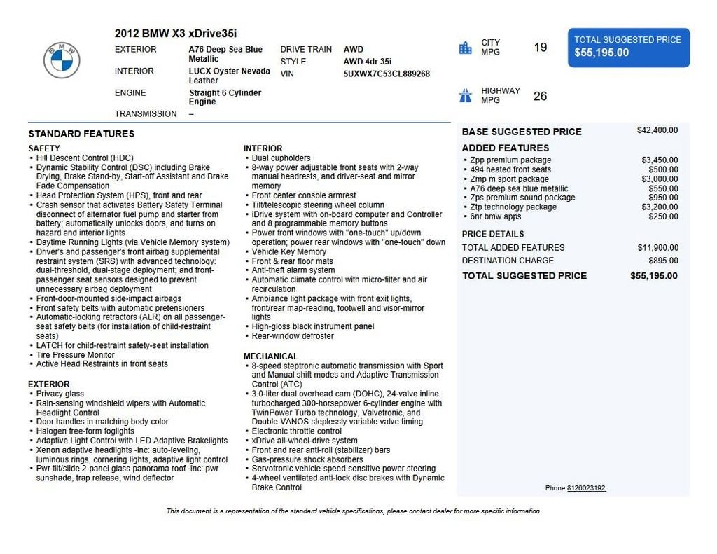 2012 BMW X3 xDrive35i VEHICLE SOLD AS-IS. We want you to shop confidently for your next used car at The BIG Ford Store, D-Patrick Ford. We are located on Highway 41 and Walnut in Evansville, right next to the Lloyd Expressway. This vehicle’s low price is reflective of its age, condition, and mileage and we do not warrant its mechanical or overall condition. This vehicle is provided with a CarFax vehicle history report. This is an AS-IS vehicle and is not available for additional service plans. *Prices listed do not include a $250 documentation fee, applicable tax, title, tags, license, or $195 service and preparation. All pricing, vehicle information, and features (such as accessories and color) are believed to be accurate, but we do not warrant or guarantee such accuracy. The prices shown above may vary from region to region, and incentives are subject to change. Some offers listed may not be available to all customers. All online sale commitments are subject to confirmation of continued availability of vehicle. Once availability is confirmed, online sale agreement becomes binding upon the parties. If any information found on the website is thought to be erroneous, please verify information with a customer service representative. See dealer for full details. Looking to sell your current vehicle? We buy cars for cash. Every test drive at D-Patrick Ford in Evansville earns $10 to a local charity. Schedule your test drive today! 8-Speed Automatic, 12 Speakers, 3.385 Axle Ratio, 4-Wheel Disc Brakes, ABS brakes, Air Conditioning, Alloy wheels, AM/FM radio, Anti-whiplash front head restraints, Automatic temperature control, BMW Apps, Brake assist, CD player, Delay-off headlights, Driver door bin, Driver vanity mirror, Dual front impact airbags, Dual front side impact airbags, Electronic Stability Control, Four wheel independent suspension, Front anti-roll bar, Front Bucket Seats, Front dual zone A/C, Front fog lights, Front reading lights, Fully automatic headlights, Genuine wood console insert, Genuine wood dashboard insert, Genuine wood door panel insert, Illuminated entry, Leatherette Upholstery, Low tire pressure warning, M Sport Package, Memory seat, Occupant sensing airbag, Outside temperature display, Overhead airbag, Panic alarm, Passenger door bin, Passenger vanity mirror, Performance Control, Power door mirrors, Power driver seat, Power passenger seat, Power steering, Power windows, Radio data system, Rain sensing wipers, Rear anti-roll bar, Rear fog lights, Rear reading lights, Rear window defroster, Rear window wiper, Rear-View Camera w/Top View, Remote keyless entry, Security system, Smartphone Integration, Speed control, Speed-sensing steering, Speed-Sensitive Wipers, Split folding rear seat, Spoiler, Sport Seats, Sport steering wheel, Steering wheel mounted audio controls, Tachometer, Telescoping steering wheel, Tilt steering wheel, Traction control, Trip computer, Variably intermittent wipers, 8-Speed Automatic. 4D Sport Utility xDrive35i 8-Speed Automatic 3.0L I6 DOHC 24V TwinPower Turbo AWD Deep Sea Blue Metallic CALL TODAY (812) 625-4823 OR SHOP ONLINE AT WWW.DPATRICKFORD.COM.