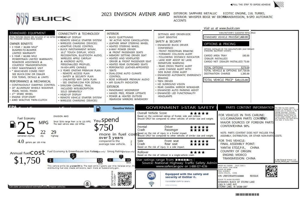 • SAPPHIRE METALLIC,AXLE 3.47 FINAL DRIVE RATIO,HEADLAMPS LED,WHISPER BEIGE SEATS PERFORATED LEATHER-APPOINTED SEAT TRIM with Ebony interior accents,SEATS FRONT BUCKET (STD),LPO CARGO AREA TRAY,LPO CARGO NET VERTICAL,AVENIR PREFERRED EQUIPMENT GROUP includes standard equipment,ENGINE 2.0L TURBO 4-CYLINDER SIDI (228 hp [170 kW] @ 5000 rpm 258 lb-ft of torque [350 N-m] @ 1500-4000 rpm) (STD),AUDIO SYSTEM 10.2 DIAGONAL BUICK INFOTAINMENT SYSTEM WITH NAVIGATION includes multi-touch display AM/FM/SiriusXM stereo Bluetooth streaming audio for music and most phones Wireless Apple Carplay/Wireless Android Auto for compatible phones advanced voice recognition in-vehicle apps personalized profiles for infotainment and vehicle settings. Includes greater memory (STD),TRANSMISSION 9-SPEED AUTOMATIC (STD),Cruise Control,Navigation System,Premium Sound System,MP3 Capability,Rear Parking Aid,Active Suspension,Universal Garage Door Opener,Bluetooth Connection,Back-Up Camera,Auxiliary Audio Input,Heads-Up Display,HD Radio,Automatic Parking,Adaptive Cruise Control,Aerial View Display System,Front Collision Mitigation,Front Collision Warning,LED Headlights,Lane Departure Warning,Lane Keeping Assist,Front Collision Mitigation,Front Collision Warning,Automatic Highbeams,Rear Parking Aid,Blind Spot Monitor,Cross-Traffic Alert,Turbocharged,Immobilizer,Keyless Start,All Wheel Drive,Power Steering,ABS,4-Wheel Disc Brakes,Active Suspension,Aluminum Wheels,Tires - Front Performance,Tires - Rear Performance,Temporary Spare Tire,Sun/Moonroof,Generic Sun/Moonroof,Panoramic Roof,Automatic Headlights,Automatic Headlights,Heated Mirrors,Power Mirror(s),Privacy Glass,Remote Trunk Release,Power Liftgate,Hands-Free Liftgate,AM/FM Stereo,Navigation System,Satellite Radio,MP3 Capability,Bluetooth Connection,Auxiliary Audio Input,Smart Device Integration,Requires Subscription,Premium Sound System,HD Radio,Satellite Radio,Requires Subscription,WiFi Hotspot,Bluetooth Connection,Smart Device Integration,Bucket Seats,Leather Seats,Rear Bench Seat,Rear Bench Seat,Power Driver Seat,Power Passenger Seat,Heated Front Seat(s),Heated Rear Seat(s),Heated Front Seat(s),Heated Rear Seat(s),Cooled Front Seat(s),Cooled Rear Seat(s),Floor Mats,Adjustable Steering Wheel,Leather Steering Wheel,Heated Steering Wheel,Heads-Up Display,Power Windows,Power Windows,Power Windows,Power Windows,Security System,Keyless Entry,Power Door Locks,Keyless Start,Universal Garage Door Opener,Remote Engine Start,Cruise Control,Adaptive Cruise Control,Power Outlet,MP3 Capability,Auxiliary Audio Input,Climate Control,Multi-Zone A/C,A/C,Passenger Air Bag Sensor,Rear Defrost,Back-Up Camera,Cargo Shade,Brake Assist,Front Collision Mitigation,Front Collision Warning,Front Collision Mitigation,Traction Control,Stability Control,Daytime Running Lights,Driver Air Bag,Passenger Air Bag,Front Side Air Bag,Front Head Air Bag,Rear Head Air Bag,Knee Air Bag,Passenger Air Bag Sensor,Telematics,Requires Subscription,Blind Spot Monitor,Cross-Traffic Alert,Lane Departure Warning,Lane Keeping Assist,Front Collision Warning,Blind Spot Monitor,Cross-Traffic Alert,Back-Up Camera,Aerial View Display System,Rear Parking Aid,Automatic Parking,Driver Restriction Features,Driver Restriction Features,Tire Pressure Monitor,Telematics,WiFi Hotspot,Requires Subscription