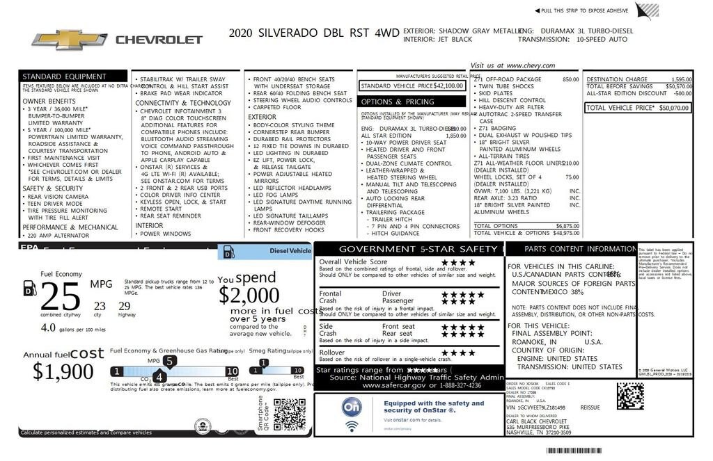 • AIR CLEANER HIGH-CAPACITY,GVWR 7100 LBS. (3221 KG),LPO WHEEL LOCKS SET OF 4,WHEELS 18 X 8.5 (45.7 CM X 21.6 CM) BRIGHT SILVER PAINTED ALUMINUM (STD),DIFFERENTIAL HEAVY-DUTY LOCKING REAR,LPO ALL-WEATHER FLOOR LINERS 1ST AND 2ND ROWS (includes Z71 logo on front mats),STEERING COLUMN MANUAL TILT AND TELESCOPING,TIRE SPARE 265/70R17SL ALL-SEASON BLACKWALL (STD),HILL DESCENT CONTROL,ALL-STAR EDITION includes (PCL) Convenience Package (G80) locking rear differential and (Z82) Trailering Package,SEAT ADJUSTER DRIVER 10-WAY POWER INCLUDING LUMBAR,SKID PLATES,ENGINE BLOCK HEATER,TRAILERING PACKAGE includes trailer hitch 7-pin and 4-pin connectors and (CTT) Hitch Guidance,TRANSFER CASE TWO-SPEED electronic Autotrac with rotary dial control,SEATS FRONT 40/20/40 SPLIT-BENCH with covered armrest storage and under-seat storage (lockable) (STD),SHADOW GRAY METALLIC,TIRES 265/65R18SL ALL-TERRAIN BLACKWALL,STEERING WHEEL HEATED,REAR AXLE 3.23 RATIO,STEERING WHEEL LEATHER-WRAPPED,AIR CONDITIONING DUAL-ZONE AUTOMATIC CLIMATE CONTROL,CONVENIENCE PACKAGE includes (CJ2) dual-zone automatic climate control (A2X) 10-way power driver seat including power lumbar (KA1) heated driver and passenger seats (NP5) leather-wrapped steering wheel (KI3) heated steering wheel and (N37) manual tilt/telescoping steering column,TRANSMISSION 10-SPEED AUTOMATIC ELECTRONICALLY CONTROLLED with overdrive and tow/haul mode. Includes Cruise Grade Braking and Powertrain Grade Braking,EXHAUST DUAL WITH POLISHED OUTLETS,ENGINE DURAMAX 3.0L TURBO-DIESEL I6 (277 hp [206.6 kW] @ 3750 rpm 460 lb-ft of torque [623.7 N-m] @ 1500 rpm) Includes (KW5) 220-amp alternator and (K05) engine block heater. Not available with CC10743 Crew Cab Standard Bed 2WD models.),JET BLACK CLOTH SEAT TRIM,RST PREFERRED EQUIPMENT GROUP includes standard equipment,AUDIO SYSTEM CHEVROLET INFOTAINMENT 3 SYSTEM 8 diagonal color touchscreen AM/FM stereo. Additional features for compatible phones include: Bluetooth audio streaming for 2 active devices voice command pass-through to phone Apple CarPlay and Android Auto capable. (STD),HITCH GUIDANCE,Z71 OFF-ROAD PACKAGE includes (Z71) Off-Road suspension (JHD) Hill Descent Control (NZZ) skid plates and (K47) high-capacity air filter Includes Z71 hard badge (N10) dual exhaust (PZX) 18 bright silver painted wheels (XCK) 265/65R18 all-terrain blackwall tires (G80) locking differential and (NQH) 2-speed transfer case.,SEATING HEATED DRIVER AND FRONT OUTBOARD PASSENGER,Turbocharged,Four Wheel Drive,Power Steering,ABS,4-Wheel Disc Brakes,Aluminum Wheels,Tires - Front All-Season,Tires - Rear All-Season,Tires - Front All-Season,Tires - Rear All-Season,Tow Hooks,Daytime Running Lights,Fog Lamps,Heated Mirrors,Power Mirror(s),Privacy Glass,AM/FM Stereo,MP3 Capability,Bluetooth Connection,Auxiliary Audio Input,Smart Device Integration,Bluetooth Connection,WiFi Hotspot,Split Bench Seat,Cloth Seats,Pass-Through Rear Seat,Rear Bench Seat,Floor Mats,Floor Mats,Steering Wheel Audio Controls,Adjustable Steering Wheel,Power Windows,Power Windows,Power Door Locks,Remote Engine Start,Keyless Entry,Power Door Locks,Keyless Start,Cruise Control,Security System,Power Outlet,MP3 Capability,Auxiliary Audio Input,Power Outlet,A/C,A/C,Rear A/C,Rear Defrost,Traction Control,Stability Control,Daytime Running Lights,Driver Air Bag,Passenger Air Bag,Front Side Air Bag,Front Head Air Bag,Rear Head Air Bag,Passenger Air Bag Sensor,Telematics,Requires Subscription,Back-Up Camera,Driver Restriction Features,Tire Pressure Monitor