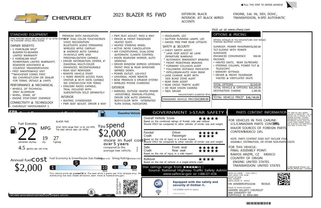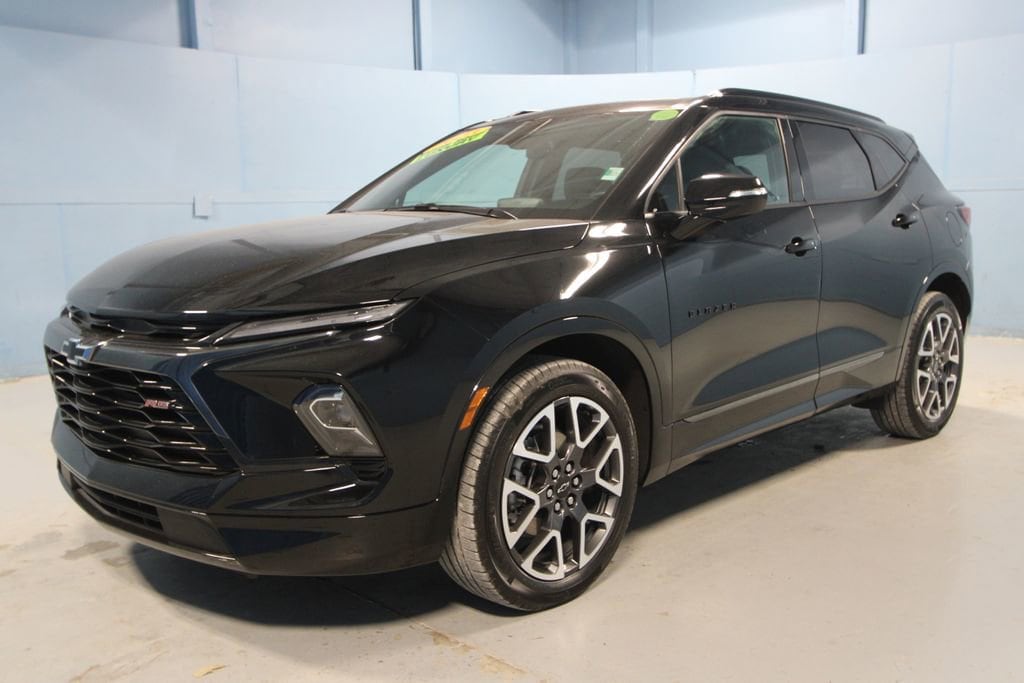 2023 Chevrolet Blazer RS We want you to shop confidently for your next used car at D-Patrick Boonville Ford and We make it EASY! Buy this used vehicle 100% online or in-store, EASY. Saving time at the dealership, EASY! Financing, EASY! Finding the car you love at the price you want, EASY! This pre-owned vehicle was put through an extensive inspection before hitting our lot. Because of this, we are able to offer a 3-month/3,000-mile comprehensive limited warranty. You also get our Love It or Return It 5-day, 300-mile Exchange Policy. See our website for more details on both. We also offer extended service plans, vehicle protection plans, and offer a CarFax vehicle history report. *Prices listed do not include a $250 documentation fee, applicable tax, title, tags, license, or $195 service and preparation. All pricing, vehicle information, and features (such as accessories and color) are believed to be accurate, but we do not warrant or guarantee such accuracy. The prices shown above may vary from region to region, and incentives are subject to change. Some offers listed may not be available to all customers. All online sale commitments are subject to confirmation of continued availability of vehicle. Once availability is confirmed, online sale agreement becomes binding upon the parties. If any information found on the website is thought to be erroneous, please verify information with a customer service representative. See dealer for full details. Looking to sell your current vehicle? We buy cars for cash. 3.49 Final Drive Axle Ratio, 4-Wheel Disc Brakes, 6-Way Power Front Passenger Seat Adjuster, 8 Speakers, 8-Way Power Driver Seat Adjuster, ABS brakes, Air Conditioning, Alloy wheels, AM/FM radio: SiriusXM with 360L, Apple CarPlay/Android Auto, Auto High-beam Headlights, Auto-dimming door mirrors, Auto-dimming Rear-View mirror, Automatic temperature control, Bose Premium 8-Speaker Audio System Feature, Brake assist, Bumpers: body-color, Child-Seat-Sensing Airbag, Compass, Delay-off headlights, Driver door bin, Driver vanity mirror, Dual front impact airbags, Dual front side impact airbags, Electronic Stability Control, Emergency communication system: OnStar and Chevrolet connected services capable, Enhanced Convenience Package, Four wheel independent suspension, Front anti-roll bar, Front Bucket Seats, Front Center Armrest, Front dual zone A/C, Front reading lights, Fully automatic headlights, Garage door transmitter, Heated door mirrors, Heated Driver & Front Passenger Seats, Heated front seats, Heated Rear Outboard Seating Positions, Heated Steering Wheel, Heated steering wheel, Illuminated entry, Knee airbag, Leather Shift Knob, Low tire pressure warning, Memory Settings For Driver Seat & Exterior Mirrors, Navigation System, Occupant sensing airbag, Outside temperature display, Overhead airbag, Overhead console, Panic alarm, Passenger door bin, Passenger vanity mirror, Perforated Leather-Appointed Seat Trim, Power door mirrors, Power Driver Lumbar Control, Power driver seat, Power Liftgate, Power Panoramic Tilt-Sliding Sunroof, Power passenger seat, Power steering, Power Tilt & Telescoping Steering Column, Power windows, Preferred Equipment Group 1RS, Premium audio system: Chevrolet Infotainment 3 Premium, Radio data system, Radio: Chevrolet Infotainment 3 Premium System, Rear anti-roll bar, Rear Park Assist w/Audible Warning, Rear reading lights, Rear seat center armrest, Rear window defroster, Rear window wiper, Remote keyless entry, Ride & Handling Suspension, Security system, SiriusXM w/360L, Speed control, Speed-sensing steering, Split folding rear seat, Spoiler, Steering wheel mounted audio controls, Tachometer, Telescoping steering wheel, Tilt steering wheel, Traction control, Trip computer, Turn signal indicator mirrors, Variably intermittent wipers, Ventilated Driver & Front Passenger Seats, Voltmeter, Wheels: 20 Technical Gray Aluminum. CARFAX One-Owner. Clean CARFAX. 4D Sport Utility RS 9-Speed Automatic with Over