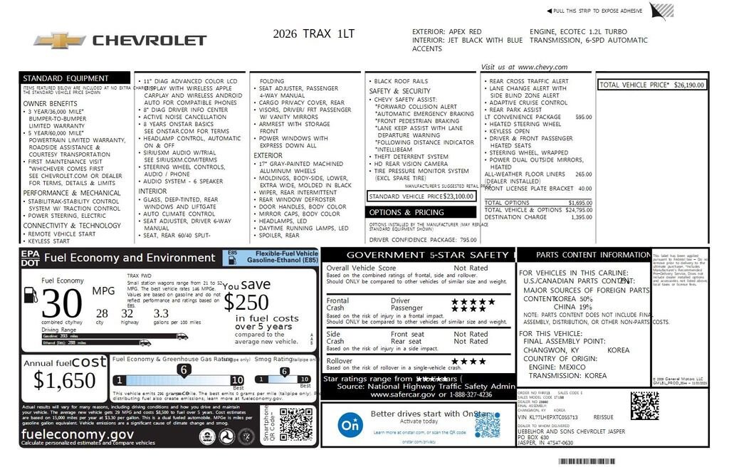 2026 Chevrolet Trax LT We want you to shop confidently for your next used car at The BIG Ford Store, D-Patrick Ford. We are located on Highway 41 and Walnut in Evansville, right next to the Lloyd Expressway. Buy this used vehicle 100% online or in-store. This pre-owned vehicle was put through an extensive inspection before hitting our lot. Because of this, we are able to offer a 3-month/3,000-mile comprehensive limited warranty. You also get our Love It or Return It 5-day, 300-mile Exchange Policy. See our website for more details on both. We also offer extended service plans, vehicle protection plans, and offer a CarFax vehicle history report. *Prices listed do not include a $250 documentation fee, applicable tax, title, tags, license, or $195 service and preparation. All pricing, vehicle information, and features (such as accessories and color) are believed to be accurate, but we do not warrant or guarantee such accuracy. The prices shown above may vary from region to region, and incentives are subject to change. Some offers listed may not be available to all customers. All online sale commitments are subject to confirmation of continued availability of vehicle. Once availability is confirmed, online sale agreement becomes binding upon the parties. If any information found on the website is thought to be erroneous, please verify information with a customer service representative. See dealer for full details. Looking to sell your current vehicle? We buy cars for cash. Every test drive at D-Patrick Ford in Evansville earns $10 to a local charity. Schedule your test drive today! 2-Way Adjustable Front Head Restraints, 3.50 Final Drive Axle Ratio, 4-Way Manual Front Passenger Seat Adjuster, 4-Wheel Disc Brakes, 6 Speakers, 6-Speaker Audio System Feature, 6-Way Manual Driver Seat Adjuster, ABS brakes, Air Conditioning, Alloy wheels, AM/FM radio: SiriusXM, Auto High-beam Headlights, Automatic temperature control, Brake assist, Bumpers: body-color, Cloth/Evotex Seat Trim, Compass, Delay-off headlights, Driver door bin, Driver vanity mirror, Dual front impact airbags, Dual front side impact airbags, Electronic Stability Control, Emergency communication system: OnStar One Essentials, Exterior Parking Camera Rear, Front anti-roll bar, Front Bucket Seats, Front Center Armrest, Front reading lights, Front wheel independent suspension, Fully automatic headlights, Illuminated entry, Low tire pressure warning, Occupant sensing airbag, Outside temperature display, Overhead airbag, Overhead console, Panic alarm, Passenger door bin, Passenger vanity mirror, Power door mirrors, Power steering, Power windows, Premium audio system: Chevrolet Infotainment 3, Radio data system, Radio: AM/FM Stereo Audio System, Rear window defroster, Rear window wiper, Remote keyless entry, Security system, SiriusXM Trial Subscription, Speed control, Split folding rear seat, Spoiler, Steering wheel mounted audio controls, Tachometer, Telescoping steering wheel, Tilt steering wheel, Traction control, Trip computer, Variably intermittent wipers, Wheels: 17 Inch Gray-Painted Machined Aluminum Alloy, Wireless Apple CarPlay/Wireless Android Auto. CARFAX One-Owner. Clean CARFAX. 4D Sport Utility LT 6-Speed Automatic ECOTEC 1.2L Turbo FWD Apex Red CALL TODAY (812) 625-4823 OR SHOP ONLINE AT WWW.DPATRICKFORD.COM.