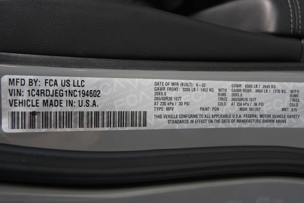 • BLACK NAPPA/AXIS II SEATS W/RHOMBI LOGO,DESTROYER GRAY CLEARCOAT,ENGINE: 3.6L V6 24V VVT UPG I W/ESS (STD),19 HARMAN/KARDON AMPLIFIED SPEAKERS W/SUBWOOFER -inc: 825 Watt Amplifier,TRANSMISSION: 8-SPEED AUTOMATIC (850RE) (STD),3.45 REAR AXLE RATIO (STD),GVWR: 6 500 LBS (STD),QUICK ORDER PACKAGE 2BP -inc: Engine: 3.6L V6 24V VVT UPG I w/ESS Transmission: 8-Speed Automatic (850RE) Anodized Platinum Appearance Package Platinum Mirrors Caps,All Wheel Drive,Tow Hitch,Power Steering,ABS,4-Wheel Disc Brakes,Brake Assist,Aluminum Wheels,Tires - Front Performance,Tires - Rear Performance,Conventional Spare Tire,Sun/Moonroof,Generic Sun/Moonroof,Heated Mirrors,Power Mirror(s),Integrated Turn Signal Mirrors,Rear Defrost,Privacy Glass,Intermittent Wipers,Variable Speed Intermittent Wipers,Rain Sensing Wipers,Rear Spoiler,Remote Trunk Release,Power Liftgate,Power Door Locks,Luggage Rack,Fog Lamps,Daytime Running Lights,Automatic Headlights,LED Headlights,Automatic Highbeams,AM/FM Stereo,Navigation System,Satellite Radio,MP3 Capability,Auxiliary Audio Input,HD Radio,Requires Subscription,Premium Sound System,MP3 Capability,Steering Wheel Audio Controls,Auxiliary Audio Input,Premium Sound System,Bluetooth Connection,Power Driver Seat,Power Passenger Seat,Mirror Memory,Driver Adjustable Lumbar,Seat Memory,Heated Front Seat(s),Cooled Front Seat(s),Power Driver Seat,Driver Adjustable Lumbar,Power Passenger Seat,Passenger Adjustable Lumbar,Bucket Seats,Rear Bucket Seats,Heated Rear Seat(s),Adjustable Steering Wheel,Trip Computer,Power Windows,WiFi Hotspot,3rd Row Seat,Leather Steering Wheel,Heated Steering Wheel,Keyless Entry,Power Door Locks,Keyless Start,Keyless Entry,Power Door Locks,Universal Garage Door Opener,Cruise Control,Adaptive Cruise Control,Climate Control,Multi-Zone A/C,A/C,A/C,Rear A/C,Leather Seats,Bucket Seats,Auto-Dimming Rearview Mirror,Driver Vanity Mirror,Passenger Vanity Mirror,Driver Illuminated Vanity Mirror,Passenger Illuminated Visor Mirror,Floor Mats,Cargo Shade,Smart Device Integration,Mirror Memory,Seat Memory,Remote Engine Start,Keyless Start,Remote Engine Start,Smart Device Integration,Requires Subscription,Navigation System,Power Windows,Power Door Locks,Trip Computer,Immobilizer,Security System,Traction Control,Stability Control,Traction Control,Front Side Air Bag,Blind Spot Monitor,Cross-Traffic Alert,Rear Collision Mitigation,Front Collision Mitigation,Telematics,Requires Subscription,Rear Parking Aid,Lane Departure Warning,Lane Keeping Assist,Lane Departure Warning,Tire Pressure Monitor,Driver Air Bag,Passenger Air Bag,Front Head Air Bag,Rear Head Air Bag,Passenger Air Bag Sensor,Knee Air Bag,Child Safety Locks,Back-Up Camera