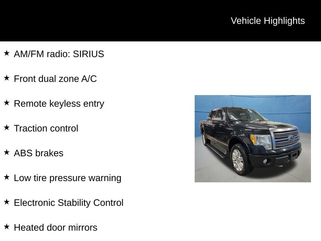 2010 Ford F-150 Platinum VEHICLE SOLD AS-IS. We want you to shop confidently for your next used car at D-Patrick Lebanon Ford and We make it EASY! Buy this used vehicle 100% online or in-store, EASY. Saving time at the dealership, EASY! Financing, EASY! Get pre-approved online or in-store with one of our many lenders, EASY. Finding the car you love at the price you want, EASY! This vehicle’s low price is reflective of its age, condition, and mileage and we do not warrant its mechanical or overall condition. This vehicle is provided with a free to you CarFax vehicle history report. This is an AS-IS vehicle and is not available for additional service plans. *Prices listed do not include a $250 documentation fee, applicable tax, title, tags, license, or $195 service and preparation. All pricing, vehicle information, and features (such as accessories and color) are believed to be accurate, but we do not warrant or guarantee such accuracy. The prices shown above may vary from region to region, and incentives are subject to change. Some offers listed may not be available to all customers. All online sale commitments are subject to confirmation of continued availability of vehicle. Once availability is confirmed, online sale agreement becomes binding upon the parties. If any information found on the website is thought to be erroneous, please verify information with a customer service representative. See dealer for full details. Looking to sell your current vehicle? We buy cars for cash. 4WD, ABS brakes, Alloy wheels, AM/FM radio: SIRIUS, Compass, Electronic Stability Control, Front dual zone A/C, Heated door mirrors, Heated front seats, Illuminated entry, Low tire pressure warning, Remote keyless entry, Traction control. Clean CARFAX. 4D SuperCrew Platinum 6-Speed Automatic Electronic 5.4L V8 EFI 24V FFV 4WD Tuxedo Black CALL US TODAY BEFORE THIS ONE GETS AWAY-- (765) 204-6248 or shop online at www.dpatricklebanonford.com.