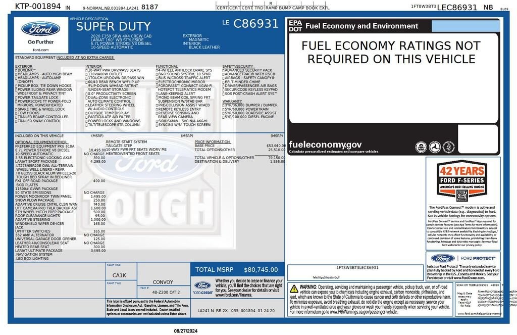 2020 Ford F-350SD Lariat We want you to shop confidently for your next used car at The BIG Ford Store, D-Patrick Ford. We are located on Highway 41 and Walnut in Evansville, right next to the Lloyd Expressway. Buy this used vehicle 100% online or in-store. This pre-owned vehicle was put through an extensive inspection before hitting our lot. Because of this, we are able to offer a 3-month/3,000-mile comprehensive limited warranty. You also get our Love It or Return It 5-day, 300-mile Exchange Policy. See our website for more details on both. We also offer extended service plans, vehicle protection plans, and offer a CarFax vehicle history report. *Prices listed do not include a $250 documentation fee, applicable tax, title, tags, license, or $195 service and preparation. All pricing, vehicle information, and features (such as accessories and color) are believed to be accurate, but we do not warrant or guarantee such accuracy. The prices shown above may vary from region to region, and incentives are subject to change. Some offers listed may not be available to all customers. All online sale commitments are subject to confirmation of continued availability of vehicle. Once availability is confirmed, online sale agreement becomes binding upon the parties. If any information found on the website is thought to be erroneous, please verify information with a customer service representative. See dealer for full details. Looking to sell your current vehicle? We buy cars for cash. Every test drive at D-Patrick Ford in Evansville earns $10 to a local charity. Schedule your test drive today! 4WD, 10 Speakers, 110V/400W Outlet, 3.73 Axle Ratio, 332 Amp Alternators, 4-Wheel Disc Brakes, 5th Wheel/Gooseneck Hitch Prep Package, 6 Ebony Black Angular Running Boards, ABS brakes, Adaptive Cruise Control & Collision Warning, Adaptive Steering, Adjustable pedals, Air Conditioning, Alloy wheels, AM/FM radio: SiriusXM, Ambient Lighting - Fixed Color, Auto High-beam Headlights, Auto-dimming Rear-View mirror, Automatic temperature control, Black Out Surrounds LED Only Headlamps, Body-Color Front & Rear Bumpers, Brake assist, Bumpers: chrome, Compass, Delay-off headlights, Driver door bin, Driver vanity mirror, Dual front impact airbags, Dual front side impact airbags, Easy Entry®/Exit Memory Driver's Seat Feature, Ebony Black Painted Front Grille Bars, Ebony Black Painted Mirror Caps, Electronic Stability Control, Electronic-Locking w/3.55 Axle Ratio, Emergency communication system: SYNC 3 911 Assist, Exterior Parking Camera Rear, Flow-Through Console, Front anti-roll bar, Front Bucket Seats, Front Center Armrest, Front dual zone A/C, Front fog lights, Front Leather Seating Surfaces 40/Console/40, Front reading lights, Fully automatic headlights, FX4 Off-Road Package, Heated door mirrors, Heated Rear Seats, Heated Steering Wheel, Hill Descent Control, Illuminated entry, Intelligent Access w/Push-Button Start, Lariat Sport Appearance Package, Lariat Ultimate Package, Leather steering wheel, LED Box Lighting, LED Roof Clearance Lights, Low tire pressure warning, Memory Power-Adjustable Pedals, Off-Road Specifically Tuned Shock Absorbers, Order Code 618A, Outside temperature display, Overhead airbag, Overhead console, Panic alarm, Passenger door bin, Passenger vanity mirror, Power door mirrors, Power driver seat, Power Heated/Ventilated Driver Seat w/Memory, Power Heated/Ventilated Passenger Seat, Power passenger seat, Power steering, Power Telescoping/Tilt Steering Wheel/Column, Power windows, PowerScope Trailer Tow Mirrors w/Heat, PowerScope Trailer Tow Mirrors w/Memory, Pro Trailer Backup Assist, Radio data system, Radio: B&O System by Bang & Olufsen, Rear Parking Sensors, Rear reading lights, Rear seat center armrest, Rear step bumper, Rear Wheel Well Liners (Pre-Installed), Rear window defroster, Remote keyless entry, Remote Start System, Remote Tailgate Release, Security system, SiriusXM Radio, Snow Plow Prep Package, Speed control, Split folding