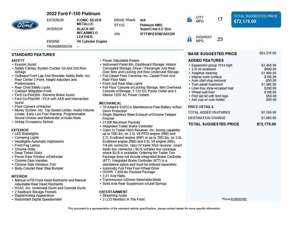 2022 Ford F-150 Platinum Recent Arrival! We want you to shop confidently for your next used car at D-Patrick Boonville Ford and We make it EASY! Buy this used vehicle 100% online or in-store, EASY. Saving time at the dealership, EASY! Financing, EASY! Finding the car you love at the price you want, EASY! This pre-owned vehicle was put through an extensive inspection before hitting our lot. Because of this, we are able to offer a 3-month/3,000-mile comprehensive limited warranty. You also get our Love It or Return It 5-day, 300-mile Exchange Policy. See our website for more details on both. We also offer extended service plans, vehicle protection plans, and offer a CarFax vehicle history report. *Prices listed do not include a $250 documentation fee, applicable tax, title, tags, license, or $195 service and preparation. All pricing, vehicle information, and features (such as accessories and color) are believed to be accurate, but we do not warrant or guarantee such accuracy. The prices shown above may vary from region to region, and incentives are subject to change. Some offers listed may not be available to all customers. All online sale commitments are subject to confirmation of continued availability of vehicle. Once availability is confirmed, online sale agreement becomes binding upon the parties. If any information found on the website is thought to be erroneous, please verify information with a customer service representative. See dealer for full details. Looking to sell your current vehicle? We buy cars for cash. 4WD, 20 Polished Aluminum Wheels, 3.31 Axle Ratio, 4-Wheel Disc Brakes, 8 Speakers, ABS brakes, Adjustable pedals, Air Conditioning, Alloy wheels, AM/FM radio: SiriusXM with 360L, Auto High-beam Headlights, Auto tilt-away steering wheel, Auto-dimming door mirrors, Auto-dimming Rear-View mirror, Automatic temperature control, Brake assist, Bumpers: body-color, Class IV Trailer Hitch Receiver, Compass, Delay-off headlights, Driver door bin, Driver vanity mirror, Dual front impact airbags, Dual front side impact airbags, Electronic Stability Control, Emergency communication system: SYNC 4 911 Assist, Exterior Parking Camera Rear, Front anti-roll bar, Front Bucket Seats, Front Center Armrest, Front dual zone A/C, Front fog lights, Front reading lights, Front wheel independent suspension, Fully automatic headlights, Garage door transmitter, Heated door mirrors, Heated front seats, Heated rear seats, Heated steering wheel, Illuminated entry, Integrated Trailer Brake Controller, Low tire pressure warning, Memory seat, Occupant sensing airbag, Outside temperature display, Overhead airbag, Overhead console, Panic alarm, Passenger door bin, Passenger vanity mirror, Pedal memory, Power door mirrors, Power driver seat, Power passenger seat, Power steering, Power windows, Radio data system, Radio: B&O Sound System by Bang & Olufsen, Rain sensing wipers, Rear reading lights, Rear seat center armrest, Rear step bumper, Rear window defroster, Remote keyless entry, Security system, Speed control, Speed-sensing steering, Split folding rear seat, Steering wheel memory, Steering wheel mounted audio controls, SYNC 4 w/Enhanced Voice Recognition, Tachometer, Telescoping steering wheel, Tilt steering wheel, Traction control, Trip computer, Turn signal indicator mirrors, Variably intermittent wipers, Ventilated front seats, Voltmeter, 4WD. 4D SuperCrew Platinum 10-Speed Automatic 3.5L V6 EcoBoost 4WD Iconic Silver Metallic CALL US TODAY BEFORE THIS ONE GETS AWAY-- (812) 897-5838 or shop online at www.boonvilleford.com.