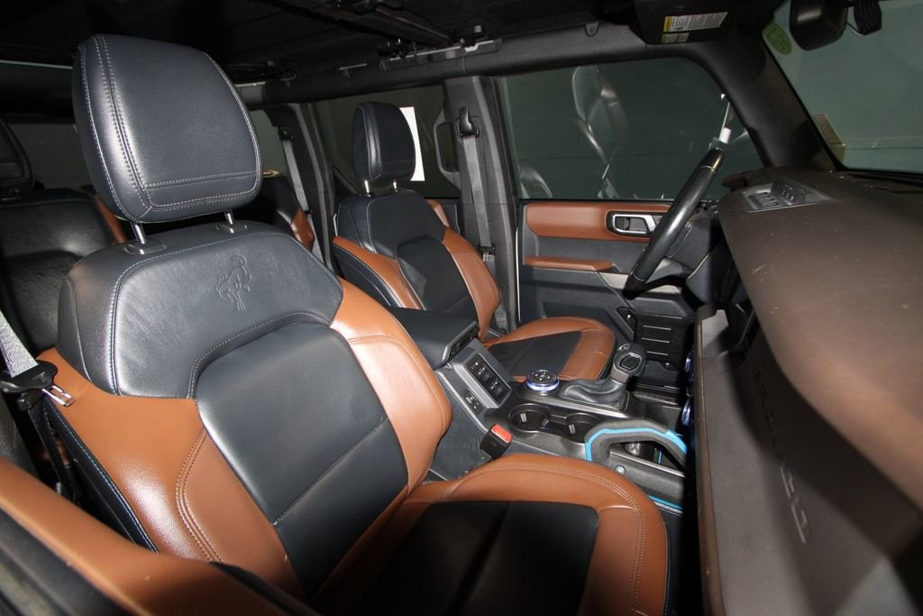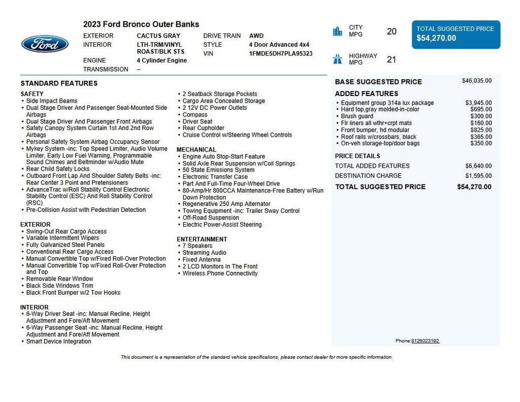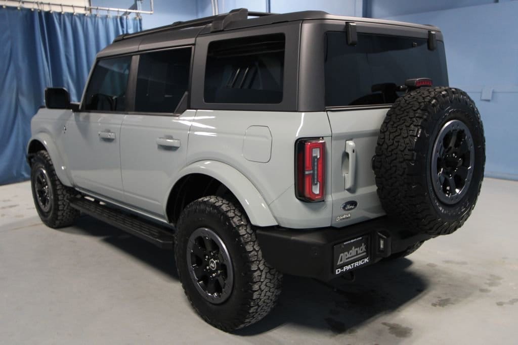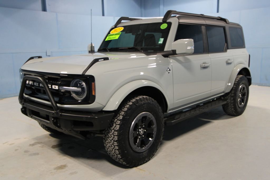 2023 Ford Bronco Outer Banks We want you to shop confidently for your next used car at The BIG Ford Store, D-Patrick Ford. We are located on Highway 41 and Walnut in Evansville, right next to the Lloyd Expressway. Buy this used vehicle 100% online or in-store. This pre-owned vehicle was put through an extensive inspection before hitting our lot. Because of this, we are able to offer a 3-month/3,000-mile comprehensive limited warranty. You also get our Love It or Return It 5-day, 300-mile Exchange Policy. See our website for more details on both. We also offer extended service plans, vehicle protection plans, and offer a CarFax vehicle history report. *Prices listed do not include a $250 documentation fee, applicable tax, title, tags, license, or $195 service and preparation. All pricing, vehicle information, and features (such as accessories and color) are believed to be accurate, but we do not warrant or guarantee such accuracy. The prices shown above may vary from region to region, and incentives are subject to change. Some offers listed may not be available to all customers. All online sale commitments are subject to confirmation of continued availability of vehicle. Once availability is confirmed, online sale agreement becomes binding upon the parties. If any information found on the website is thought to be erroneous, please verify information with a customer service representative. See dealer for full details. Looking to sell your current vehicle? We buy cars for cash. Every test drive at D-Patrick Ford in Evansville earns $10 to a local charity. Schedule your test drive today! 18 Bright Machined Aluminum Wheels, 360-Degree Camera, 4-Wheel Disc Brakes, 4.27 Axle Ratio, 7 Speakers, ABS brakes, Adaptive Cruise Control, Air Conditioning, Alloy wheels, AM/FM radio: SiriusXM with 360L, AM/FM Stereo, Auto High-beam Headlights, Auto-dimming Rear-View mirror, Automatic temperature control, Black Roof Rails w/Crossbars, Brake assist, Brush Guard, Carbonized Gray Molded-In-Color Hard Top, Compass, Connected Built-In Navigation, Connected Navigation, Delay-off headlights, Driver door bin, Driver vanity mirror, Dual front impact airbags, Dual front side impact airbags, Electronic Stability Control, Emergency communication system: 911 Assist, Equipment Group 314A Lux Package, Exterior Parking Camera Rear, Ford Performance Heavy-Duty Modular Front Bumper, Front & Rear Floor Liners, Front anti-roll bar, Front Bucket Seats, Front Center Armrest, Front dual zone A/C, Front fog lights, Front Parking Sensors, Front reading lights, Front Row Top Panels & Door Storage Bags, Front Row Top Panels Storage Bag, Front wheel independent suspension, Fully automatic headlights, Heated door mirrors, Heated front seats, Heated Leather-Trimmed/Vinyl Bucket Seats, Illuminated entry, Integrated roll-over protection, Leather Shift Knob, Low tire pressure warning, Navigation system: Connected Navigation, Occupant sensing airbag, Outside temperature display, Overhead airbag, Overhead console, Panic alarm, Passenger door bin, Passenger vanity mirror, Power door mirrors, Power steering, Power windows, Radio data system, Remote keyless entry, Security system, Sideview Mirrors, SiriusXM Radio w/360L, Speed control, Split folding rear seat, Steering wheel mounted audio controls, SYNC 4, Tachometer, Telescoping steering wheel, Tilt steering wheel, Traction control, Trip computer, Variably intermittent wipers, Voltmeter. Clean CARFAX. 4D Sport Utility Outer Banks 10-Speed Automatic 2.3L EcoBoost I-4 4WD Cactus Gray CALL TODAY (812) 625-4823 OR SHOP ONLINE AT WWW.DPATRICKFORD.COM.