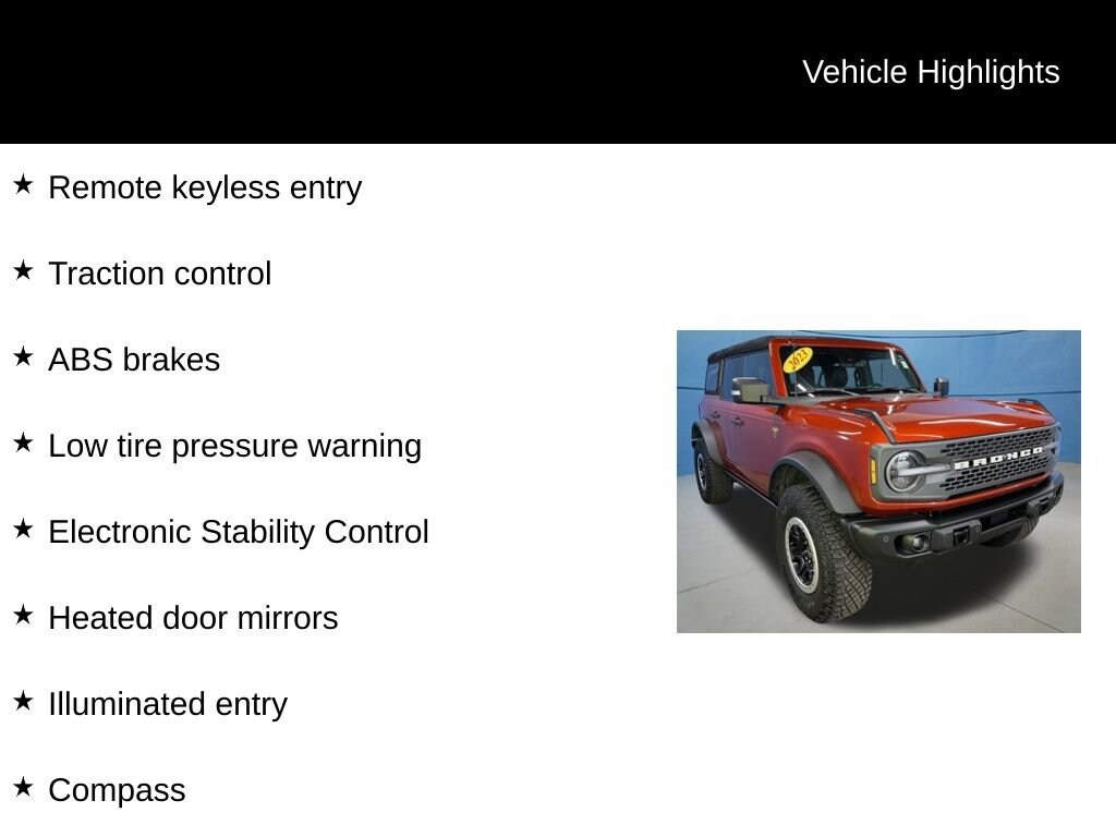 2023 Ford Bronco Badlands We want you to shop confidently for your next used car at D-Patrick Lebanon Ford and We make it EASY! Buy this used vehicle 100% online or in-store, EASY. Saving time at the dealership, EASY! Financing, EASY! Get pre-approved online or in-store with one of our many lenders, EASY. Finding the car you love at the price you want, EASY! This pre-owned vehicle was put through an extensive inspection before hitting our lot. Because of this, we are able to offer a 3-month/3,000-mile comprehensive limited warranty. You also get our Love It or Return It 5-day, 300-mile Exchange Policy. See our website for more details on both. We also offer extended service plans, vehicle protection plans, and offer a free to you CarFax vehicle history report. *Prices listed do not include a $250 documentation fee, applicable tax, title, tags, license, or $195 service and preparation. All pricing, vehicle information, and features (such as accessories and color) are believed to be accurate, but we do not warrant or guarantee such accuracy. The prices shown above may vary from region to region, and incentives are subject to change. Some offers listed may not be available to all customers. All online sale commitments are subject to confirmation of continued availability of vehicle. Once availability is confirmed, online sale agreement becomes binding upon the parties. If any information found on the website is thought to be erroneous, please verify information with a customer service representative. See dealer for full details. Looking to sell your current vehicle? We buy cars for cash. ABS brakes, Compass, Electronic Stability Control, Heated door mirrors, Illuminated entry, Low tire pressure warning, Remote keyless entry, Traction control. Clean CARFAX. 4D Sport Utility Badlands 10-Speed Automatic 2.7L EcoBoost V6 4WD Hot Pepper Red Metallic Tinted Clearcoat CALL US TODAY BEFORE THIS ONE GETS AWAY-- (765) 204-6248 or shop online at www.dpatricklebanonford.com.