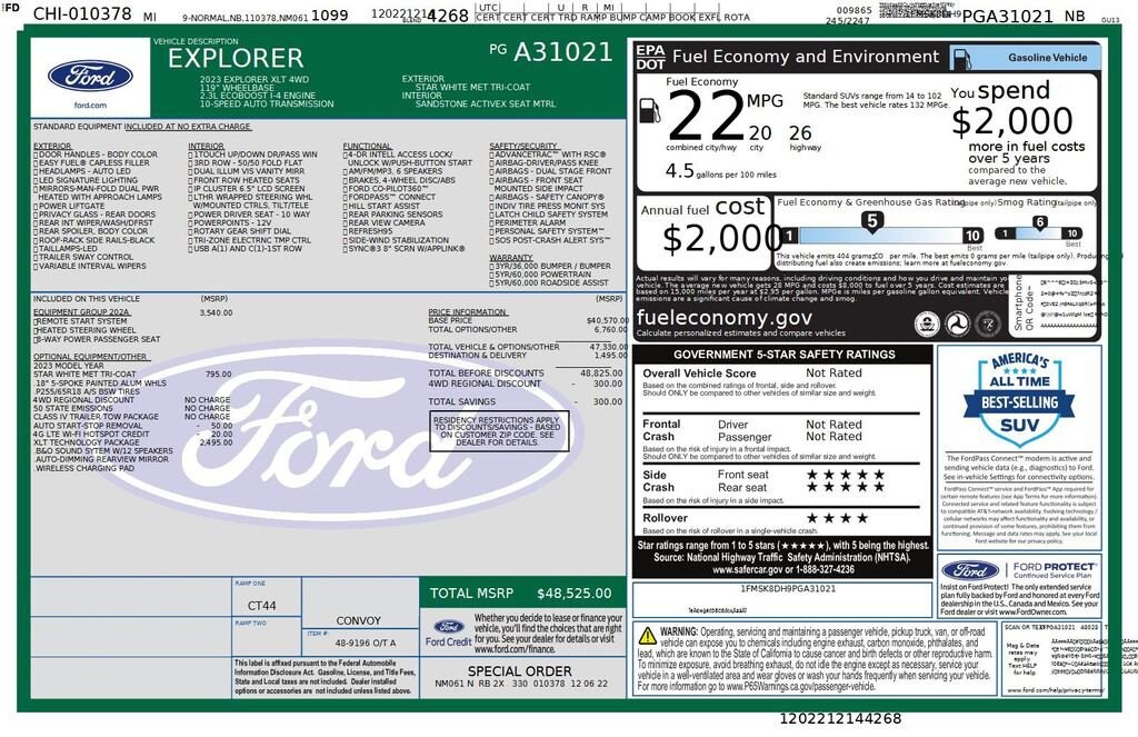 2023 Ford Explorer XLT We want you to shop confidently for your next used car at The BIG Ford Store, D-Patrick Ford. We are located on Highway 41 and Walnut in Evansville, right next to the Lloyd Expressway. Buy this used vehicle 100% online or in-store. This pre-owned vehicle was put through an extensive inspection before hitting our lot. Because of this, we are able to offer a 3-month/3,000-mile comprehensive limited warranty. You also get our Love It or Return It 5-day, 300-mile Exchange Policy. See our website for more details on both. We also offer extended service plans, vehicle protection plans, and offer a CarFax vehicle history report. *Prices listed do not include a $250 documentation fee, applicable tax, title, tags, license, or $195 service and preparation. All pricing, vehicle information, and features (such as accessories and color) are believed to be accurate, but we do not warrant or guarantee such accuracy. The prices shown above may vary from region to region, and incentives are subject to change. Some offers listed may not be available to all customers. All online sale commitments are subject to confirmation of continued availability of vehicle. Once availability is confirmed, online sale agreement becomes binding upon the parties. If any information found on the website is thought to be erroneous, please verify information with a customer service representative. See dealer for full details. Looking to sell your current vehicle? We buy cars for cash. Every test drive at D-Patrick Ford in Evansville earns $10 to a local charity. Schedule your test drive today! 4WD, 3.58 Non-Limited-Slip Rear Axle Ratio, 360-Degree Camera w/Split View, 3rd row seats: bench, 4-Wheel Disc Brakes, 4G LTE Wi-Fi Hotspot Credit, 6 Speakers, ABS brakes, Acoustic-Laminated Front Side Windows, Air Conditioning, Alloy wheels, AM/FM radio: SiriusXM, AM/FM Stereo, Auto High-beam Headlights, Auto Start-Stop Removal (DISC), Auto-Dimming Interior Rear-View Mirror, Automatic temperature control, Brake assist, Bumpers: body-color, Class IV Trailer Tow Package, Compass, Delay-off headlights, Driver door bin, Driver vanity mirror, Dual front impact airbags, Dual front side impact airbags, Electronic Stability Control, Emergency communication system: SYNC 3 911 Assist, Equipment Group 202A, Exterior Parking Camera Rear, FordPass Connect, Four wheel independent suspension, Front anti-roll bar, Front Bucket Seats, Front Center Armrest, Front dual zone A/C, Front Parking Sensors, Front reading lights, Fully automatic headlights, Heated ActiveX Captain's Chairs, Heated door mirrors, Heated front seats, Heated Steering Wheel, Heated Unique Cloth Captain's Chairs, Illuminated entry, Knee airbag, Leather steering wheel, LED Fog Lamps, Low tire pressure warning, Occupant sensing airbag, Outside temperature display, Overhead airbag, Overhead console, Panic alarm, Passenger door bin, Passenger vanity mirror, Power door mirrors, Power driver seat, Power Liftgate, Power passenger seat, Power steering, Power windows, Radio: B&O Sound System by Bang & Olufsen, Rear air conditioning, Rear anti-roll bar, Rear reading lights, Rear window defroster, Rear window wiper, Remote keyless entry, Remote Start System, Roof rack: rails only, SecuriCode Keyless Entry Keypad, Security system, Sideview Mirrors w/Gloss Black Caps, Speed control, Speed-sensing steering, Speed-Sensitive Wipers, Split folding rear seat, Spoiler, Steering wheel mounted audio controls, SYNC 3 Communications & Entertainment System, SYNC 3/Apple CarPlay/Android Auto, Tachometer, Telescoping steering wheel, Tilt steering wheel, Traction control, Trip computer, Universal Garage Door Opener (UGDO), Variably intermittent wipers, Wheels: 18 5-Spoke Silver-Painted Aluminum, Wireless Charging Pad, XLT Technology Package, 4WD. Clean CARFAX. 4D Sport Utility XLT 10-Speed Automatic 2.3L EcoBoost I-4 4WD Star White Metallic Tri-Coat CALL TODAY (812) 625-4823 OR SHOP ONLINE AT WWW.DPATRICKFORD.COM.