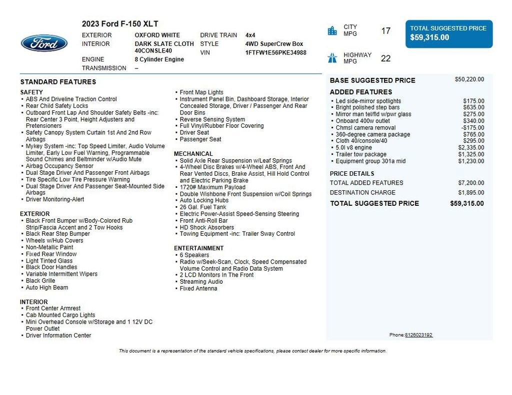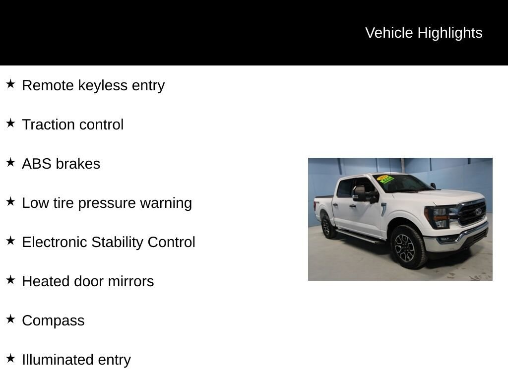 2023 Ford F-150 XLT We want you to shop confidently for your next used car at The BIG Ford Store, D-Patrick Ford. We are located on Highway 41 and Walnut in Evansville, right next to the Lloyd Expressway. Buy this used vehicle 100% online or in-store. This pre-owned vehicle was put through an extensive inspection before hitting our lot. Because of this, we are able to offer a 3-month/3,000-mile comprehensive limited warranty. You also get our Love It or Return It 5-day, 300-mile Exchange Policy. See our website for more details on both. We also offer extended service plans, vehicle protection plans, and offer a CarFax vehicle history report. *Prices listed do not include a $250 documentation fee, applicable tax, title, tags, license, or $195 service and preparation. All pricing, vehicle information, and features (such as accessories and color) are believed to be accurate, but we do not warrant or guarantee such accuracy. The prices shown above may vary from region to region, and incentives are subject to change. Some offers listed may not be available to all customers. All online sale commitments are subject to confirmation of continued availability of vehicle. Once availability is confirmed, online sale agreement becomes binding upon the parties. If any information found on the website is thought to be erroneous, please verify information with a customer service representative. See dealer for full details. Looking to sell your current vehicle? We buy cars for cash. Every test drive at D-Patrick Ford in Evansville earns $10 to a local charity. Schedule your test drive today! 4WD, ABS brakes, Alloy wheels, Compass, Electronic Stability Control, Heated door mirrors, Illuminated entry, Low tire pressure warning, Remote keyless entry, Traction control. 4D SuperCrew XLT 10-Speed Automatic 5.0L V8 4WD Oxford White CALL TODAY (812) 625-4823 OR SHOP ONLINE AT WWW.DPATRICKFORD.COM.