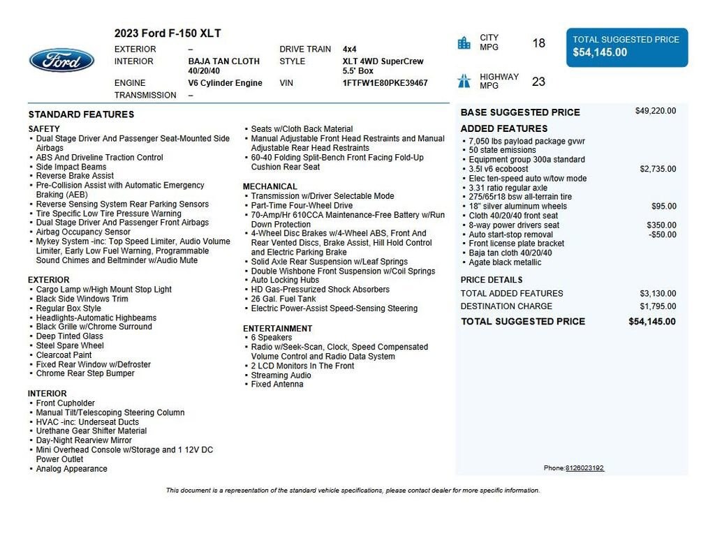 2023 Ford F-150 XLT We want you to shop confidently for your next used car at The BIG Ford Store, D-Patrick Ford. We are located on Highway 41 and Walnut in Evansville, right next to the Lloyd Expressway. Buy this used vehicle 100% online or in-store. This pre-owned vehicle was put through an extensive inspection before hitting our lot. Because of this, we are able to offer a 3-month/3,000-mile comprehensive limited warranty. You also get our Love It or Return It 5-day, 300-mile Exchange Policy. See our website for more details on both. We also offer extended service plans, vehicle protection plans, and offer a CarFax vehicle history report. *Prices listed do not include a $250 documentation fee, applicable tax, title, tags, license, or $195 service and preparation. All pricing, vehicle information, and features (such as accessories and color) are believed to be accurate, but we do not warrant or guarantee such accuracy. The prices shown above may vary from region to region, and incentives are subject to change. Some offers listed may not be available to all customers. All online sale commitments are subject to confirmation of continued availability of vehicle. Once availability is confirmed, online sale agreement becomes binding upon the parties. If any information found on the website is thought to be erroneous, please verify information with a customer service representative. See dealer for full details. Looking to sell your current vehicle? We buy cars for cash. Every test drive at D-Patrick Ford in Evansville earns $10 to a local charity. Schedule your test drive today! 4WD, 18 Silver Painted Aluminum Wheels, 3.31 Axle Ratio, 4-Wheel Disc Brakes, 6 Speakers, 8-Way Power Driver's Seat w/Power Lumbar, ABS brakes, Air Conditioning, Alloy wheels, AM/FM radio, Auto High-beam Headlights, Brake assist, Bumpers: chrome, Cloth 40/20/40 Front Seat, Compass, Delay-off headlights, Driver door bin, Driver vanity mirror, Dual front impact airbags, Dual front side impact airbags, Electronic Stability Control, Emergency communication system: SYNC 4 911 Assist, Exterior Parking Camera Rear, Front anti-roll bar, Front Center Armrest w/Storage, Front fog lights, Front License Plate Bracket, Front reading lights, Front wheel independent suspension, Fully automatic headlights, Heated door mirrors, Illuminated entry, Low tire pressure warning, Occupant sensing airbag, Outside temperature display, Overhead airbag, Overhead console, Panic alarm, Passenger door bin, Passenger vanity mirror, Power door mirrors, Power steering, Power windows, Radio data system, Radio: AM/FM Stereo w/6 Speakers, Rear reading lights, Rear step bumper, Rear window defroster, Remote keyless entry, Security system, Speed control, Speed-sensing steering, Split folding rear seat, Steering wheel mounted audio controls, SYNC 4, Tachometer, Telescoping steering wheel, Tilt steering wheel, Traction control, Trip computer, Variably intermittent wipers, Voltmeter, Wheels: 17 Silver Painted Aluminum, 4WD. CARFAX One-Owner. Clean CARFAX. 4D SuperCrew XLT 10-Speed Automatic 3.5L V6 EcoBoost 4WD Black CALL TODAY (812) 625-4823 OR SHOP ONLINE AT WWW.DPATRICKFORD.COM.