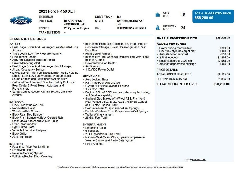 2023 Ford F-150 XLT We want you to shop confidently for your next used car at The BIG Ford Store, D-Patrick Ford. We are located on Highway 41 and Walnut in Evansville, right next to the Lloyd Expressway. Buy this used vehicle 100% online or in-store. This pre-owned vehicle was put through an extensive inspection before hitting our lot. Because of this, we are able to offer a 3-month/3,000-mile comprehensive limited warranty. You also get our Love It or Return It 5-day, 300-mile Exchange Policy. See our website for more details on both. We also offer extended service plans, vehicle protection plans, and offer a CarFax vehicle history report. *Prices listed do not include a $250 documentation fee, applicable tax, title, tags, license, or $195 service and preparation. All pricing, vehicle information, and features (such as accessories and color) are believed to be accurate, but we do not warrant or guarantee such accuracy. The prices shown above may vary from region to region, and incentives are subject to change. Some offers listed may not be available to all customers. All online sale commitments are subject to confirmation of continued availability of vehicle. Once availability is confirmed, online sale agreement becomes binding upon the parties. If any information found on the website is thought to be erroneous, please verify information with a customer service representative. See dealer for full details. Looking to sell your current vehicle? We buy cars for cash. Every test drive at D-Patrick Ford in Evansville earns $10 to a local charity. Schedule your test drive today! 4WD, 3.55 Axle Ratio, 3.73 Axle Ratio, 4-Wheel Disc Brakes, 6 Speakers, ABS brakes, Accent-Color Step Bars, Air Conditioning, Alloy wheels, AM/FM radio, Auto High-beam Headlights, Auto Start-Stop Removal (DISC), Auto-Dimming Rear-View Mirror, Black 2-Bar Style Grille w/Black Surround/Accents, Body-Color Door & Tailgate Handles, Box Side Decals, Brake assist, Bumpers: chrome, Class IV Trailer Hitch Receiver, Cloth 40/20/40 Front Seat, Compass, Delay-off headlights, Driver door bin, Driver vanity mirror, Dual front impact airbags, Dual front side impact airbags, Electronic Stability Control, Emergency communication system: SYNC 4 911 Assist, Equipment Group 302A High, Exterior Parking Camera Rear, Front anti-roll bar, Front Center Armrest w/Storage, Front fog lights, Front reading lights, Front wheel independent suspension, Fully automatic headlights, GVWR: 6,470 lbs Payload Package, Heated door mirrors, Illuminated entry, LED Reflector Headlamps, LED Sideview Mirror Spotlights, Low tire pressure warning, Occupant sensing airbag, Onboard 400W Outlet, Outside temperature display, Overhead airbag, Overhead console, Panic alarm, Passenger door bin, Passenger vanity mirror, Power door mirrors, Power Glass Heated Sideview Mirrors, Power steering, Power windows, Power-Sliding Rear Window, Radio data system, Radio: AM/FM SiriusXM w/360L, Radio: AM/FM Stereo w/6 Speakers, Rear reading lights, Rear step bumper, Rear window defroster, Remote keyless entry, Remote Start System, Security system, Speed control, Speed-sensing steering, Split folding rear seat, Steering wheel mounted audio controls, SYNC 4, SYNC 4 w/Enhanced Voice Recognition, Tachometer, Telescoping steering wheel, Tilt steering wheel, Traction control, Tray Style Floor Liner (47W), Trip computer, Unique Sport Cloth 40/Console/40 Front-Seats, Variably intermittent wipers, Voltmeter, Wheels: 17 Silver Painted Aluminum, Wheels: 18 6-Spoke Machined Aluminum, XLT Sport Appearance Package, Zone Lighting, 4WD. Clean CARFAX. 4D SuperCrew XLT 10-Speed Automatic 2.7L V6 EcoBoost 4WD Agate Black Metallic CALL TODAY (812) 625-4823 OR SHOP ONLINE AT WWW.DPATRICKFORD.COM.