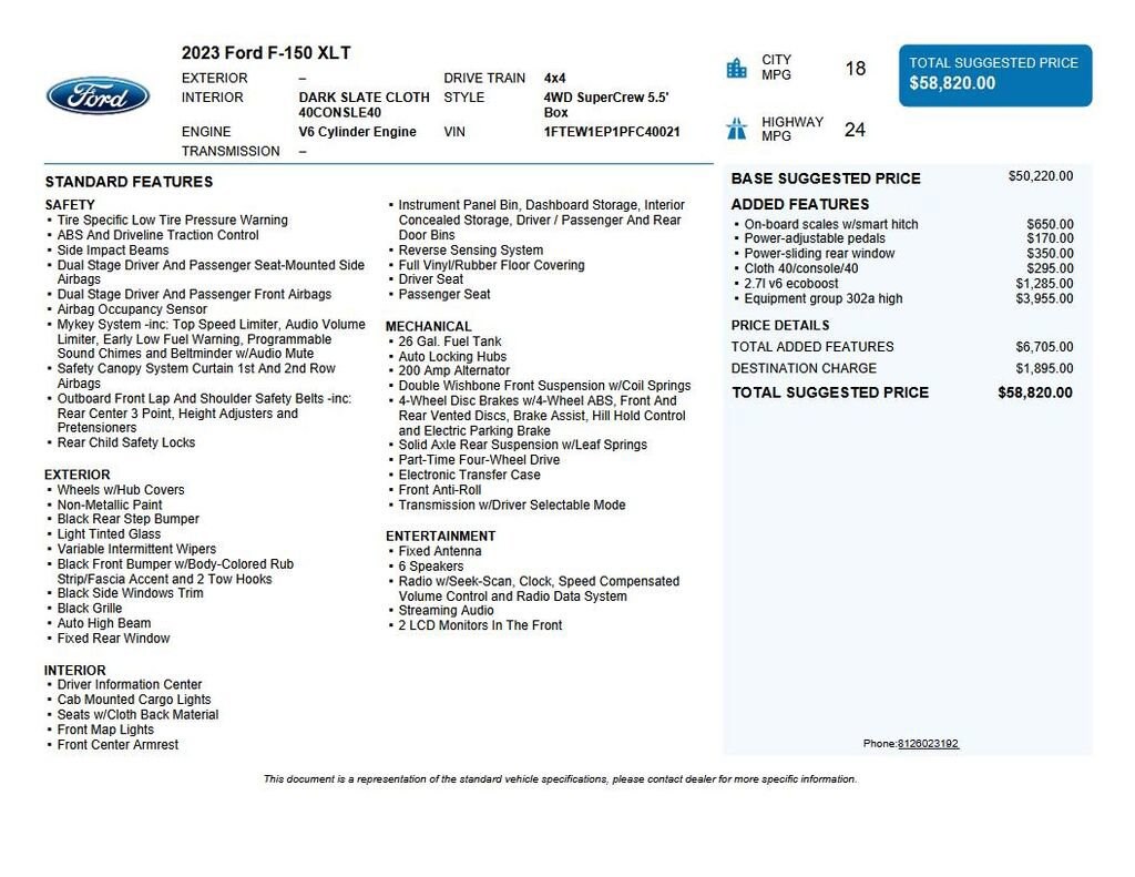 2023 Ford F-150 XLT We want you to shop confidently for your next used car at The BIG Ford Store, D-Patrick Ford. We are located on Highway 41 and Walnut in Evansville, right next to the Lloyd Expressway. Buy this used vehicle 100% online or in-store. This pre-owned vehicle was put through an extensive inspection before hitting our lot. Because of this, we are able to offer a 3-month/3,000-mile comprehensive limited warranty. You also get our Love It or Return It 5-day, 300-mile Exchange Policy. See our website for more details on both. We also offer extended service plans, vehicle protection plans, and offer a CarFax vehicle history report. *Prices listed do not include a $250 documentation fee, applicable tax, title, tags, license, or $195 service and preparation. All pricing, vehicle information, and features (such as accessories and color) are believed to be accurate, but we do not warrant or guarantee such accuracy. The prices shown above may vary from region to region, and incentives are subject to change. Some offers listed may not be available to all customers. All online sale commitments are subject to confirmation of continued availability of vehicle. Once availability is confirmed, online sale agreement becomes binding upon the parties. If any information found on the website is thought to be erroneous, please verify information with a customer service representative. See dealer for full details. Looking to sell your current vehicle? We buy cars for cash. Every test drive at D-Patrick Ford in Evansville earns $10 to a local charity. Schedule your test drive today! 4WD, 3.55 Axle Ratio, 3.73 Axle Ratio, 4-Wheel Disc Brakes, 6 Speakers, ABS brakes, Air Conditioning, Alloy wheels, AM/FM radio, Auto High-beam Headlights, Auto-Dimming Rear-View Mirror, Brake assist, Bumpers: chrome, Class IV Trailer Hitch Receiver, Cloth 40/20/40 Front Seat, Compass, Delay-off headlights, Driver door bin, Driver vanity mirror, Dual front impact airbags, Dual front side impact airbags, Electronic Stability Control, Emergency communication system: SYNC 4 911 Assist, Equipment Group 302A High, Exterior Parking Camera Rear, Front anti-roll bar, Front Center Armrest w/Storage, Front fog lights, Front reading lights, Front wheel independent suspension, Fully automatic headlights, GVWR: 6,470 lbs Payload Package, Heated door mirrors, Illuminated entry, LED Reflector Headlamps, LED Sideview Mirror Spotlights, Low tire pressure warning, Occupant sensing airbag, Onboard 400W Outlet, Onboard Scale w/Smart Hitch, Outside temperature display, Overhead airbag, Overhead console, Panic alarm, Passenger door bin, Passenger vanity mirror, Power door mirrors, Power Glass Heated Sideview Mirrors, Power steering, Power windows, Power-Adjustable Pedals, Power-Sliding Rear Window, Radio data system, Radio: AM/FM Stereo w/6 Speakers, Rear reading lights, Rear step bumper, Rear window defroster, Remote keyless entry, Remote Start System, Security system, Speed control, Speed-sensing steering, Split folding rear seat, Steering wheel mounted audio controls, SYNC 4, SYNC 4 w/Enhanced Voice Recognition, Tachometer, Telescoping steering wheel, Tilt steering wheel, Traction control, Trip computer, Variably intermittent wipers, Voltmeter, Wheels: 17 Silver Painted Aluminum, Zone Lighting, 4WD. Clean CARFAX. 4D SuperCrew XLT 10-Speed Automatic 2.7L V6 EcoBoost 4WD Gray Metallic CALL TODAY (812) 625-4823 OR SHOP ONLINE AT WWW.DPATRICKFORD.COM.