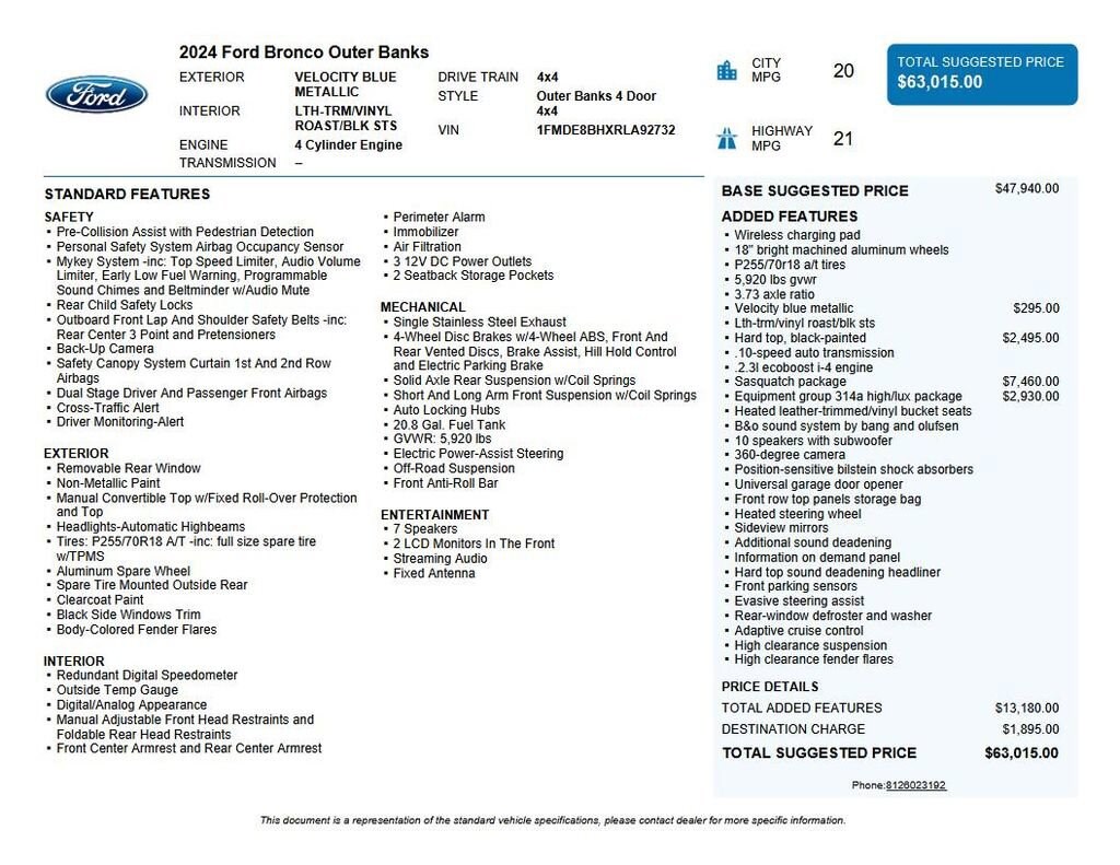2024 Ford Bronco Outer Banks Recent Arrival! We want you to shop confidently for your next used car at The BIG Ford Store, D-Patrick Ford. We are located on Highway 41 and Walnut in Evansville, right next to the Lloyd Expressway. Buy this used vehicle 100% online or in-store. This pre-owned vehicle was put through an extensive inspection before hitting our lot. Because of this, we are able to offer a 3-month/3,000-mile comprehensive limited warranty. You also get our Love It or Return It 5-day, 300-mile Exchange Policy. See our website for more details on both. We also offer extended service plans, vehicle protection plans, and offer a CarFax vehicle history report. *Prices listed do not include a $250 documentation fee, applicable tax, title, tags, license, or $195 service and preparation. All pricing, vehicle information, and features (such as accessories and color) are believed to be accurate, but we do not warrant or guarantee such accuracy. The prices shown above may vary from region to region, and incentives are subject to change. Some offers listed may not be available to all customers. All online sale commitments are subject to confirmation of continued availability of vehicle. Once availability is confirmed, online sale agreement becomes binding upon the parties. If any information found on the website is thought to be erroneous, please verify information with a customer service representative. See dealer for full details. Looking to sell your current vehicle? We buy cars for cash. Every test drive at D-Patrick Ford in Evansville earns $10 to a local charity. Schedule your test drive today! 18 Bright Machined Aluminum Wheels, 4-Wheel Disc Brakes, 7 Speakers, ABS brakes, Air Conditioning, Alloy wheels, AM/FM radio: SiriusXM with 360L, AM/FM Stereo, Auto High-beam Headlights, Auto-dimming Rear-View mirror, Automatic temperature control, Brake assist, Compass, Connected Navigation, Delay-off headlights, Driver door bin, Driver vanity mirror, Dual front impact airbags, Dual front side impact airbags, Electronic Stability Control, Emergency communication system: 911 Assist, Equipment Group 314A High/Lux Package, Exterior Parking Camera Rear, Front anti-roll bar, Front Bucket Seats, Front Center Armrest, Front dual zone A/C, Front fog lights, Front reading lights, Front wheel independent suspension, Fully automatic headlights, Hard Top Sound Deadening Headliner, Heated door mirrors, Heated front seats, Heated Leather-Trimmed/Vinyl Bucket Seats, High Clearance Fender Flares, High Clearance Suspension, Illuminated entry, Integrated roll-over protection, Leather Shift Knob, Low tire pressure warning, Navigation system: Connected Navigation, Occupant sensing airbag, Outside temperature display, Overhead airbag, Overhead console, Panic alarm, Passenger door bin, Passenger vanity mirror, Power door mirrors, Power driver seat, Power passenger seat, Power steering, Power windows, Radio data system, Rear seat center armrest, Remote keyless entry, Sasquatch Package, Security system, Shadow Black Painted Hard Top, SiriusXM Radio w/360L, Speed control, Split folding rear seat, Steering wheel mounted audio controls, SYNC 4, Tachometer, Telescoping steering wheel, Tilt steering wheel, Traction control, Trip computer, Variably intermittent wipers, Voltmeter, Wheels: 17 Black High Gloss-Painted Aluminum. CARFAX One-Owner. Clean CARFAX. 4D Sport Utility Outer Banks 10-Speed Automatic 2.3L EcoBoost I-4 4WD Velocity Blue Metallic CALL TODAY (812) 625-4823 OR SHOP ONLINE AT WWW.DPATRICKFORD.COM.