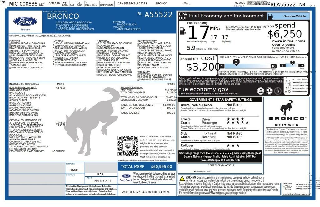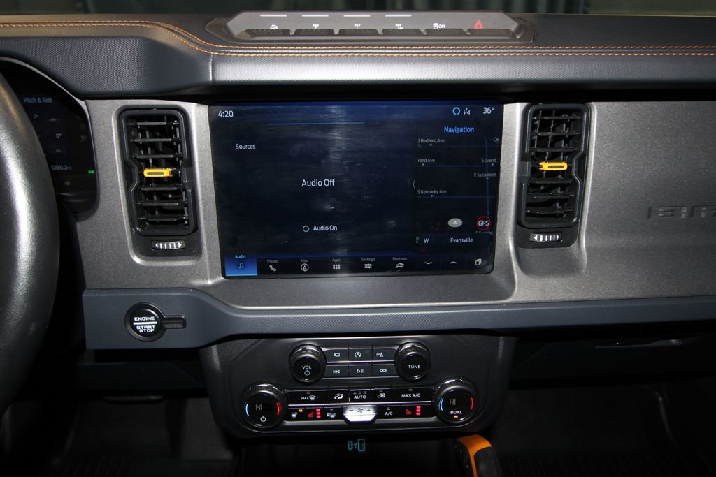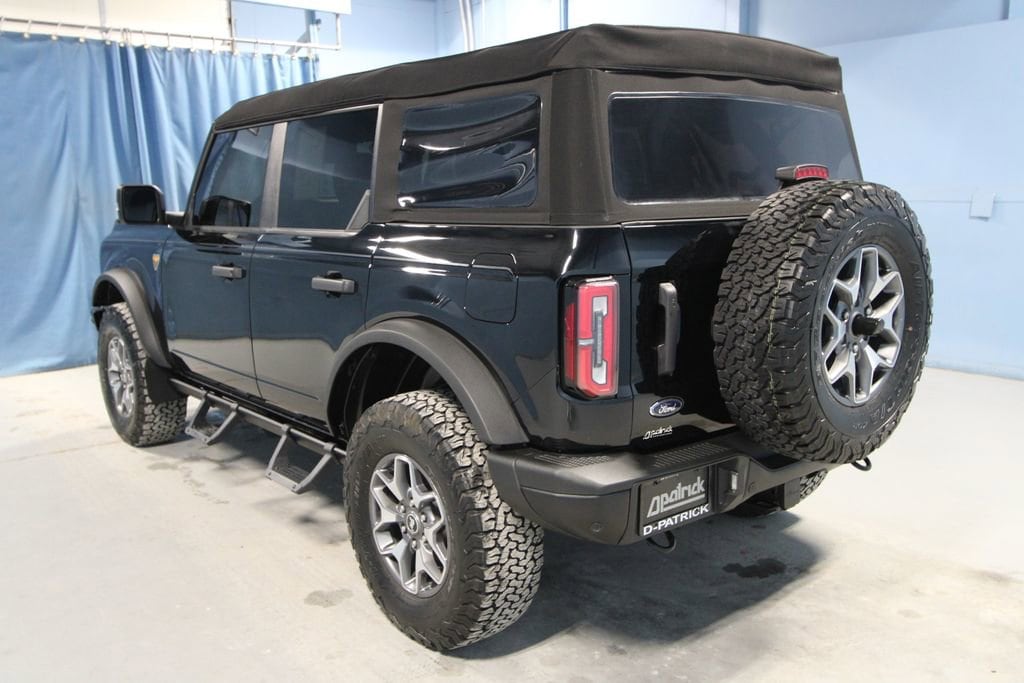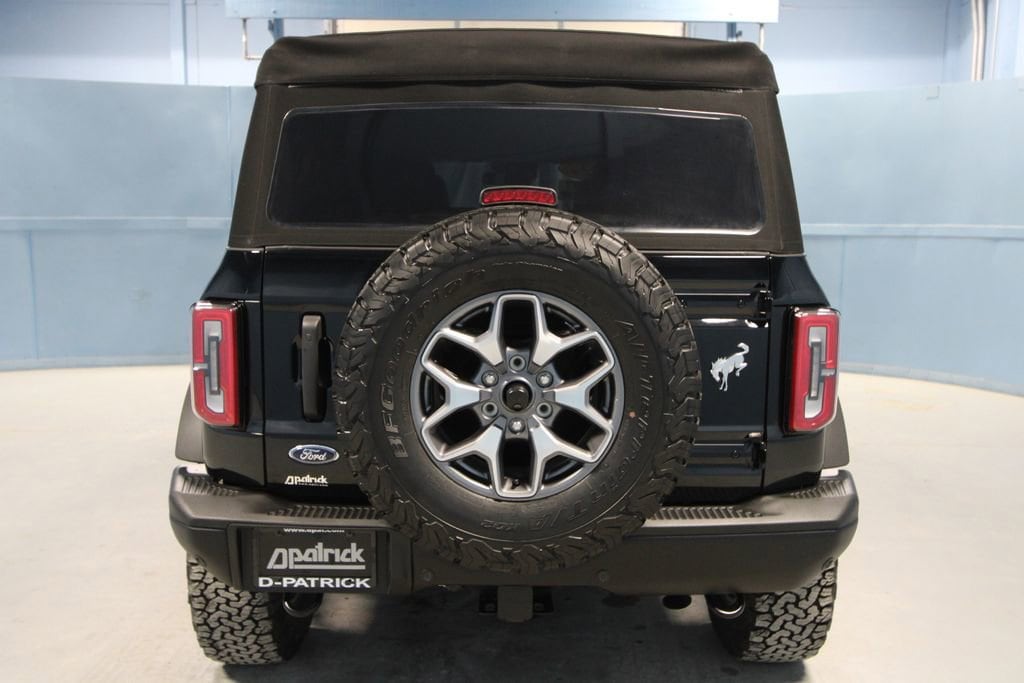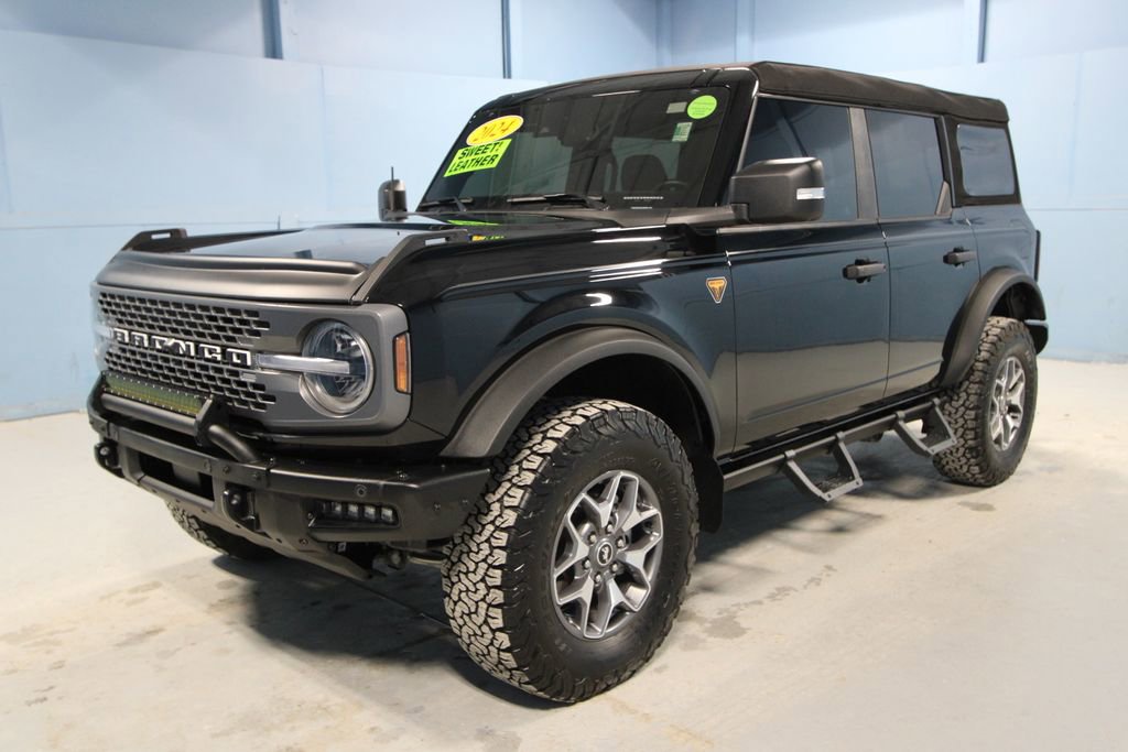 2024 Ford Bronco Badlands We want you to shop confidently for your next used car at The BIG Ford Store, D-Patrick Ford. We are located on Highway 41 and Walnut in Evansville, right next to the Lloyd Expressway. Buy this used vehicle 100% online or in-store. This pre-owned vehicle was put through an extensive inspection before hitting our lot. Because of this, we are able to offer a 3-month/3,000-mile comprehensive limited warranty. You also get our Love It or Return It 5-day, 300-mile Exchange Policy. See our website for more details on both. We also offer extended service plans, vehicle protection plans, and offer a CarFax vehicle history report. *Prices listed do not include a $250 documentation fee, applicable tax, title, tags, license, or $195 service and preparation. All pricing, vehicle information, and features (such as accessories and color) are believed to be accurate, but we do not warrant or guarantee such accuracy. The prices shown above may vary from region to region, and incentives are subject to change. Some offers listed may not be available to all customers. All online sale commitments are subject to confirmation of continued availability of vehicle. Once availability is confirmed, online sale agreement becomes binding upon the parties. If any information found on the website is thought to be erroneous, please verify information with a customer service representative. See dealer for full details. Looking to sell your current vehicle? We buy cars for cash. Every test drive at D-Patrick Ford in Evansville earns $10 to a local charity. Schedule your test drive today! 10 Speakers w/Subwoofer, 2-Door Intelligent Access w/Lock/Unlock, 360-Degree Camera, 4-Wheel Disc Brakes, 7 Speakers, ABS brakes, Adaptive Cruise Control, Additional Sound Deadening, Air Conditioning, Alloy wheels, AM/FM radio: SiriusXM with 360L, AM/FM Stereo, Ambient Footwell Lighting, Auto High-Beam Headlamps, Auto High-beam Headlights, Auto-Dimming Interior Rear-View Mirror, BLIS Blind Spot Information System, Brake assist, Compass, Delay-off headlights, Dr & Pass Illuminated Sliding Visor Vanity Mirrors, Driver door bin, Driver vanity mirror, Dual front impact airbags, Dual front side impact airbags, Dual Smart Charging USB Ports, Dual-Zone Electronic Automatic Temperature Control, Electronic Stability Control, Emergency communication system: 911 Assist, Equipment Group 334A High/Lux Package, Evasive Steering Assist, Exterior Parking Camera Rear, Front anti-roll bar, Front Bucket Seats, Front Center Armrest, Front License Plate Bracket, Front Parking Sensors, Front reading lights, Front Row Heated Seats, Front wheel independent suspension, Fully automatic headlights, Heated door mirrors, Heated Steering Wheel, Illuminated entry, Information on Demand Panel, Integrated roll-over protection, Lane-Keeping System, Leather Shift Knob, Low tire pressure warning, Marine Grade Vinyl Bucket Seats, Occupant sensing airbag, Outside temperature display, Overhead airbag, Overhead console, Panic alarm, Passenger door bin, Passenger vanity mirror, Power door mirrors, Power Outlet - Back Side of Center Floor Console, Power steering, Power windows, Pre-Collision Assist w/Automatic Emergency Braking, Radio data system, Radio: B&O Sound System by Bang & Olufsen, Rear Parking Sensors, Rear-View Camera, Remote keyless entry, Security system, Sideview Mirrors, SiriusXM Radio w/360L, Speed control, Split folding rear seat, Steering wheel mounted audio controls, SYNC 4, Tachometer, Telescoping steering wheel, Tilt steering wheel, Traction control, Trip computer, Universal Garage Door Opener, Variably intermittent wipers, Voltmeter, Wheels: 17 Machined Carbonized Aluminum, Wireless Charging Pad. CARFAX One-Owner. Clean CARFAX. 4D Sport Utility Badlands 10-Speed Automatic 2.7L EcoBoost V6 4WD Shadow Black CALL TODAY (812) 625-4823 OR SHOP ONLINE AT WWW.DPATRICKFORD.COM.