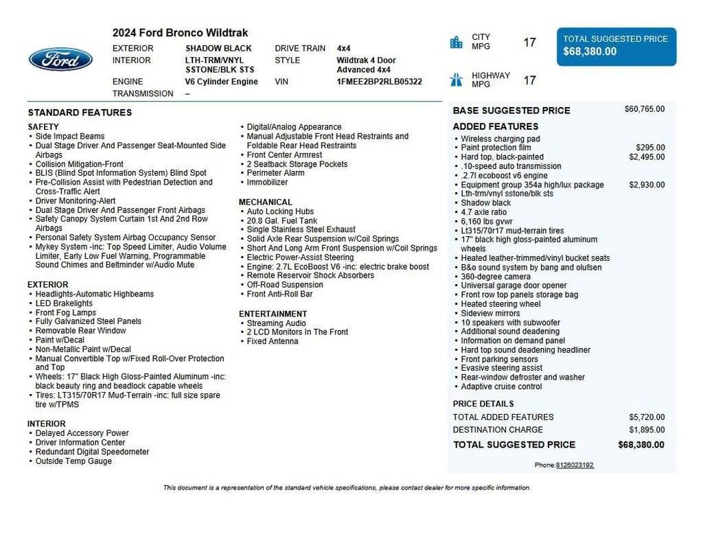 2024 Ford Bronco Wildtrak We want you to shop confidently for your next used car at The BIG Ford Store, D-Patrick Ford. We are located on Highway 41 and Walnut in Evansville, right next to the Lloyd Expressway. Buy this used vehicle 100% online or in-store. This pre-owned vehicle was put through an extensive inspection before hitting our lot. Because of this, we are able to offer a 3-month/3,000-mile comprehensive limited warranty. You also get our Love It or Return It 5-day, 300-mile Exchange Policy. See our website for more details on both. We also offer extended service plans, vehicle protection plans, and offer a CarFax vehicle history report. *Prices listed do not include a $250 documentation fee, applicable tax, title, tags, license, or $195 service and preparation. All pricing, vehicle information, and features (such as accessories and color) are believed to be accurate, but we do not warrant or guarantee such accuracy. The prices shown above may vary from region to region, and incentives are subject to change. Some offers listed may not be available to all customers. All online sale commitments are subject to confirmation of continued availability of vehicle. Once availability is confirmed, online sale agreement becomes binding upon the parties. If any information found on the website is thought to be erroneous, please verify information with a customer service representative. See dealer for full details. Looking to sell your current vehicle? We buy cars for cash. Every test drive at D-Patrick Ford in Evansville earns $10 to a local charity. Schedule your test drive today! 10 Speakers w/Subwoofer, 360-Degree Camera, 4-Wheel Disc Brakes, 4.7 Axle Ratio, 7 Speakers, ABS brakes, Adaptive Cruise Control, Additional Sound Deadening, Air Conditioning, Alloy wheels, AM/FM radio: SiriusXM with 360L, AM/FM Stereo, Auto High-beam Headlights, Auto-dimming Rear-View mirror, Automatic temperature control, Brake assist, Compass, Connected Navigation, Delay-off headlights, Driver door bin, Driver vanity mirror, Dual front impact airbags, Dual front side impact airbags, Electronic Stability Control, Emergency communication system: 911 Assist, Equipment Group 354A High/Lux Package, Evasive Steering Assist, Exterior Parking Camera Rear, Front anti-roll bar, Front Bucket Seats, Front Center Armrest, Front dual zone A/C, Front fog lights, Front Parking Sensors, Front reading lights, Front Row Top Panels Storage Bag, Front wheel independent suspension, Fully automatic headlights, Hard Top Sound Deadening Headliner, Heated door mirrors, Heated front seats, Heated Leather-Trimmed/Vinyl Bucket Seats, Heated Steering Wheel, Illuminated entry, Information on Demand Panel, Integrated roll-over protection, Leather Shift Knob, Low tire pressure warning, Navigation system: Connected Navigation, Occupant sensing airbag, Outside temperature display, Overhead airbag, Overhead console, Panic alarm, Passenger door bin, Passenger vanity mirror, Power door mirrors, Power steering, Power windows, Radio data system, Radio: B&O Sound System by Bang & Olufsen, Rear-Window Defroster & Washer, Remote keyless entry, Security system, Shadow Black Painted Hard Top, Sideview Mirrors, SiriusXM Radio w/360L, Speed control, Split folding rear seat, Steering wheel mounted audio controls, SYNC 4, Tachometer, Telescoping steering wheel, Tilt steering wheel, Traction control, Trip computer, Universal Garage Door Opener, Variably intermittent wipers, Voltmeter, Wheels: 17 Black High Gloss-Painted Aluminum, Wireless Charging Pad. Clean CARFAX. 4D Sport Utility Wildtrak 10-Speed Automatic 2.7L EcoBoost V6 4WD Shadow Black CALL TODAY (812) 625-4823 OR SHOP ONLINE AT WWW.DPATRICKFORD.COM.