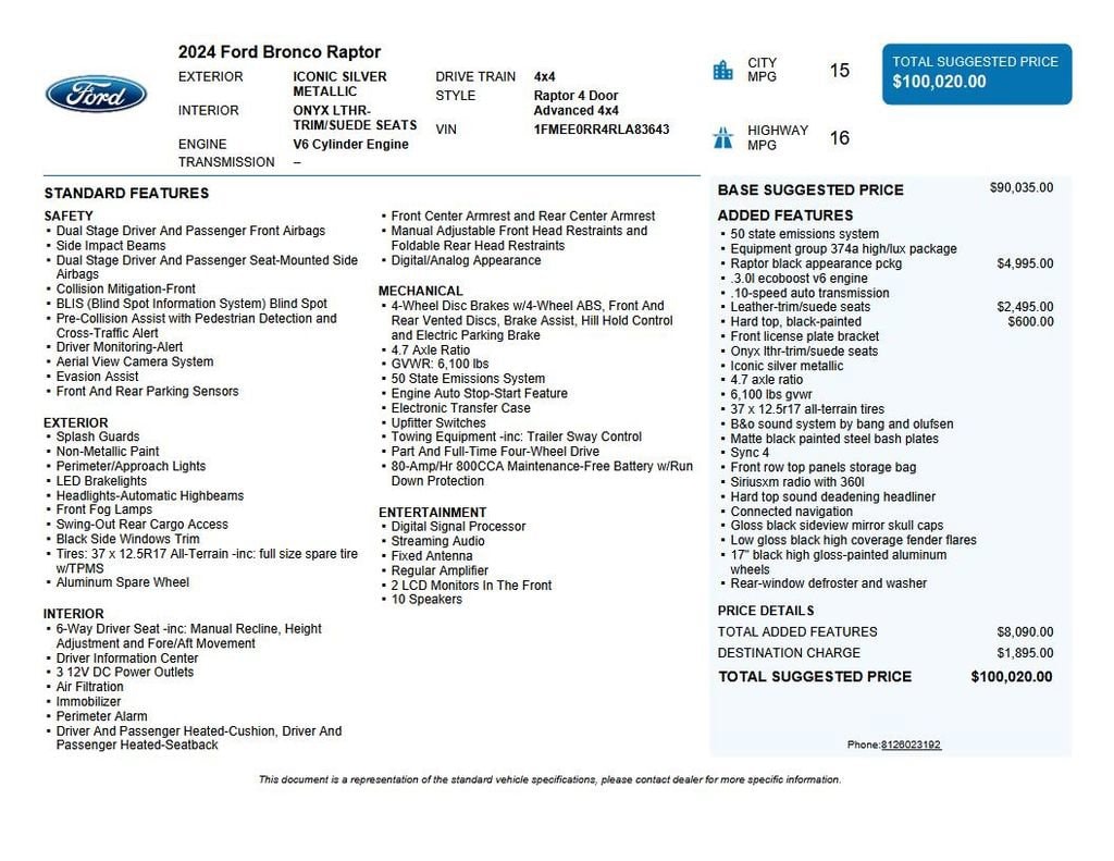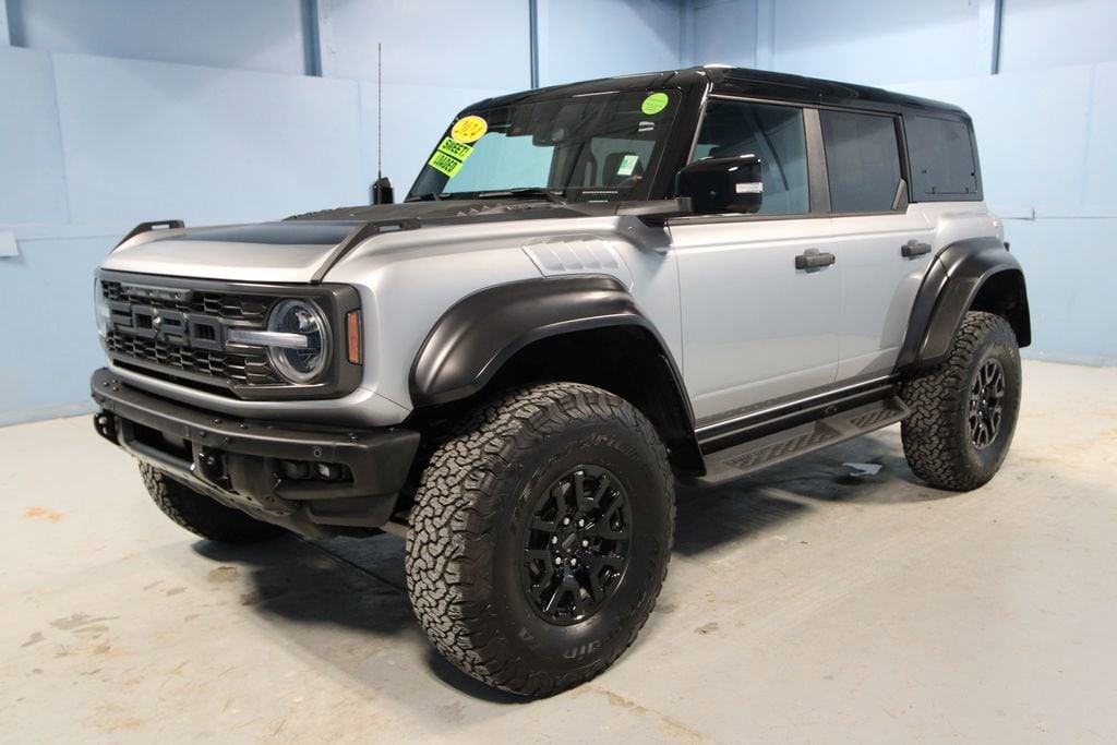 2024 Ford Bronco Raptor Recent Arrival! We want you to shop confidently for your next used car at D-Patrick Boonville Ford and We make it EASY! Buy this used vehicle 100% online or in-store, EASY. Saving time at the dealership, EASY! Financing, EASY! Finding the car you love at the price you want, EASY! This pre-owned vehicle was put through an extensive inspection before hitting our lot. Because of this, we are able to offer a 3-month/3,000-mile comprehensive limited warranty. You also get our Love It or Return It 5-day, 300-mile Exchange Policy. See our website for more details on both. We also offer extended service plans, vehicle protection plans, and offer a CarFax vehicle history report. *Prices listed do not include a $250 documentation fee, applicable tax, title, tags, license, or $195 service and preparation. All pricing, vehicle information, and features (such as accessories and color) are believed to be accurate, but we do not warrant or guarantee such accuracy. The prices shown above may vary from region to region, and incentives are subject to change. Some offers listed may not be available to all customers. All online sale commitments are subject to confirmation of continued availability of vehicle. Once availability is confirmed, online sale agreement becomes binding upon the parties. If any information found on the website is thought to be erroneous, please verify information with a customer service representative. See dealer for full details. Looking to sell your current vehicle? We buy cars for cash. 10 Speakers, 4-Wheel Disc Brakes, 4.7 Axle Ratio, ABS brakes, Air Conditioning, Alloy wheels, AM/FM radio: SiriusXM with 360L, Auto High-beam Headlights, Auto-dimming Rear-View mirror, Automatic temperature control, Brake assist, Compass, Connected Navigation, Convertible HardTop, Convertible roof lining, Delay-off headlights, Driver door bin, Driver vanity mirror, Dual front impact airbags, Dual front side impact airbags, Electronic Stability Control, Emergency communication system: 911 Assist, Equipment Group 374A High/Lux Package, Exterior Parking Camera Rear, Front anti-roll bar, Front Bucket Seats, Front Center Armrest, Front dual zone A/C, Front fog lights, Front License Plate Bracket, Front reading lights, Front Row Top Panels Storage Bag, Front wheel independent suspension, Fully automatic headlights, Garage door transmitter, Glass rear window, Gloss Black Sideview Mirror Skull Caps, Hard Top Sound Deadening Headliner, Heated door mirrors, Heated front seats, Heated steering wheel, Illuminated entry, Integrated roll-over protection, Leather Shift Knob, Low Gloss Black High Coverage Fender Flares, Low tire pressure warning, Marine Grade Vinyl Bucket Seats, Navigation system: Connected Navigation, Occupant sensing airbag, Outside temperature display, Overhead airbag, Overhead console, Panic alarm, Passenger door bin, Passenger vanity mirror, Power door mirrors, Power steering, Power windows, Radio data system, Radio: B&O Sound System by Bang & Olufsen, Raptor Black Appearance Package, Rear anti-roll bar, Rear seat center armrest, Rear window defroster, Rear window wiper, Rear-Window Defroster & Washer, Remote keyless entry, Security system, Shadow Black Painted Hard Top, SiriusXM Radio w/360L, Speed control, Split folding rear seat, Steering wheel mounted audio controls, SYNC 4, Tachometer, Telescoping steering wheel, Tilt steering wheel, Traction control, Trip computer, Turn signal indicator mirrors, Variably intermittent wipers, Voltmeter, Wheels: 17 Black High Gloss-Painted Aluminum. CARFAX One-Owner. 4D Sport Utility Raptor 10-Speed Automatic 3.0L EcoBoost V6 4WD Iconic Silver Metallic CALL US TODAY BEFORE THIS ONE GETS AWAY-- (812) 897-5838 or shop online at www.boonvilleford.com.