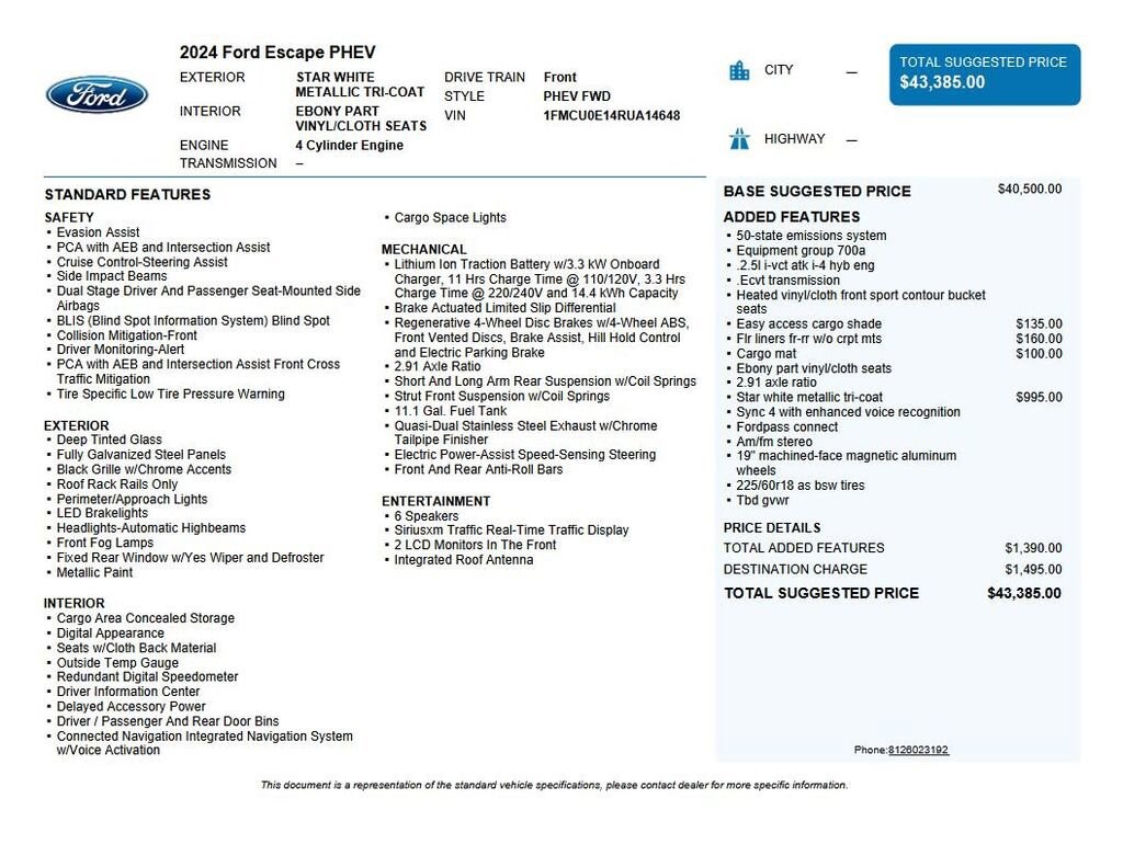 2024 Ford Escape Plug-In Hybrid Base Recent Arrival! We want you to shop confidently for your next used car at The BIG Ford Store, D-Patrick Ford. We are located on Highway 41 and Walnut in Evansville, right next to the Lloyd Expressway. Buy this used vehicle 100% online or in-store. This pre-owned vehicle was put through an extensive inspection before hitting our lot. Because of this, we are able to offer a 3-month/3,000-mile comprehensive limited warranty. You also get our Love It or Return It 5-day, 300-mile Exchange Policy. See our website for more details on both. We also offer extended service plans, vehicle protection plans, and offer a CarFax vehicle history report. *Prices listed do not include a $250 documentation fee, applicable tax, title, tags, license, or $195 service and preparation. All pricing, vehicle information, and features (such as accessories and color) are believed to be accurate, but we do not warrant or guarantee such accuracy. The prices shown above may vary from region to region, and incentives are subject to change. Some offers listed may not be available to all customers. All online sale commitments are subject to confirmation of continued availability of vehicle. Once availability is confirmed, online sale agreement becomes binding upon the parties. If any information found on the website is thought to be erroneous, please verify information with a customer service representative. See dealer for full details. Looking to sell your current vehicle? We buy cars for cash. Every test drive at D-Patrick Ford in Evansville earns $10 to a local charity. Schedule your test drive today! 2.5L iVCT, 2.91 Axle Ratio, 4-Wheel Disc Brakes, 6 Speakers, ABS brakes, Air Conditioning, Alloy wheels, AM/FM radio: SiriusXM, AM/FM Stereo, Auto High-beam Headlights, Automatic temperature control, Brake assist, Bumpers: body-color, Cargo Mat, Compass, Delay-off headlights, Driver door bin, Driver vanity mirror, Dual front impact airbags, Dual front side impact airbags, Easy Access Cargo Shade, Electronic Stability Control, Emergency communication system: SYNC 4 911 Assist, Equipment Group 700A, Exterior Parking Camera Rear, FordPass Connect, Four wheel independent suspension, Front & Rear Floor Liners w/o Carpet Mats, Front anti-roll bar, Front Bucket Seats, Front Center Armrest, Front dual zone A/C, Front fog lights, Front reading lights, Fully automatic headlights, Heated door mirrors, Heated front seats, Heated steering wheel, Heated Vinyl/Cloth Front Sport Contour Bucket Seats, Illuminated entry, Knee airbag, Low tire pressure warning, Navigation system: Connected Navigation, Occupant sensing airbag, Outside temperature display, Overhead airbag, Overhead console, Panic alarm, Passenger door bin, Passenger vanity mirror, Power door mirrors, Power driver seat, Power Liftgate, Power steering, Power windows, Radio data system, Rear anti-roll bar, Rear reading lights, Rear seat center armrest, Rear window defroster, Rear window wiper, Remote keyless entry, Roof rack: rails only, Speed control, Speed-sensing steering, Speed-Sensitive Wipers, Split folding rear seat, Spoiler, Steering wheel mounted audio controls, SYNC 4 w/Enhanced Voice Recognition, Telescoping steering wheel, Tilt steering wheel, Traction control, Trip computer, Variably intermittent wipers, Wheels: 19 Machined-Face Magnetic Aluminum, 2.5L iVCT. CARFAX One-Owner. 4D Sport Utility eCVT 2.5L iVCT FWD Star White Metallic Tri-Coat CALL TODAY (812) 625-4823 OR SHOP ONLINE AT WWW.DPATRICKFORD.COM.