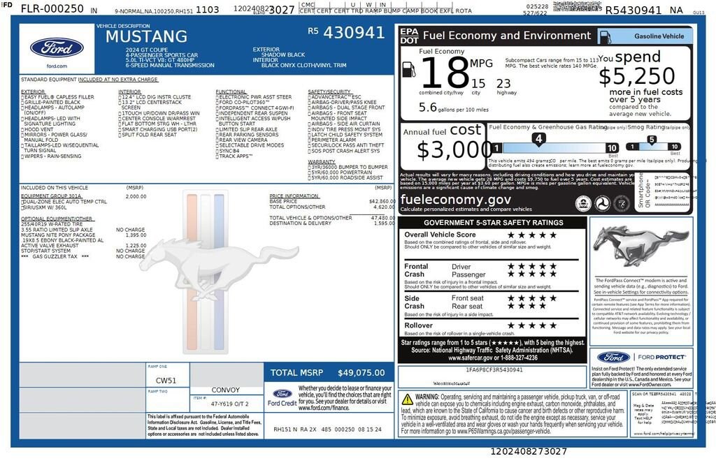 2024 Ford Mustang GT We want you to shop confidently for your next used car at The BIG Ford Store, D-Patrick Ford. We are located on Highway 41 and Walnut in Evansville, right next to the Lloyd Expressway. Buy this used vehicle 100% online or in-store. This pre-owned vehicle was put through an extensive inspection before hitting our lot. Because of this, we are able to offer a 3-month/3,000-mile comprehensive limited warranty. You also get our Love It or Return It 5-day, 300-mile Exchange Policy. See our website for more details on both. We also offer extended service plans, vehicle protection plans, and offer a CarFax vehicle history report. *Prices listed do not include a $250 documentation fee, applicable tax, title, tags, license, or $195 service and preparation. All pricing, vehicle information, and features (such as accessories and color) are believed to be accurate, but we do not warrant or guarantee such accuracy. The prices shown above may vary from region to region, and incentives are subject to change. Some offers listed may not be available to all customers. All online sale commitments are subject to confirmation of continued availability of vehicle. Once availability is confirmed, online sale agreement becomes binding upon the parties. If any information found on the website is thought to be erroneous, please verify information with a customer service representative. See dealer for full details. Looking to sell your current vehicle? We buy cars for cash. Every test drive at D-Patrick Ford in Evansville earns $10 to a local charity. Schedule your test drive today! 4-Wheel Disc Brakes, 6 Speakers, 9-Speaker Stereo System, ABS brakes, Active Valve Performance Exhaust, Air Conditioning, Alloy wheels, AM/FM radio, AM/FM Stereo, Ambient Lighting w/MyColor, Auto High-beam Headlights, Automatic temperature control, Black GT Pony Badges, Black Mirror Caps, Brake assist, Bumpers: body-color, Cloth Bucket Seats, Cloth/Vinyl Heated Bucket Seats, Compass, Delay-off headlights, Driver door bin, Driver vanity mirror, Dual front impact airbags, Dual front side impact airbags, Dual-Zone Electronic Automatic Temperature Control, Electronic Stability Control, Emergency communication system: 911 Assist, Equipment Group 301A High Package, Exterior Parking Camera Rear, Four wheel independent suspension, Front anti-roll bar, Front Bucket Seats, Front Center Armrest, Front reading lights, Fully automatic headlights, Headlamps w/Black Bezels, Illuminated entry, Knee airbag, Leather Shift Knob, Leather steering wheel, Low tire pressure warning, Mustang Nite Pony Package, Occupant sensing airbag, Outside temperature display, Overhead airbag, Overhead console, Painted Black Roof, Panic alarm, Passenger door bin, Passenger vanity mirror, Power door mirrors, Power steering, Power windows, Radio data system, Rain sensing wipers, Rear anti-roll bar, Rear Parking Sensors, Rear window defroster, Remote keyless entry, SiriusXM w/360L & HD Radio, Speed control, Speed-sensing steering, Speed-Sensitive Wipers, Split folding rear seat, Spoiler, Sport steering wheel, Start/Stop System (DISC), Steering wheel mounted audio controls, SYNC 4.0 QNX, Tachometer, Telescoping steering wheel, Tilt steering wheel, Traction control, Trip computer, Variably intermittent wipers, Voltmeter, Wheels: 18 x 8.5 Ebony Black Painted Aluminum. CARFAX One-Owner. Clean CARFAX. 2D Coupe GT 6-Speed Manual 5.0L V8 Ti-VCT RWD Shadow Black CALL TODAY (812) 625-4823 OR SHOP ONLINE AT WWW.DPATRICKFORD.COM.