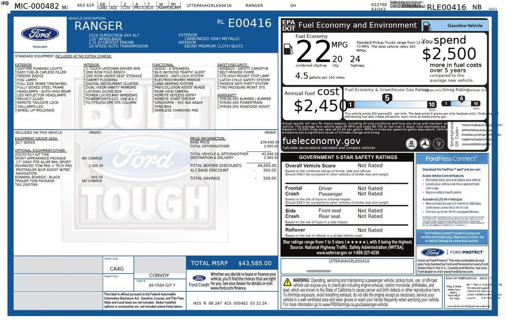 2024 Ford Ranger XLT We want you to shop confidently for your next used car at The BIG Ford Store, D-Patrick Ford. We are located on Highway 41 and Walnut in Evansville, right next to the Lloyd Expressway. Buy this used vehicle 100% online or in-store. This pre-owned vehicle was put through an extensive inspection before hitting our lot. Because of this, we are able to offer a 3-month/3,000-mile comprehensive limited warranty. You also get our Love It or Return It 5-day, 300-mile Exchange Policy. See our website for more details on both. We also offer extended service plans, vehicle protection plans, and offer a CarFax vehicle history report. *Prices listed do not include a $250 documentation fee, applicable tax, title, tags, license, or $195 service and preparation. All pricing, vehicle information, and features (such as accessories and color) are believed to be accurate, but we do not warrant or guarantee such accuracy. The prices shown above may vary from region to region, and incentives are subject to change. Some offers listed may not be available to all customers. All online sale commitments are subject to confirmation of continued availability of vehicle. Once availability is confirmed, online sale agreement becomes binding upon the parties. If any information found on the website is thought to be erroneous, please verify information with a customer service representative. See dealer for full details. Looking to sell your current vehicle? We buy cars for cash. Every test drive at D-Patrick Ford in Evansville earns $10 to a local charity. Schedule your test drive today! 4WD, 360-Degree Camera, 4-Wheel Disc Brakes, 6 Speakers, ABS brakes, Adaptive Cruise Control, Advanced Towing Package Plus Technology Package, Air Conditioning, Alloy wheels, AM/FM radio: SiriusXM, AM/FM Stereo, Auto High-beam Headlights, Auto-dimming Rear-View mirror, Black Running Boards, Brake assist, Class IV Trailer Hitch Receiver, Compass, Connected Built-In Navigation, Delay-off headlights, Driver door bin, Driver vanity mirror, Dual front impact airbags, Dual front side impact airbags, Electronic Stability Control, Emergency communication system: SYNC 4 911 Assist, Enhanced Active Park Assist, Equipment Group 300A Standard, Front anti-roll bar, Front Bucket Seats, Front Center Armrest, Front fog lights, Front Parking Sensors, Front reading lights, Front wheel independent suspension, Fully automatic headlights, Gray Painted Center Bar & Grille Surround, Gray Painted Front Fascia & Rear Bumper, Gray Painted Wheel Lip Molding, Illuminated entry, Leather Shift Knob, Low tire pressure warning, Navigation system: Connected Navigation, Occupant sensing airbag, Outside temperature display, Overhead airbag, Overhead console, Panic alarm, Passenger door bin, Passenger vanity mirror, Power door mirrors, Power steering, Power windows, Premium Cloth Front Bucket Seats, Pro Trailer Backup Assist, Rear reading lights, Rear seat center armrest, Rear step bumper, Rear window defroster, Remote keyless entry, Reverse Park Aid w/Trailer Guidance, Security system, SiriusXM Satellite Radio, Speed control, Speed-sensing steering, Sport Appearance Package, Sport Box Decal, Steering wheel mounted audio controls, SYNC 4A w/Connected Navigation, Telescoping steering wheel, Tilt steering wheel, Traction control, Trailer Brake Controller, Trailer Tow Package, Trip computer, Variably intermittent wipers, Voltmeter, Wheels: 17 Gray-Painted Aluminum, 4WD. CARFAX One-Owner. Clean CARFAX. 4D Crew Cab XLT 10-Speed Automatic EcoBoost 2.3L I4 GTDi DOHC Turbocharged VCT 4WD Gray Metallic CALL TODAY (812) 625-4823 OR SHOP ONLINE AT WWW.DPATRICKFORD.COM.