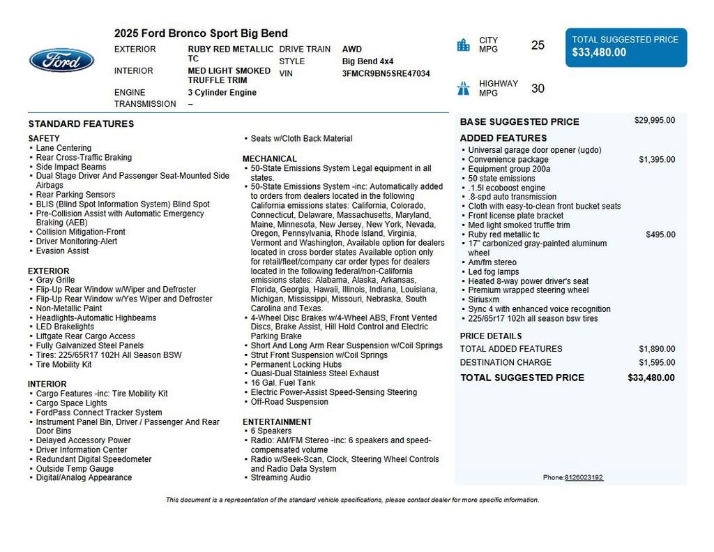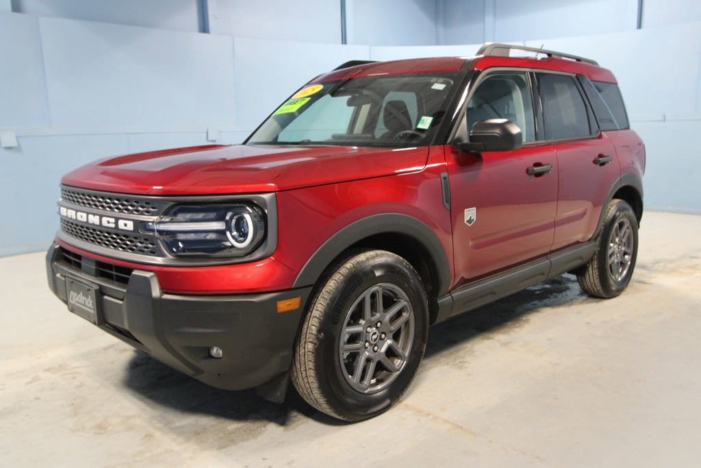 2025 Ford Bronco Sport Big Bend We want you to shop confidently for your next used car at The BIG Ford Store, D-Patrick Ford. We are located on Highway 41 and Walnut in Evansville, right next to the Lloyd Expressway. Buy this used vehicle 100% online or in-store. This pre-owned vehicle was put through an extensive inspection before hitting our lot. Because of this, we are able to offer a 3-month/3,000-mile comprehensive limited warranty. You also get our Love It or Return It 5-day, 300-mile Exchange Policy. See our website for more details on both. We also offer extended service plans, vehicle protection plans, and offer a CarFax vehicle history report. *Prices listed do not include a $250 documentation fee, applicable tax, title, tags, license, or $195 service and preparation. All pricing, vehicle information, and features (such as accessories and color) are believed to be accurate, but we do not warrant or guarantee such accuracy. The prices shown above may vary from region to region, and incentives are subject to change. Some offers listed may not be available to all customers. All online sale commitments are subject to confirmation of continued availability of vehicle. Once availability is confirmed, online sale agreement becomes binding upon the parties. If any information found on the website is thought to be erroneous, please verify information with a customer service representative. See dealer for full details. Looking to sell your current vehicle? We buy cars for cash. Every test drive at D-Patrick Ford in Evansville earns $10 to a local charity. Schedule your test drive today! 4-Wheel Disc Brakes, 6 Speakers, ABS brakes, Air Conditioning, Alloy wheels, AM/FM radio: SiriusXM, AM/FM Stereo, Auto High-beam Headlights, Automatic temperature control, Brake assist, Cloth w/Easy-to-Clean Front Bucket Seats, Compass, Convenience Package, Delay-off headlights, Driver door bin, Driver vanity mirror, Dual front impact airbags, Dual front side impact airbags, Electronic Stability Control, Emergency communication system: SYNC 4 911 Assist, Equipment Group 200A, Four wheel independent suspension, Front anti-roll bar, Front Bucket Seats, Front Center Armrest, Front Driver/Passenger Seat Back Map Pockets, Front License Plate Bracket, Front reading lights, Fully automatic headlights, Heated 8-Way Power Driver's Seat, Heated door mirrors, Illuminated entry, Knee airbag, LED Fog Lamps, Low tire pressure warning, Occupant sensing airbag, Outside temperature display, Overhead airbag, Overhead console, Panic alarm, Passenger door bin, Passenger vanity mirror, Power door mirrors, Power steering, Power windows, Premium Wrapped Steering Wheel, Radio data system, Rear anti-roll bar, Rear Parking Sensors, Rear reading lights, Rear seat center armrest, Rear window defroster, Rear window wiper, Remote keyless entry, Security system, SiriusXM, Speed control, Speed-sensing steering, Speed-Sensitive Wipers, Split folding rear seat, Steering wheel mounted audio controls, SYNC 4 w/Enhanced Voice Recognition, Tachometer, Telescoping steering wheel, Tilt steering wheel, Traction control, Trip computer, Universal Garage Door Opener (UGDO), Variably intermittent wipers, Wheels: 17 Carbonized Gray-Painted Aluminum. CARFAX One-Owner. Clean CARFAX. 4D Sport Utility Big Bend 8-Speed Automatic 1.5L EcoBoost 4WD Ruby Red Metallic CALL TODAY (812) 625-4823 OR SHOP ONLINE AT WWW.DPATRICKFORD.COM.