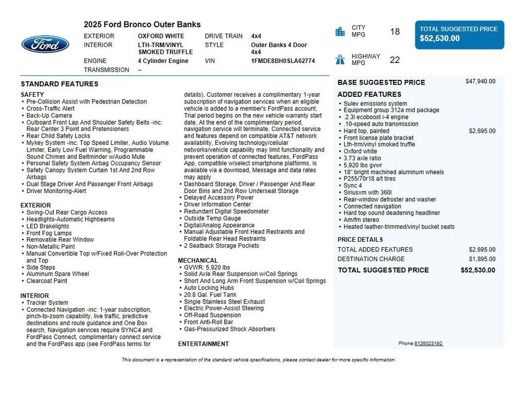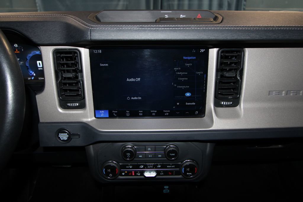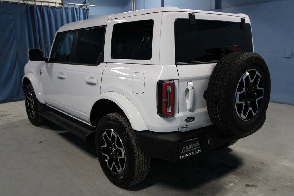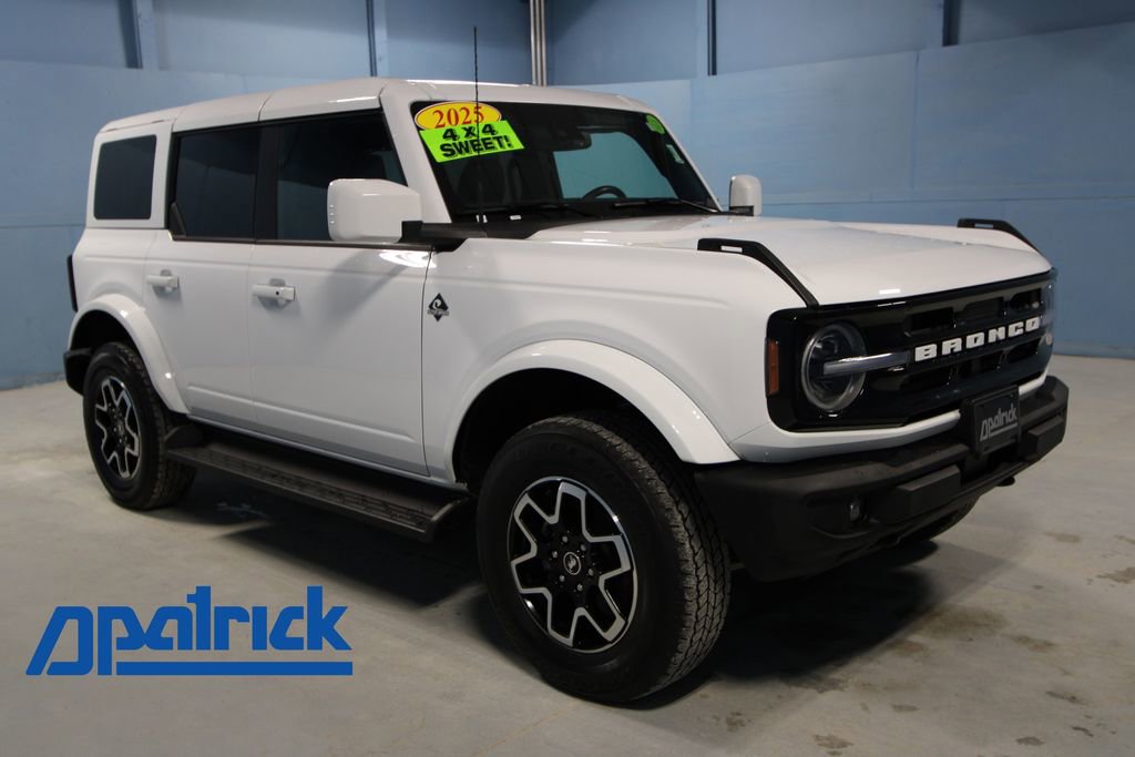2025 Ford Bronco Outer Banks We want you to shop confidently for your next used car at The BIG Ford Store, D-Patrick Ford. We are located on Highway 41 and Walnut in Evansville, right next to the Lloyd Expressway. Buy this used vehicle 100% online or in-store. This pre-owned vehicle was put through an extensive inspection before hitting our lot. Because of this, we are able to offer a 3-month/3,000-mile comprehensive limited warranty. You also get our Love It or Return It 5-day, 300-mile Exchange Policy. See our website for more details on both. We also offer extended service plans, vehicle protection plans, and offer a CarFax vehicle history report. *Prices listed do not include a $250 documentation fee, applicable tax, title, tags, license, or $195 service and preparation. All pricing, vehicle information, and features (such as accessories and color) are believed to be accurate, but we do not warrant or guarantee such accuracy. The prices shown above may vary from region to region, and incentives are subject to change. Some offers listed may not be available to all customers. All online sale commitments are subject to confirmation of continued availability of vehicle. Once availability is confirmed, online sale agreement becomes binding upon the parties. If any information found on the website is thought to be erroneous, please verify information with a customer service representative. See dealer for full details. Looking to sell your current vehicle? We buy cars for cash. Every test drive at D-Patrick Ford in Evansville earns $10 to a local charity. Schedule your test drive today! 18 Bright Machined Aluminum Wheels, 3.73 Axle Ratio, 4-Wheel Disc Brakes, 7 Speakers, ABS brakes, Air Conditioning, Alloy wheels, AM/FM radio: SiriusXM with 360L, AM/FM Stereo, Auto High-beam Headlights, Auto-dimming Rear-View mirror, Automatic temperature control, Brake assist, Compass, Connected Navigation, Delay-off headlights, Driver door bin, Driver vanity mirror, Dual front impact airbags, Dual front side impact airbags, Electronic Stability Control, Emergency communication system: 911 Assist, Equipment Group 312A Mid Package, Exterior Parking Camera Rear, Front anti-roll bar, Front Bucket Seats, Front Center Armrest, Front dual zone A/C, Front fog lights, Front License Plate Bracket, Front reading lights, Front wheel independent suspension, Fully automatic headlights, Heated door mirrors, Heated front seats, Heated Leather-Trimmed/Vinyl Bucket Seats, Heated steering wheel, Illuminated entry, Integrated roll-over protection, Internet access capable: FordPass Connect, Leather Shift Knob, Low tire pressure warning, Navigation system: Connected Navigation, Occupant sensing airbag, Outside temperature display, Overhead airbag, Overhead console, Painted Hard Top, Panic alarm, Passenger door bin, Passenger vanity mirror, Power door mirrors, Power driver seat, Power passenger seat, Power steering, Power windows, Radio data system, Rear seat center armrest, Remote keyless entry, Security system, SiriusXM w/360L, Speed control, Split folding rear seat, Steering wheel mounted audio controls, SYNC 4, Tachometer, Telescoping steering wheel, Tilt steering wheel, Traction control, Trip computer, Variably intermittent wipers, Voltmeter. CARFAX One-Owner. 4D Sport Utility Outer Banks 10-Speed Automatic 2.3L EcoBoost I-4 4WD Oxford White CALL TODAY (812) 625-4823 OR SHOP ONLINE AT WWW.DPATRICKFORD.COM.