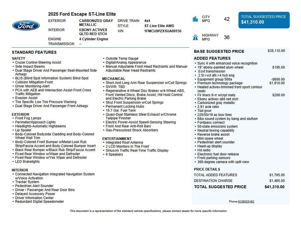 2025 Ford Escape Hybrid ST-Line Elite We want you to shop confidently for your next used car at The BIG Ford Store, D-Patrick Ford. We are located on Highway 41 and Walnut in Evansville, right next to the Lloyd Expressway. Buy this used vehicle 100% online or in-store. This pre-owned vehicle was put through an extensive inspection before hitting our lot. Because of this, we are able to offer a 3-month/3,000-mile comprehensive limited warranty. You also get our Love It or Return It 5-day, 300-mile Exchange Policy. See our website for more details on both. We also offer extended service plans, vehicle protection plans, and offer a CarFax vehicle history report. *Prices listed do not include a $250 documentation fee, applicable tax, title, tags, license, or $195 service and preparation. All pricing, vehicle information, and features (such as accessories and color) are believed to be accurate, but we do not warrant or guarantee such accuracy. The prices shown above may vary from region to region, and incentives are subject to change. Some offers listed may not be available to all customers. All online sale commitments are subject to confirmation of continued availability of vehicle. Once availability is confirmed, online sale agreement becomes binding upon the parties. If any information found on the website is thought to be erroneous, please verify information with a customer service representative. See dealer for full details. Looking to sell your current vehicle? We buy cars for cash. Every test drive at D-Patrick Ford in Evansville earns $10 to a local charity. Schedule your test drive today! 2.5L iVCT, 2.91 Axle Ratio, 360-Degree Camera w/Split View, 4-Wheel Disc Brakes, 6 Speakers, ABS brakes, Air Conditioning, Alloy wheels, AM/FM radio: SiriusXM, AM/FM Stereo, Auto High-beam Headlights, Auto-dimming Rear-View mirror, Automatic temperature control, Brake assist, Bumpers: body-color, Compass, Delay-off headlights, Driver door bin, Driver vanity mirror, Dual front impact airbags, Dual front side impact airbags, Electronic Fuel Door Release, Electronic Stability Control, Emergency communication system: SYNC 4 911 Assist, Equipment Group 500A, FordPass Connect, Four wheel independent suspension, Front & Rear Floor Liners w/Carpet Mats, Front anti-roll bar, Front Bucket Seats, Front Center Armrest, Front dual zone A/C, Front fog lights, Front Parking Sensors, Front reading lights, Fully automatic headlights, HD Radio, Head-Up Display, Heated ActiveX-Trimmed Front Sport Contour Seats, Heated door mirrors, Heated front seats, Heated steering wheel, Heated Vinyl/Cloth Front Sport Contour Bucket Seats, Illuminated entry, Internet access capable: FordPass Connect 4G, Knee airbag, Low tire pressure warning, Memory seat, Navigation system: Connected Navigation, Neutral Towing Capability, Occupant sensing airbag, Outside temperature display, Overhead airbag, Overhead console, Panic alarm, Passenger door bin, Passenger vanity mirror, Pedestrian Alert Sounder, Power door mirrors, Power driver seat, Power Liftgate, Power passenger seat, Power steering, Power windows, Premium Technology Package, Radio data system, Radio: B&O Sound System by Bang & Olufsen, Rear anti-roll bar, Rear reading lights, Rear seat center armrest, Rear window defroster, Rear window wiper, Remote keyless entry, Reverse Brake Assist, Security system, Speed control, Speed-sensing steering, Speed-Sensitive Wipers, Split folding rear seat, Spoiler, Sport steering wheel, Steering wheel mounted audio controls, SYNC 4 w/Enhanced Voice Recognition, Tachometer, Telescoping steering wheel, Tilt steering wheel, Traction control, Trip computer, Variably intermittent wipers, Wheels: 19 Ebony-Painted Aluminum, Wheels: 19 Machined-Face Ebony-Painted Aluminum, 2.5L iVCT. CARFAX One-Owner. Clean CARFAX. 4D Sport Utility ST-Line Elite eCVT 2.5L iVCT AWD Gray Metallic CALL TODAY (812) 625-4823 OR SHOP ONLINE AT WWW.DPATRICKFORD.COM.