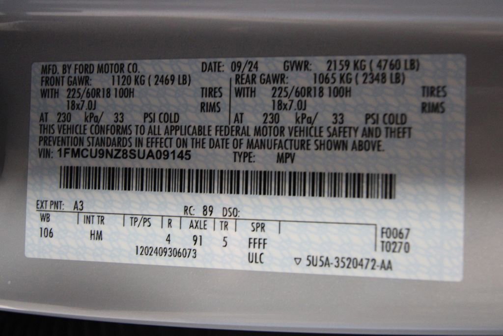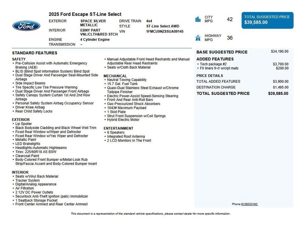 2025 Ford Escape Hybrid ST-Line Select We want you to shop confidently for your next used car at The BIG Ford Store, D-Patrick Ford. We are located on Highway 41 and Walnut in Evansville, right next to the Lloyd Expressway. Buy this used vehicle 100% online or in-store. This pre-owned vehicle was put through an extensive inspection before hitting our lot. Because of this, we are able to offer a 3-month/3,000-mile comprehensive limited warranty. You also get our Love It or Return It 5-day, 300-mile Exchange Policy. See our website for more details on both. We also offer extended service plans, vehicle protection plans, and offer a CarFax vehicle history report. *Prices listed do not include a $250 documentation fee, applicable tax, title, tags, license, or $195 service and preparation. All pricing, vehicle information, and features (such as accessories and color) are believed to be accurate, but we do not warrant or guarantee such accuracy. The prices shown above may vary from region to region, and incentives are subject to change. Some offers listed may not be available to all customers. All online sale commitments are subject to confirmation of continued availability of vehicle. Once availability is confirmed, online sale agreement becomes binding upon the parties. If any information found on the website is thought to be erroneous, please verify information with a customer service representative. See dealer for full details. Looking to sell your current vehicle? We buy cars for cash. Every test drive at D-Patrick Ford in Evansville earns $10 to a local charity. Schedule your test drive today! 2.5L iVCT, 10-Way Power Driver's Seat, 12.3 Productivity Screen in Instrument Cluster, 2.91 Axle Ratio, 360-Degree Camera w/Split View, 4-Wheel Disc Brakes, 6 Speakers, 6-Way Power Passenger Seat, ABS brakes, Adaptive Cruise Control w/Stop-and-Go, Air Conditioning, Alloy wheels, AM/FM radio: SiriusXM, AM/FM Stereo, Auto High-beam Headlights, Automatic temperature control, Body Color Mirrors, Brake assist, Bumpers: body-color, Compass, Connected Navigation, Delay-off headlights, Driver door bin, Driver vanity mirror, Dual front impact airbags, Dual front side impact airbags, Electronic Fuel Door Release, Electronic Stability Control, Emergency communication system: SYNC 4 911 Assist, Equipment Group 400A, Ford Co-Pilot360 Assist 2.0, FordPass Connect, Four wheel independent suspension, Front & Rear Floor Liners w/Carpet Mats, Front anti-roll bar, Front Bucket Seats, Front Center Armrest, Front dual zone A/C, Front fog lights, Front reading lights, Fully automatic headlights, HD Radio, Heated door mirrors, Heated front seats, Heated steering wheel, Heated Vinyl/Cloth Front Sport Contour Bucket Seats, Illuminated entry, Internet access capable: FordPass Connect 4G, Intersection Assist, Knee airbag, Low tire pressure warning, Memory Package, Neutral Towing Capability, Occupant sensing airbag, Outside temperature display, Overhead airbag, Overhead console, Panic alarm, Passenger door bin, Passenger vanity mirror, Pedestrian Alert Sounder, Power door mirrors, Power driver seat, Power Liftgate, Power steering, Power windows, Predictive Speed Assist, Radio data system, Radio: B&O Sound System by Bang & Olufsen, Rear anti-roll bar, Rear Parking Sensor, Rear reading lights, Rear seat center armrest, Rear window defroster, Rear window wiper, Remote keyless entry, Reverse Brake Assist, Speed control, Speed-sensing steering, Speed-Sensitive Wipers, Split folding rear seat, Spoiler, Sport steering wheel, Steering wheel mounted audio controls, SYNC 4, SYNC 4 w/Enhanced Voice Recognition, Tachometer, Tech Pack #2, Telescoping steering wheel, Tilt steering wheel, Traction control, Trip computer, Variably intermittent wipers, Wheels: 18 Rock Metallic Painted Aluminum, Wireless Charging Pad, 2.5L iVCT. CARFAX One-Owner. Clean CARFAX. 4D Sport Utility ST-Line Select eCVT 2.5L iVCT AWD Silver Metallic CALL TODAY (812) 625-4823 OR SHOP ONLINE AT WWW.DPATRIC