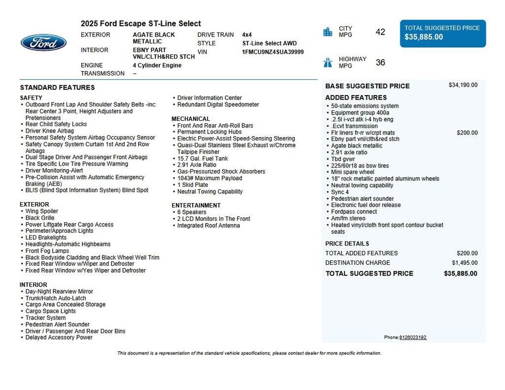2025 Ford Escape Hybrid ST-Line Select We want you to shop confidently for your next used car at The BIG Ford Store, D-Patrick Ford. We are located on Highway 41 and Walnut in Evansville, right next to the Lloyd Expressway. Buy this used vehicle 100% online or in-store. This pre-owned vehicle was put through an extensive inspection before hitting our lot. Because of this, we are able to offer a 3-month/3,000-mile comprehensive limited warranty. You also get our Love It or Return It 5-day, 300-mile Exchange Policy. See our website for more details on both. We also offer extended service plans, vehicle protection plans, and offer a CarFax vehicle history report. *Prices listed do not include a $250 documentation fee, applicable tax, title, tags, license, or $195 service and preparation. All pricing, vehicle information, and features (such as accessories and color) are believed to be accurate, but we do not warrant or guarantee such accuracy. The prices shown above may vary from region to region, and incentives are subject to change. Some offers listed may not be available to all customers. All online sale commitments are subject to confirmation of continued availability of vehicle. Once availability is confirmed, online sale agreement becomes binding upon the parties. If any information found on the website is thought to be erroneous, please verify information with a customer service representative. See dealer for full details. Looking to sell your current vehicle? We buy cars for cash. Every test drive at D-Patrick Ford in Evansville earns $10 to a local charity. Schedule your test drive today! 2.5L iVCT, 2.91 Axle Ratio, 4-Wheel Disc Brakes, 6 Speakers, ABS brakes, Air Conditioning, Alloy wheels, AM/FM radio: SiriusXM, AM/FM Stereo, Auto High-beam Headlights, Automatic temperature control, Brake assist, Bumpers: body-color, Compass, Delay-off headlights, Driver door bin, Driver vanity mirror, Dual front impact airbags, Dual front side impact airbags, Electronic Fuel Door Release, Electronic Stability Control, Emergency communication system: SYNC 4 911 Assist, Equipment Group 400A, FordPass Connect, Four wheel independent suspension, Front & Rear Floor Liners w/Carpet Mats, Front anti-roll bar, Front Bucket Seats, Front Center Armrest, Front dual zone A/C, Front fog lights, Front reading lights, Fully automatic headlights, Heated door mirrors, Heated front seats, Heated steering wheel, Heated Vinyl/Cloth Front Sport Contour Bucket Seats, Illuminated entry, Internet access capable: FordPass Connect 4G, Knee airbag, Low tire pressure warning, Neutral Towing Capability, Occupant sensing airbag, Outside temperature display, Overhead airbag, Overhead console, Panic alarm, Passenger door bin, Passenger vanity mirror, Pedestrian Alert Sounder, Power door mirrors, Power driver seat, Power Liftgate, Power steering, Power windows, Radio data system, Rear anti-roll bar, Rear reading lights, Rear seat center armrest, Rear window defroster, Rear window wiper, Remote keyless entry, Speed control, Speed-sensing steering, Speed-Sensitive Wipers, Split folding rear seat, Spoiler, Sport steering wheel, Steering wheel mounted audio controls, SYNC 4, Tachometer, Telescoping steering wheel, Tilt steering wheel, Traction control, Trip computer, Variably intermittent wipers, Wheels: 18 Rock Metallic Painted Aluminum, 2.5L iVCT. CARFAX One-Owner. Clean CARFAX. 4D Sport Utility ST-Line Select eCVT 2.5L iVCT AWD Black Metallic CALL TODAY (812) 625-4823 OR SHOP ONLINE AT WWW.DPATRICKFORD.COM.