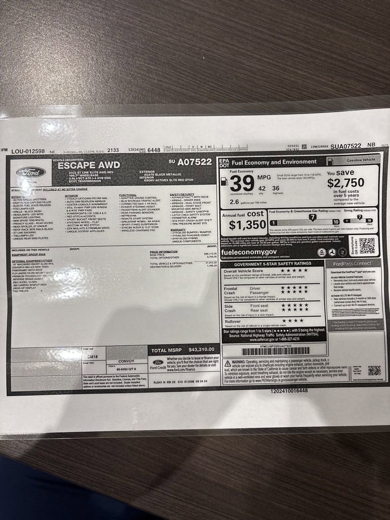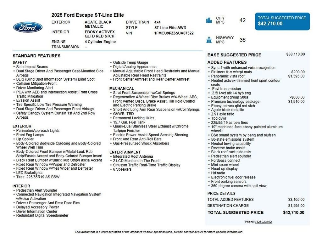 2025 Ford Escape Hybrid ST-Line Elite We want you to shop confidently for your next used car at The BIG Ford Store, D-Patrick Ford. We are located on Highway 41 and Walnut in Evansville, right next to the Lloyd Expressway. Buy this used vehicle 100% online or in-store. This pre-owned vehicle was put through an extensive inspection before hitting our lot. Because of this, we are able to offer a 3-month/3,000-mile comprehensive limited warranty. You also get our Love It or Return It 5-day, 300-mile Exchange Policy. See our website for more details on both. We also offer extended service plans, vehicle protection plans, and offer a CarFax vehicle history report. *Prices listed do not include a $250 documentation fee, applicable tax, title, tags, license, or $195 service and preparation. All pricing, vehicle information, and features (such as accessories and color) are believed to be accurate, but we do not warrant or guarantee such accuracy. The prices shown above may vary from region to region, and incentives are subject to change. Some offers listed may not be available to all customers. All online sale commitments are subject to confirmation of continued availability of vehicle. Once availability is confirmed, online sale agreement becomes binding upon the parties. If any information found on the website is thought to be erroneous, please verify information with a customer service representative. See dealer for full details. Looking to sell your current vehicle? We buy cars for cash. Every test drive at D-Patrick Ford in Evansville earns $10 to a local charity. Schedule your test drive today! 2.5L iVCT, 2.91 Axle Ratio, 360-Degree Camera w/Split View, 4-Wheel Disc Brakes, 6 Speakers, ABS brakes, Air Conditioning, Alloy wheels, AM/FM radio: SiriusXM, AM/FM Stereo, Auto High-beam Headlights, Auto-dimming Rear-View mirror, Automatic temperature control, Black Roof-Rack Side Rails, Brake assist, Bumpers: body-color, Compass, Delay-off headlights, Driver door bin, Driver vanity mirror, Dual front impact airbags, Dual front side impact airbags, Electronic Fuel Door Release, Electronic Stability Control, Emergency communication system: SYNC 4 911 Assist, Equipment Group 500A, FordPass Connect, Four wheel independent suspension, Front & Rear Floor Liners w/Carpet Mats, Front anti-roll bar, Front Bucket Seats, Front Center Armrest, Front dual zone A/C, Front fog lights, Front Parking Sensors, Front reading lights, Fully automatic headlights, HD Radio, Head-Up Display, Heated ActiveX-Trimmed Front Sport Contour Seats, Heated door mirrors, Heated front seats, Heated steering wheel, Heated Vinyl/Cloth Front Sport Contour Bucket Seats, Illuminated entry, Internet access capable: FordPass Connect 4G, Knee airbag, Low tire pressure warning, Memory seat, Navigation system: Connected Navigation, Neutral Towing Capability, Occupant sensing airbag, Outside temperature display, Overhead airbag, Overhead console, Panic alarm, Panoramic Vista Roof, Passenger door bin, Passenger vanity mirror, Pedestrian Alert Sounder, Power door mirrors, Power driver seat, Power Liftgate, Power passenger seat, Power steering, Power windows, Premium Technology Package, Radio data system, Radio: B&O Sound System by Bang & Olufsen, Rear anti-roll bar, Rear reading lights, Rear seat center armrest, Rear window defroster, Rear window wiper, Remote keyless entry, Reverse Brake Assist, Security system, Speed control, Speed-sensing steering, Speed-Sensitive Wipers, Split folding rear seat, Spoiler, Sport steering wheel, Steering wheel mounted audio controls, SYNC 4 w/Enhanced Voice Recognition, Tachometer, Telescoping steering wheel, Tilt steering wheel, Traction control, Trip computer, Variably intermittent wipers, Wheels: 19 Machined-Face Ebony-Painted Aluminum, 2.5L iVCT. CARFAX One-Owner. Clean CARFAX. 4D Sport Utility ST-Line Elite eCVT 2.5L iVCT AWD Black Metallic CALL TODAY (812) 625-4823 OR SHOP ONLINE AT WWW.DPATRICKFORD.COM.