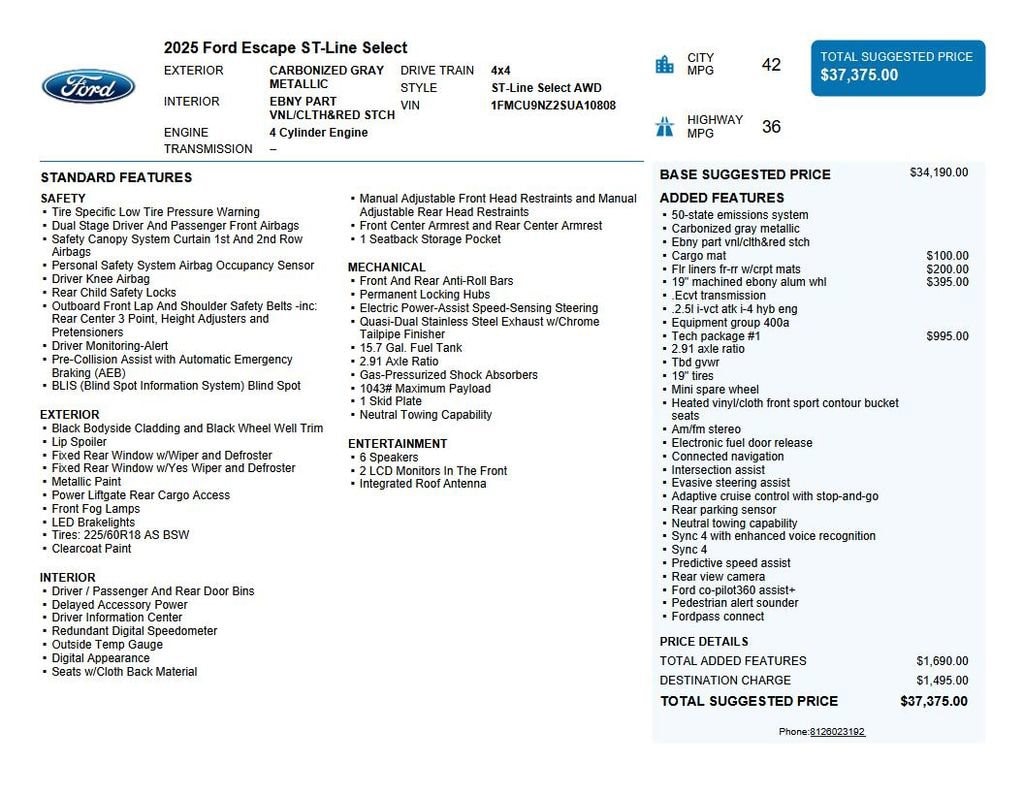 2025 Ford Escape Hybrid ST-Line Select We want you to shop confidently for your next used car at The BIG Ford Store, D-Patrick Ford. We are located on Highway 41 and Walnut in Evansville, right next to the Lloyd Expressway. Buy this used vehicle 100% online or in-store. This pre-owned vehicle was put through an extensive inspection before hitting our lot. Because of this, we are able to offer a 3-month/3,000-mile comprehensive limited warranty. You also get our Love It or Return It 5-day, 300-mile Exchange Policy. See our website for more details on both. We also offer extended service plans, vehicle protection plans, and offer a CarFax vehicle history report. *Prices listed do not include a $250 documentation fee, applicable tax, title, tags, license, or $195 service and preparation. All pricing, vehicle information, and features (such as accessories and color) are believed to be accurate, but we do not warrant or guarantee such accuracy. The prices shown above may vary from region to region, and incentives are subject to change. Some offers listed may not be available to all customers. All online sale commitments are subject to confirmation of continued availability of vehicle. Once availability is confirmed, online sale agreement becomes binding upon the parties. If any information found on the website is thought to be erroneous, please verify information with a customer service representative. See dealer for full details. Looking to sell your current vehicle? We buy cars for cash. Every test drive at D-Patrick Ford in Evansville earns $10 to a local charity. Schedule your test drive today! 2.5L iVCT, 2.91 Axle Ratio, 4-Wheel Disc Brakes, 6 Speakers, ABS brakes, Adaptive Cruise Control w/Stop-and-Go, Air Conditioning, Alloy wheels, AM/FM radio: SiriusXM, AM/FM Stereo, Auto High-beam Headlights, Automatic temperature control, Brake assist, Bumpers: body-color, Cargo Mat, Compass, Connected Navigation, Delay-off headlights, Driver door bin, Driver vanity mirror, Dual front impact airbags, Dual front side impact airbags, Electronic Fuel Door Release, Electronic Stability Control, Emergency communication system: SYNC 4 911 Assist, Equipment Group 400A, Ford Co-Pilot360 Assist+, FordPass Connect, Four wheel independent suspension, Front & Rear Floor Liners w/Carpet Mats, Front anti-roll bar, Front Bucket Seats, Front Center Armrest, Front dual zone A/C, Front fog lights, Front reading lights, Fully automatic headlights, Heated door mirrors, Heated front seats, Heated steering wheel, Heated Vinyl/Cloth Front Sport Contour Bucket Seats, Illuminated entry, Internet access capable: FordPass Connect 4G, Intersection Assist, Knee airbag, Low tire pressure warning, Neutral Towing Capability, Occupant sensing airbag, Outside temperature display, Overhead airbag, Overhead console, Panic alarm, Passenger door bin, Passenger vanity mirror, Pedestrian Alert Sounder, Power door mirrors, Power driver seat, Power Liftgate, Power steering, Power windows, Predictive Speed Assist, Radio data system, Rear anti-roll bar, Rear Parking Sensor, Rear reading lights, Rear seat center armrest, Rear window defroster, Rear window wiper, Rear-View Camera, Remote keyless entry, Speed control, Speed-sensing steering, Speed-Sensitive Wipers, Split folding rear seat, Spoiler, Sport steering wheel, Steering wheel mounted audio controls, SYNC 4, SYNC 4 w/Enhanced Voice Recognition, Tachometer, Tech Pack #1, Telescoping steering wheel, Tilt steering wheel, Traction control, Trip computer, Variably intermittent wipers, Wheels: 18 Rock Metallic Painted Aluminum, Wheels: 19 Machined-Face Ebony-Painted Aluminum, 2.5L iVCT. CARFAX One-Owner. Clean CARFAX. 4D Sport Utility ST-Line Select eCVT 2.5L iVCT AWD Gray Metallic CALL TODAY (812) 625-4823 OR SHOP ONLINE AT WWW.DPATRICKFORD.COM.
