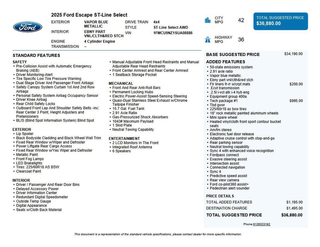 2025 Ford Escape Hybrid ST-Line Select We want you to shop confidently for your next used car at The BIG Ford Store, D-Patrick Ford. We are located on Highway 41 and Walnut in Evansville, right next to the Lloyd Expressway. Buy this used vehicle 100% online or in-store. This pre-owned vehicle was put through an extensive inspection before hitting our lot. Because of this, we are able to offer a 3-month/3,000-mile comprehensive limited warranty. You also get our Love It or Return It 5-day, 300-mile Exchange Policy. See our website for more details on both. We also offer extended service plans, vehicle protection plans, and offer a CarFax vehicle history report. *Prices listed do not include a $250 documentation fee, applicable tax, title, tags, license, or $195 service and preparation. All pricing, vehicle information, and features (such as accessories and color) are believed to be accurate, but we do not warrant or guarantee such accuracy. The prices shown above may vary from region to region, and incentives are subject to change. Some offers listed may not be available to all customers. All online sale commitments are subject to confirmation of continued availability of vehicle. Once availability is confirmed, online sale agreement becomes binding upon the parties. If any information found on the website is thought to be erroneous, please verify information with a customer service representative. See dealer for full details. Looking to sell your current vehicle? We buy cars for cash. Every test drive at D-Patrick Ford in Evansville earns $10 to a local charity. Schedule your test drive today! 2.5L iVCT, 2.91 Axle Ratio, 4-Wheel Disc Brakes, 6 Speakers, ABS brakes, Adaptive Cruise Control w/Stop-and-Go, Air Conditioning, Alloy wheels, AM/FM radio: SiriusXM, AM/FM Stereo, Auto High-beam Headlights, Automatic temperature control, Brake assist, Bumpers: body-color, Compass, Connected Navigation, Delay-off headlights, Driver door bin, Driver vanity mirror, Dual front impact airbags, Dual front side impact airbags, Electronic Fuel Door Release, Electronic Stability Control, Emergency communication system: SYNC 4 911 Assist, Equipment Group 400A, Ford Co-Pilot360 Assist+, FordPass Connect, Four wheel independent suspension, Front & Rear Floor Liners w/Carpet Mats, Front anti-roll bar, Front Bucket Seats, Front Center Armrest, Front dual zone A/C, Front fog lights, Front reading lights, Fully automatic headlights, Heated door mirrors, Heated front seats, Heated steering wheel, Heated Vinyl/Cloth Front Sport Contour Bucket Seats, Illuminated entry, Internet access capable: FordPass Connect 4G, Intersection Assist, Knee airbag, Low tire pressure warning, Neutral Towing Capability, Occupant sensing airbag, Outside temperature display, Overhead airbag, Overhead console, Panic alarm, Passenger door bin, Passenger vanity mirror, Pedestrian Alert Sounder, Power door mirrors, Power driver seat, Power Liftgate, Power steering, Power windows, Predictive Speed Assist, Radio data system, Rear anti-roll bar, Rear Parking Sensor, Rear reading lights, Rear seat center armrest, Rear window defroster, Rear window wiper, Rear-View Camera, Remote keyless entry, Speed control, Speed-sensing steering, Speed-Sensitive Wipers, Split folding rear seat, Spoiler, Sport steering wheel, Steering wheel mounted audio controls, SYNC 4, SYNC 4 w/Enhanced Voice Recognition, Tachometer, Tech Pack #1, Telescoping steering wheel, Tilt steering wheel, Traction control, Trip computer, Variably intermittent wipers, Wheels: 18 Rock Metallic Painted Aluminum, 2.5L iVCT. CARFAX One-Owner. Clean CARFAX. 4D Sport Utility ST-Line Select eCVT 2.5L iVCT AWD Vapor Blue CALL TODAY (812) 625-4823 OR SHOP ONLINE AT WWW.DPATRICKFORD.COM.