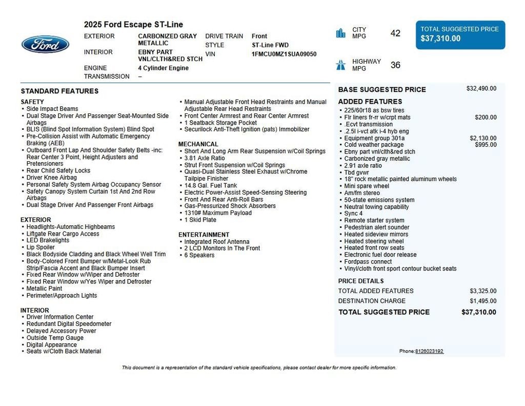 2025 Ford Escape Hybrid ST-Line Recent Arrival! We want you to shop confidently for your next used car at D-Patrick Boonville Ford and We make it EASY! Buy this used vehicle 100% online or in-store, EASY. Saving time at the dealership, EASY! Financing, EASY! Finding the car you love at the price you want, EASY! This pre-owned vehicle was put through an extensive inspection before hitting our lot. Because of this, we are able to offer a 3-month/3,000-mile comprehensive limited warranty. You also get our Love It or Return It 5-day, 300-mile Exchange Policy. See our website for more details on both. We also offer extended service plans, vehicle protection plans, and offer a CarFax vehicle history report. *Prices listed do not include applicable tax, title, tags, license. Prices include at $250 Documentation Fee and $195 Service & Preparation. All pricing, vehicle information, and features (such as accessories and color) are believed to be accurate, but we do not warrant or guarantee such accuracy. The prices shown above may vary from region to region, and incentives are subject to change. Some offers listed may not be available to all customers. All online sale commitments are subject to confirmation of continued availability of vehicle. Once availability is confirmed, online sale agreement becomes binding upon the parties. If any information found on the website is thought to be erroneous, please verify information with a customer service representative. See dealer for full details. Looking to sell your current vehicle? We buy cars for cash. 2.5L iVCT, 2.91 Axle Ratio, 3.81 Axle Ratio, 4-Wheel Disc Brakes, 6 Speakers, ABS brakes, Air Conditioning, Alloy wheels, AM/FM radio: SiriusXM, AM/FM Stereo, Auto High-beam Headlights, Automatic temperature control, Brake assist, Bumpers: body-color, Cold Weather Package, Compass, Delay-off headlights, Driver door bin, Driver vanity mirror, Dual front impact airbags, Dual front side impact airbags, Electronic Fuel Door Release, Electronic Stability Control, Emergency communication system: SYNC 4 911 Assist, Equipment Group 301A, FordPass Connect, Four wheel independent suspension, Front & Rear Floor Liners w/Carpet Mats, Front anti-roll bar, Front Bucket Seats, Front Center Armrest, Front dual zone A/C, Front reading lights, Fully automatic headlights, Heated Front Row Seats, Heated Sideview Mirrors, Heated Steering Wheel, Illuminated entry, Internet access capable: FordPass Connect 4G, Knee airbag, Low tire pressure warning, Neutral Towing Capability, Occupant sensing airbag, Outside temperature display, Overhead airbag, Overhead console, Panic alarm, Passenger door bin, Passenger vanity mirror, Pedestrian Alert Sounder, Power door mirrors, Power driver seat, Power steering, Power windows, Radio data system, Rear anti-roll bar, Rear reading lights, Rear seat center armrest, Rear window defroster, Rear window wiper, Remote keyless entry, Remote Starter System, Speed control, Speed-sensing steering, Speed-Sensitive Wipers, Split folding rear seat, Spoiler, Sport steering wheel, Steering wheel mounted audio controls, SYNC 4, Tachometer, Telescoping steering wheel, Tilt steering wheel, Traction control, Trip computer, Variably intermittent wipers, Vinyl/Cloth Front Sport Contour Bucket Seats, Wheels: 18 Rock Metallic Painted Aluminum, 2.5L iVCT. CARFAX One-Owner. Clean CARFAX. 4D Sport Utility ST-Line eCVT 2.5L iVCT FWD Gray Metallic CALL US TODAY BEFORE THIS ONE GETS AWAY-- (812) 897-5838 or shop online at www.boonvilleford.com.