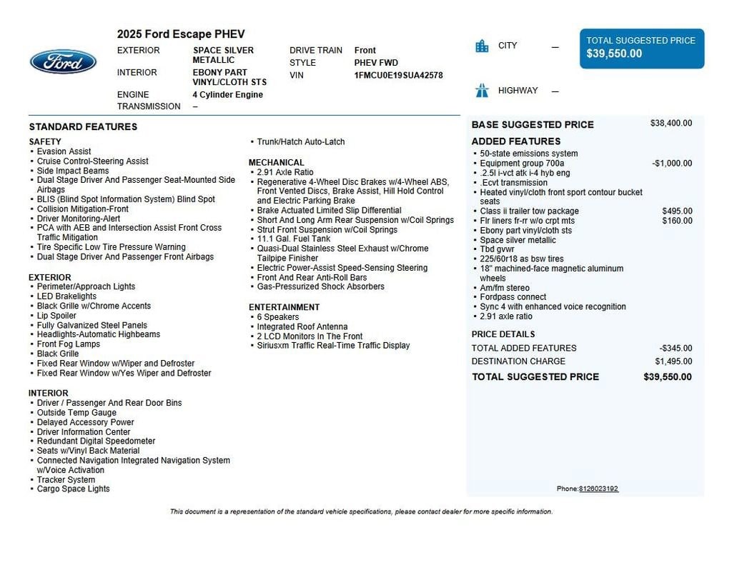 2025 Ford Escape Plug-In Hybrid Base We want you to shop confidently for your next used car at The BIG Ford Store, D-Patrick Ford. We are located on Highway 41 and Walnut in Evansville, right next to the Lloyd Expressway. Buy this used vehicle 100% online or in-store. This pre-owned vehicle was put through an extensive inspection before hitting our lot. Because of this, we are able to offer a 3-month/3,000-mile comprehensive limited warranty. You also get our Love It or Return It 5-day, 300-mile Exchange Policy. See our website for more details on both. We also offer extended service plans, vehicle protection plans, and offer a CarFax vehicle history report. *Prices listed do not include a $250 documentation fee, applicable tax, title, tags, license, or $195 service and preparation. All pricing, vehicle information, and features (such as accessories and color) are believed to be accurate, but we do not warrant or guarantee such accuracy. The prices shown above may vary from region to region, and incentives are subject to change. Some offers listed may not be available to all customers. All online sale commitments are subject to confirmation of continued availability of vehicle. Once availability is confirmed, online sale agreement becomes binding upon the parties. If any information found on the website is thought to be erroneous, please verify information with a customer service representative. See dealer for full details. Looking to sell your current vehicle? We buy cars for cash. Every test drive at D-Patrick Ford in Evansville earns $10 to a local charity. Schedule your test drive today! 2.5L iVCT, 2.91 Axle Ratio, 4-Wheel Disc Brakes, 6 Speakers, ABS brakes, Air Conditioning, Alloy wheels, AM/FM radio: SiriusXM, AM/FM Stereo, Auto High-beam Headlights, Automatic temperature control, Brake assist, Bumpers: body-color, Class II Trailer Tow Package, Compass, Delay-off headlights, Driver door bin, Driver vanity mirror, Dual front impact airbags, Dual front side impact airbags, Electronic Stability Control, Emergency communication system: SYNC 4 911 Assist, Equipment Group 700A, FordPass Connect, Four wheel independent suspension, Front & Rear Floor Liners w/o Carpet Mats, Front anti-roll bar, Front Bucket Seats, Front Center Armrest, Front dual zone A/C, Front fog lights, Front reading lights, Fully automatic headlights, Heated door mirrors, Heated front seats, Heated steering wheel, Heated Vinyl/Cloth Front Sport Contour Bucket Seats, Illuminated entry, Internet access capable: FordPass Connect 4G, Knee airbag, Low tire pressure warning, Navigation system: Connected Navigation, Occupant sensing airbag, Outside temperature display, Overhead airbag, Overhead console, Panic alarm, Passenger door bin, Passenger vanity mirror, Power door mirrors, Power driver seat, Power Liftgate, Power steering, Power windows, Radio data system, Rear anti-roll bar, Rear reading lights, Rear seat center armrest, Rear window defroster, Rear window wiper, Remote keyless entry, Speed control, Speed-sensing steering, Speed-Sensitive Wipers, Split folding rear seat, Spoiler, Steering wheel mounted audio controls, SYNC 4 w/Enhanced Voice Recognition, Telescoping steering wheel, Tilt steering wheel, Traction control, Trip computer, Variably intermittent wipers, Wheels: 18 Machined-Face Magnetic Aluminum, 2.5L iVCT. CARFAX One-Owner. Clean CARFAX. 4D Sport Utility eCVT 2.5L iVCT FWD Silver Metallic CALL TODAY (812) 625-4823 OR SHOP ONLINE AT WWW.DPATRICKFORD.COM.
