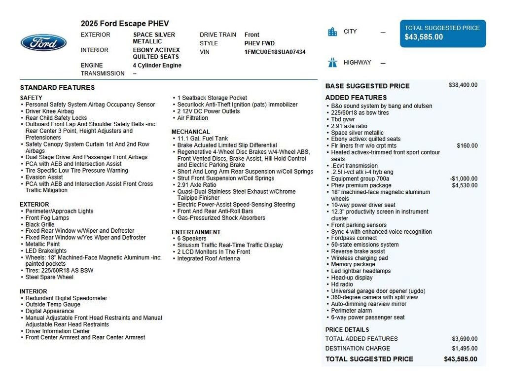 2025 Ford Escape Plug-In Hybrid Base We want you to shop confidently for your next used car at The BIG Ford Store, D-Patrick Ford. We are located on Highway 41 and Walnut in Evansville, right next to the Lloyd Expressway. Buy this used vehicle 100% online or in-store. This pre-owned vehicle was put through an extensive inspection before hitting our lot. Because of this, we are able to offer a 3-month/3,000-mile comprehensive limited warranty. You also get our Love It or Return It 5-day, 300-mile Exchange Policy. See our website for more details on both. We also offer extended service plans, vehicle protection plans, and offer a CarFax vehicle history report. *Prices listed do not include a $250 documentation fee, applicable tax, title, tags, license, or $195 service and preparation. All pricing, vehicle information, and features (such as accessories and color) are believed to be accurate, but we do not warrant or guarantee such accuracy. The prices shown above may vary from region to region, and incentives are subject to change. Some offers listed may not be available to all customers. All online sale commitments are subject to confirmation of continued availability of vehicle. Once availability is confirmed, online sale agreement becomes binding upon the parties. If any information found on the website is thought to be erroneous, please verify information with a customer service representative. See dealer for full details. Looking to sell your current vehicle? We buy cars for cash. Every test drive at D-Patrick Ford in Evansville earns $10 to a local charity. Schedule your test drive today! 2.5L iVCT, 10-Way Power Driver's Seat, 12.3 Productivity Screen in Instrument Cluster, 2.91 Axle Ratio, 360-Degree Camera w/Split View, 4-Wheel Disc Brakes, 6 Speakers, 6-Way Power Passenger Seat, ABS brakes, Air Conditioning, Alloy wheels, AM/FM radio: SiriusXM, AM/FM Stereo, Auto High-beam Headlights, Auto-Dimming Rear-View Mirror, Automatic temperature control, Brake assist, Bumpers: body-color, Compass, Delay-off headlights, Driver door bin, Driver vanity mirror, Dual front impact airbags, Dual front side impact airbags, Electronic Stability Control, Emergency communication system: SYNC 4 911 Assist, Equipment Group 700A, FordPass Connect, Four wheel independent suspension, Front & Rear Floor Liners w/o Carpet Mats, Front anti-roll bar, Front Bucket Seats, Front Center Armrest, Front dual zone A/C, Front fog lights, Front Parking Sensors, Front reading lights, Fully automatic headlights, HD Radio, Head-Up Display, Heated ActiveX-Trimmed Front Sport Contour Seats, Heated door mirrors, Heated front seats, Heated steering wheel, Heated Vinyl/Cloth Front Sport Contour Bucket Seats, Illuminated entry, Internet access capable: FordPass Connect 4G, Knee airbag, LED Lightbar Headlamps, Low tire pressure warning, Memory Package, Navigation system: Connected Navigation, Occupant sensing airbag, Outside temperature display, Overhead airbag, Overhead console, Panic alarm, Passenger door bin, Passenger vanity mirror, Perimeter Alarm, PHEV Premium Package, Power door mirrors, Power driver seat, Power Liftgate, Power steering, Power windows, Radio data system, Radio: B&O Sound System by Bang & Olufsen, Rear anti-roll bar, Rear reading lights, Rear seat center armrest, Rear window defroster, Rear window wiper, Remote keyless entry, Reverse Brake Assist, Speed control, Speed-sensing steering, Speed-Sensitive Wipers, Split folding rear seat, Spoiler, Steering wheel mounted audio controls, SYNC 4 w/Enhanced Voice Recognition, Telescoping steering wheel, Tilt steering wheel, Traction control, Trip computer, Universal Garage Door Opener (UGDO), Variably intermittent wipers, Wheels: 18 Machined-Face Magnetic Aluminum, Wireless Charging Pad, 2.5L iVCT. CARFAX One-Owner. 4D Sport Utility eCVT 2.5L iVCT FWD Silver Metallic CALL TODAY (812) 625-4823 OR SHOP ONLINE AT WWW.DPATRICKFORD.COM.