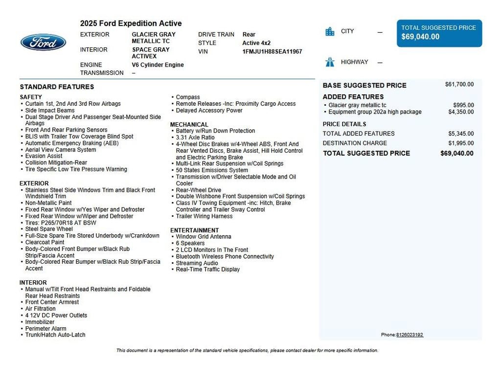 2025 Ford Expedition Active We want you to shop confidently for your next used car at The BIG Ford Store, D-Patrick Ford. We are located on Highway 41 and Walnut in Evansville, right next to the Lloyd Expressway. Buy this used vehicle 100% online or in-store. This pre-owned vehicle was put through an extensive inspection before hitting our lot. Because of this, we are able to offer a 3-month/3,000-mile comprehensive limited warranty. You also get our Love It or Return It 5-day, 300-mile Exchange Policy. See our website for more details on both. We also offer extended service plans, vehicle protection plans, and offer a CarFax vehicle history report. *Prices listed do not include a $250 documentation fee, applicable tax, title, tags, license, or $195 service and preparation. All pricing, vehicle information, and features (such as accessories and color) are believed to be accurate, but we do not warrant or guarantee such accuracy. The prices shown above may vary from region to region, and incentives are subject to change. Some offers listed may not be available to all customers. All online sale commitments are subject to confirmation of continued availability of vehicle. Once availability is confirmed, online sale agreement becomes binding upon the parties. If any information found on the website is thought to be erroneous, please verify information with a customer service representative. See dealer for full details. Looking to sell your current vehicle? We buy cars for cash. Every test drive at D-Patrick Ford in Evansville earns $10 to a local charity. Schedule your test drive today! 110V/400W AC Power Outlet, 2nd Row Power-Folding Captain's Chairs, 3.31 Axle Ratio, 360-Degree Zone Lighting, 3rd Row Flexible Seating, 3rd row seats: split-bench, 3rd Row Vinyl Seats, 4-Door Intelligent Access (Lock/Unlock), 4-Wheel Disc Brakes, 6 Speakers, ABS brakes, ActiveX Front Heated Captain's Chairs, Air Conditioning, Alloy wheels, AM/FM radio: SiriusXM with 360L, Apple CarPlay/Android Auto, Auto High-beam Headlights, Auto-dimming Rear-View mirror, Automatic temperature control, BlueCruise Equipped, Brake assist, Bumpers: body-color, Cloth Front Captain's Chairs, Compass, Delay-off headlights, Driver door bin, Driver State Detection, Driver vanity mirror, Dual front impact airbags, Dual front side impact airbags, Electronic Stability Control, Emergency communication system: 911 Assist, Equipment Group 202A High Package, Exterior Parking Camera Rear, Flex Powered Console, Ford Split Gate, Four wheel independent suspension, Front anti-roll bar, Front Bucket Seats, Front Center Armrest, Front dual zone A/C, Front License Plate Bracket, Front reading lights, Front Side Laminated Glass, Fully automatic headlights, Heated door mirrors, Heated Steering Wheel, Illuminated entry, Intersection Assist, Low tire pressure warning, Memory Driver Seat, Navigation System, Occupant sensing airbag, Outside temperature display, Overhead airbag, Overhead console, Panic alarm, Passenger door bin, Passenger vanity mirror, Power door mirrors, Power driver seat, Power Panoramic Vista Roof w/Power Sunshade, Power passenger seat, Power steering, Power Tilt/Telescopic Steering Wheel w/Memory, Power windows, Power-Folding Sideview Mirrors w/Autofold, Radio data system, Radio: AM/FM Stereo w/MP3 Capable, Rain Sensing Wipers, Rear air conditioning, Rear anti-roll bar, Rear reading lights, Rear window defroster, Rear window wiper, Reclining 3rd row seat, Remote keyless entry, SecuriCode Keyless Entry Pad, Security system, SiriusXM w/360L, Speed control, Speed-sensing steering, Speed-Sensitive Wipers, Split folding rear seat, Spoiler, Steering wheel mounted audio controls, Tachometer, Telescoping steering wheel, Tilt steering wheel, Traction control, Trip computer, Universal Garage Door Opener, USB Ports, Variably intermittent wipers, Voltmeter, Wheels: 18 Dark Alloy Painted Aluminum, Wheels: 20 Carbonized Gray Bright Machined Aluminum, Wireless Charging Pad. CARFAX One