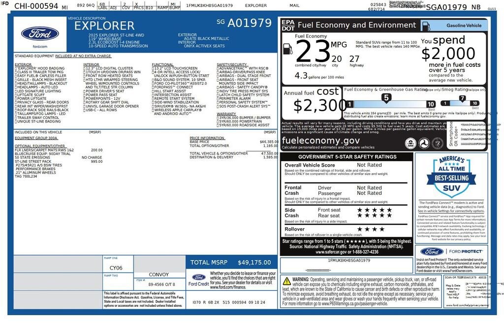 2025 Ford Explorer ST-Line We want you to shop confidently for your next used car at The BIG Ford Store, D-Patrick Ford. We are located on Highway 41 and Walnut in Evansville, right next to the Lloyd Expressway. Buy this used vehicle 100% online or in-store. This pre-owned vehicle was put through an extensive inspection before hitting our lot. Because of this, we are able to offer a 3-month/3,000-mile comprehensive limited warranty. You also get our Love It or Return It 5-day, 300-mile Exchange Policy. See our website for more details on both. We also offer extended service plans, vehicle protection plans, and offer a CarFax vehicle history report. *Prices listed do not include a $250 documentation fee, applicable tax, title, tags, license, or $195 service and preparation. All pricing, vehicle information, and features (such as accessories and color) are believed to be accurate, but we do not warrant or guarantee such accuracy. The prices shown above may vary from region to region, and incentives are subject to change. Some offers listed may not be available to all customers. All online sale commitments are subject to confirmation of continued availability of vehicle. Once availability is confirmed, online sale agreement becomes binding upon the parties. If any information found on the website is thought to be erroneous, please verify information with a customer service representative. See dealer for full details. Looking to sell your current vehicle? We buy cars for cash. Every test drive at D-Patrick Ford in Evansville earns $10 to a local charity. Schedule your test drive today! 4WD, 10 Speakers, 3.58 Non-Limited Slip Rear Axle, 3rd row seats: bench, 4-Wheel Disc Brakes, ABS brakes, Air Conditioning, Alloy wheels, AM/FM radio: SiriusXM with 360L, Apple CarPlay/Android Auto, Auto High-beam Headlights, Automatic temperature control, Brake assist, Bumpers: body-color, Compass, Delay-off headlights, Driver door bin, Driver vanity mirror, Dual front impact airbags, Dual front side impact airbags, Electronic Stability Control, Emergency communication system: 911 Assist, Equipment Group 300A Standard Package, Exterior Parking Camera Rear, Four wheel independent suspension, Front & 2nd Rows Floor Liners w/Carpet Floor Mats, Front anti-roll bar, Front Bucket Seats, Front Center Armrest, Front dual zone A/C, Front fog lights, Front reading lights, Fully automatic headlights, Garage door transmitter, Heated door mirrors, Heated front seats, Heated steering wheel, Heated Unique Cloth Captain's Chairs, Illuminated entry, Internet access capable: FordPass Connect 5G, Knee airbag, Leather steering wheel, Low tire pressure warning, Navigation System, Occupant sensing airbag, Outside temperature display, Overhead airbag, Overhead console, Panic alarm, Passenger door bin, Passenger vanity mirror, Performance Brakes, Power door mirrors, Power driver seat, Power Liftgate, Power passenger seat, Power steering, Power windows, Radio: B&O Sound System by Bang & Olufsen, Rear air conditioning, Rear anti-roll bar, Rear reading lights, Rear window defroster, Rear window wiper, Red Painted Perf Front & Rear Brake Calipers, Remote keyless entry, Security system, Speed control, Speed-sensing steering, Speed-Sensitive Wipers, Split folding rear seat, Spoiler, ST-Line Street Pack, Steering wheel mounted audio controls, Tachometer, Telescoping steering wheel, Tilt steering wheel, Traction control, Trip computer, Variably intermittent wipers, Wheels: 20 Ebony-Painted Machined Aluminum, Wheels: 21 Magnetite-Painted Aluminum, 4WD. CARFAX One-Owner. Clean CARFAX. 4D Sport Utility ST-Line 10-Speed Automatic 2.3L EcoBoost I-4 4WD Black Metallic CALL TODAY (812) 625-4823 OR SHOP ONLINE AT WWW.DPATRICKFORD.COM.