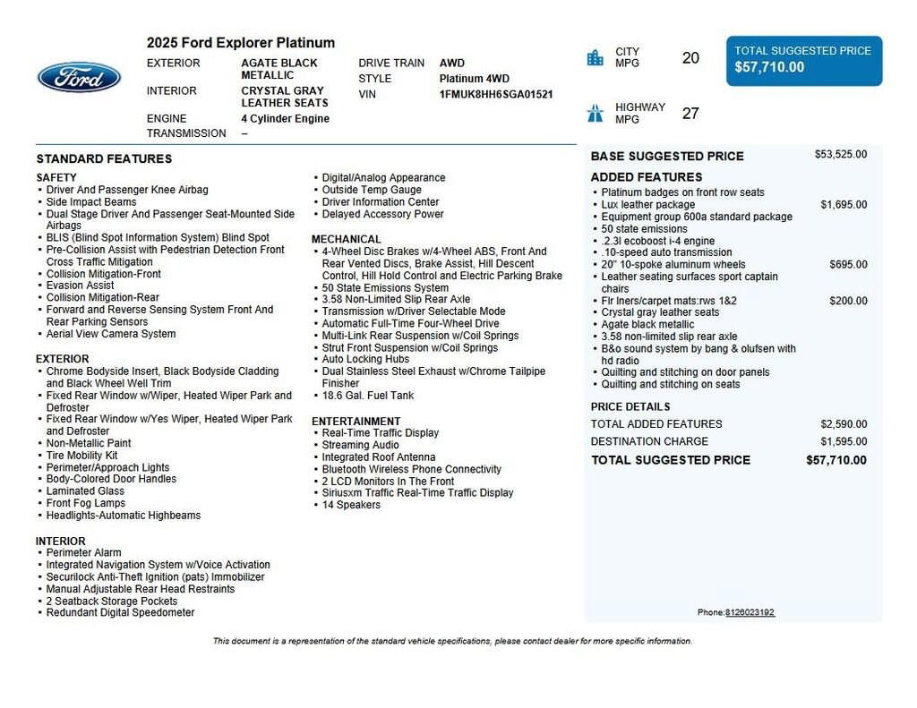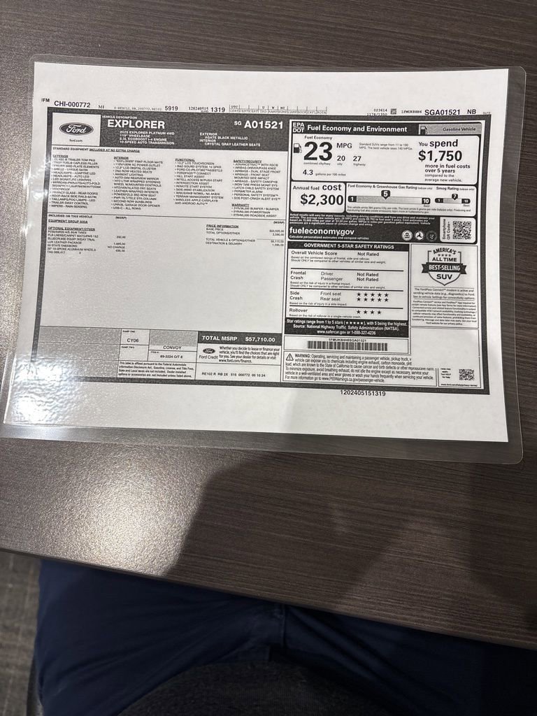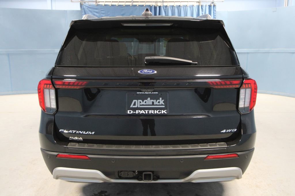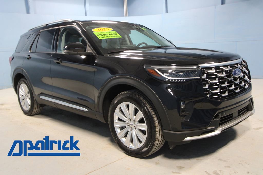 2025 Ford Explorer Platinum We want you to shop confidently for your next used car at The BIG Ford Store, D-Patrick Ford. We are located on Highway 41 and Walnut in Evansville, right next to the Lloyd Expressway. Buy this used vehicle 100% online or in-store. This pre-owned vehicle was put through an extensive inspection before hitting our lot. Because of this, we are able to offer a 3-month/3,000-mile comprehensive limited warranty. You also get our Love It or Return It 5-day, 300-mile Exchange Policy. See our website for more details on both. We also offer extended service plans, vehicle protection plans, and offer a CarFax vehicle history report. *Prices listed do not include a $250 documentation fee, applicable tax, title, tags, license, or $195 service and preparation. All pricing, vehicle information, and features (such as accessories and color) are believed to be accurate, but we do not warrant or guarantee such accuracy. The prices shown above may vary from region to region, and incentives are subject to change. Some offers listed may not be available to all customers. All online sale commitments are subject to confirmation of continued availability of vehicle. Once availability is confirmed, online sale agreement becomes binding upon the parties. If any information found on the website is thought to be erroneous, please verify information with a customer service representative. See dealer for full details. Looking to sell your current vehicle? We buy cars for cash. Every test drive at D-Patrick Ford in Evansville earns $10 to a local charity. Schedule your test drive today! 4WD, 14 Speakers, 3.58 Non-Limited Slip Rear Axle, 3rd row seats: bench, 4-Wheel Disc Brakes, ABS brakes, ActiveX Trimmed Sport Captain's Chairs, Air Conditioning, Alloy wheels, AM/FM radio: SiriusXM with 360L, Apple CarPlay/Android Auto, Auto High-beam Headlights, Auto-dimming door mirrors, Auto-dimming Rear-View mirror, Automatic temperature control, Brake assist, Bumpers: body-color, Compass, Delay-off headlights, Driver door bin, Driver vanity mirror, Dual front impact airbags, Dual front side impact airbags, Electronic Stability Control, Emergency communication system: 911 Assist, Equipment Group 600A Standard Package, Exterior Parking Camera Rear, Four wheel independent suspension, Front & 2nd Rows Floor Liners w/Carpet Floor Mats, Front anti-roll bar, Front Bucket Seats, Front Center Armrest, Front dual zone A/C, Front fog lights, Front reading lights, Fully automatic headlights, Garage door transmitter, Heated door mirrors, Heated front seats, Heated rear seats, Heated steering wheel, Illuminated entry, Internet access capable: FordPass Connect 5G, Knee airbag, Leather Seating Surfaces Sport Captain Chairs, Leather steering wheel, Low tire pressure warning, Lux Leather Package, Memory seat, Navigation System, Occupant sensing airbag, Outside temperature display, Overhead airbag, Overhead console, Panic alarm, Passenger door bin, Passenger vanity mirror, Platinum Badges on Front Row Seats, Power door mirrors, Power driver seat, Power Liftgate, Power moonroof, Power passenger seat, Power steering, Power windows, Quilting & Stitching on Door Panels, Quilting & Stitching on Seats, Radio data system, Radio: B&O Sound System by Bang & Olufsen w/HD, Rain sensing wipers, Rear air conditioning, Rear anti-roll bar, Rear reading lights, Rear window defroster, Rear window wiper, Remote keyless entry, Security system, Speed control, Speed-sensing steering, Speed-Sensitive Wipers, Split folding rear seat, Spoiler, Steering wheel mounted audio controls, Tachometer, Telescoping steering wheel, Tilt steering wheel, Traction control, Trip computer, Turn signal indicator mirrors, Variably intermittent wipers, Ventilated front seats, Wheels: 20 10-Spoke Aluminum (DISC), Wheels: 20 Luster Nickel-Painted Aluminum, 4WD. CARFAX One-Owner. Clean CARFAX. 4D Sport Utility Platinum 10-Speed Automatic 2.3L EcoBoost I-4 4WD Black Metallic CALL TODAY (812) 625-4823 OR