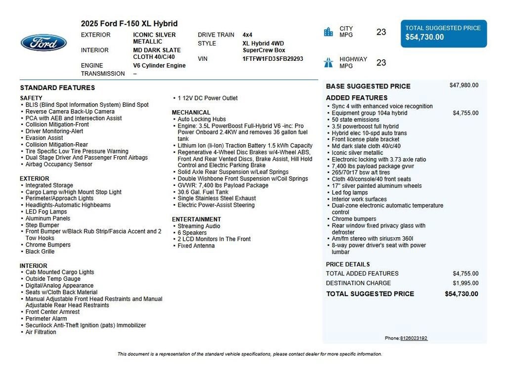 2025 Ford F-150 XL We want you to shop confidently for your next used car at The BIG Ford Store, D-Patrick Ford. We are located on Highway 41 and Walnut in Evansville, right next to the Lloyd Expressway. Buy this used vehicle 100% online or in-store. This pre-owned vehicle was put through an extensive inspection before hitting our lot. Because of this, we are able to offer a 3-month/3,000-mile comprehensive limited warranty. You also get our Love It or Return It 5-day, 300-mile Exchange Policy. See our website for more details on both. We also offer extended service plans, vehicle protection plans, and offer a CarFax vehicle history report. *Prices listed do not include a $250 documentation fee, applicable tax, title, tags, license, or $195 service and preparation. All pricing, vehicle information, and features (such as accessories and color) are believed to be accurate, but we do not warrant or guarantee such accuracy. The prices shown above may vary from region to region, and incentives are subject to change. Some offers listed may not be available to all customers. All online sale commitments are subject to confirmation of continued availability of vehicle. Once availability is confirmed, online sale agreement becomes binding upon the parties. If any information found on the website is thought to be erroneous, please verify information with a customer service representative. See dealer for full details. Looking to sell your current vehicle? We buy cars for cash. Every test drive at D-Patrick Ford in Evansville earns $10 to a local charity. Schedule your test drive today! 3.5L PowerBoost Full-Hybrid V6, 4WD, 4-Wheel Disc Brakes, 6 Speakers, 8-Way Power Driver's Seat w/Power Lumbar, ABS brakes, Air Conditioning, Alloy wheels, AM/FM radio: SiriusXM with 360L, Auto High-beam Headlights, Automatic temperature control, Brake assist, Bumpers: chrome, Cloth 40/Console/40 Front Seats, Compass, Delay-off headlights, Driver door bin, Dual front impact airbags, Dual front side impact airbags, Dual-Zone Electronic Automatic Temperature Control, Electronic Locking w/3.73 Axle Ratio, Electronic Stability Control, Emergency communication system: SYNC 4 911 Assist, Equipment Group 104A Hybrid, Front anti-roll bar, Front Bucket Seats, Front Center Armrest, Front dual zone A/C, Front fog lights, Front License Plate Bracket, Front reading lights, Front wheel independent suspension, Fully automatic headlights, GVWR: 7,400 lbs Payload Package, Heated door mirrors, Illuminated entry, Interior Work Surfaces, Internet access capable: FordPass Connect 5G, LED Fog Lamps, Low tire pressure warning, Occupant sensing airbag, Outside temperature display, Overhead airbag, Overhead console, Panic alarm, Passenger door bin, Passenger vanity mirror, Power door mirrors, Power driver seat, Power steering, Power windows, Radio data system, Radio: AM/FM Stereo w/SiriusXM 360L, Rear Parking Sensors, Rear step bumper, Rear window defroster, Rear Window Fixed Privacy Glass w/Defroster, Remote keyless entry, Security system, Speed control, Split folding rear seat, Steering wheel mounted audio controls, SYNC 4 w/Enhanced Voice Recognition, Tachometer, Telescoping steering wheel, Tilt steering wheel, Traction control, Trip computer, Variably intermittent wipers, Voltmeter, Wheels: 17 Silver Painted Aluminum, 3.5L PowerBoost Full-Hybrid V6, 4WD. CARFAX One-Owner. Clean CARFAX. 4D SuperCrew XL 10-Speed Automatic 3.5L PowerBoost Full-Hybrid V6 4WD Silver Metallic CALL TODAY (812) 625-4823 OR SHOP ONLINE AT WWW.DPATRICKFORD.COM.