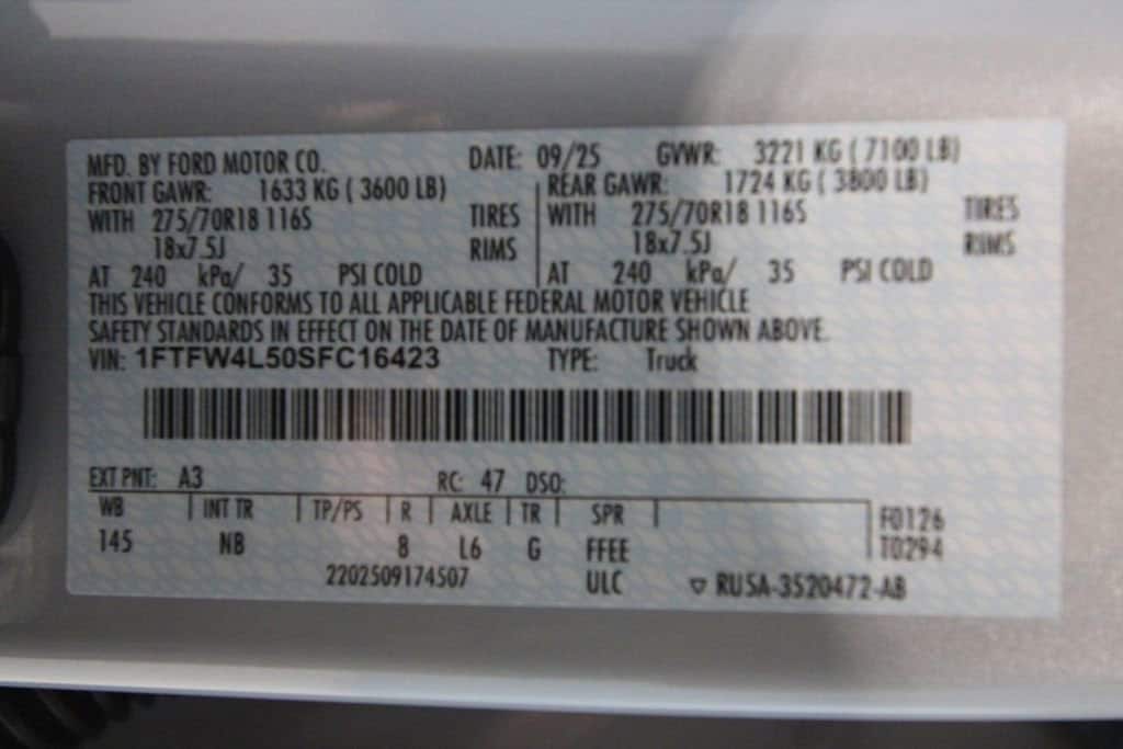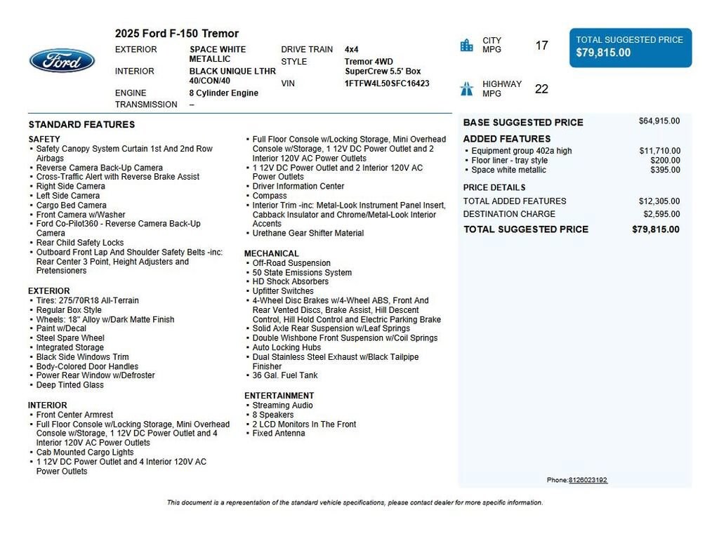 2025 Ford F-150 Tremor We want you to shop confidently for your next used car at The BIG Ford Store, D-Patrick Ford. We are located on Highway 41 and Walnut in Evansville, right next to the Lloyd Expressway. Buy this used vehicle 100% online or in-store. This pre-owned vehicle was put through an extensive inspection before hitting our lot. Because of this, we are able to offer a 3-month/3,000-mile comprehensive limited warranty. You also get our Love It or Return It 5-day, 300-mile Exchange Policy. See our website for more details on both. We also offer extended service plans, vehicle protection plans, and offer a CarFax vehicle history report. *Prices listed do not include a $250 documentation fee, applicable tax, title, tags, license, or $195 service and preparation. All pricing, vehicle information, and features (such as accessories and color) are believed to be accurate, but we do not warrant or guarantee such accuracy. The prices shown above may vary from region to region, and incentives are subject to change. Some offers listed may not be available to all customers. All online sale commitments are subject to confirmation of continued availability of vehicle. Once availability is confirmed, online sale agreement becomes binding upon the parties. If any information found on the website is thought to be erroneous, please verify information with a customer service representative. See dealer for full details. Looking to sell your current vehicle? We buy cars for cash. Every test drive at D-Patrick Ford in Evansville earns $10 to a local charity. Schedule your test drive today! 4WD, 4-Wheel Disc Brakes, 8 Speakers, ABS brakes, Adjustable pedals, Air Conditioning, Alloy wheels, AM/FM radio: SiriusXM with 360L, Auto High-beam Headlights, Auto-dimming door mirrors, Auto-dimming Rear-View mirror, Automatic temperature control, Brake assist, Bumpers: body-color, Compass, Delay-off headlights, Driver door bin, Driver vanity mirror, Dual front impact airbags, Dual front side impact airbags, Electronic Locking w/3.73 Axle Ratio, Electronic Stability Control, Emergency communication system: SYNC 4 911 Assist, Front anti-roll bar, Front Bucket Seats, Front Center Armrest, Front dual zone A/C, Front fog lights, Front reading lights, Front wheel independent suspension, Fully automatic headlights, GVWR: 7,100 lbs Payload Package, Heated door mirrors, Heated front seats, Illuminated entry, Internet access capable: FordPass Connect 5G, Low tire pressure warning, Navigation system: Connected Navigation, Occupant sensing airbag, Outside temperature display, Overhead airbag, Overhead console, Panic alarm, Passenger door bin, Passenger vanity mirror, Power door mirrors, Power driver seat, Power passenger seat, Power steering, Power windows, Radio data system, Radio: B&O Sound System by Bang & Olufsen, Rear reading lights, Rear step bumper, Rear window defroster, Remote keyless entry, Security system, Speed control, Split folding rear seat, Steering wheel mounted audio controls, SYNC 4 w/Enhanced Voice Recognition, Tachometer, Telescoping steering wheel, Tilt steering wheel, Traction control, Trip computer, Turn signal indicator mirrors, Unique Sport Cloth 40/Console/40 Power Front Seat, Variably intermittent wipers, Voltmeter, Wheels: 18 Alloy w/Dark Matte Finish, 4WD. CARFAX One-Owner. Clean CARFAX. 4D SuperCrew Tremor 10-Speed Automatic 5.0L V8 4WD Star White Metallic Tri-Coat CALL TODAY (812) 625-4823 OR SHOP ONLINE AT WWW.DPATRICKFORD.COM.