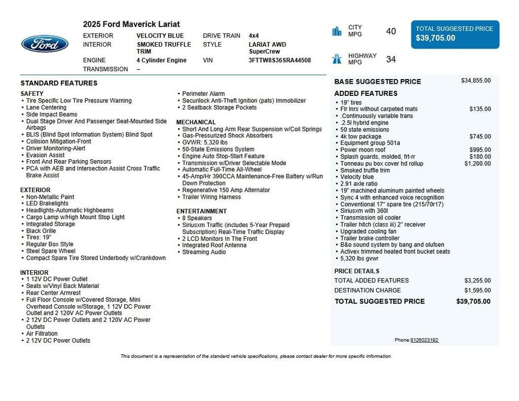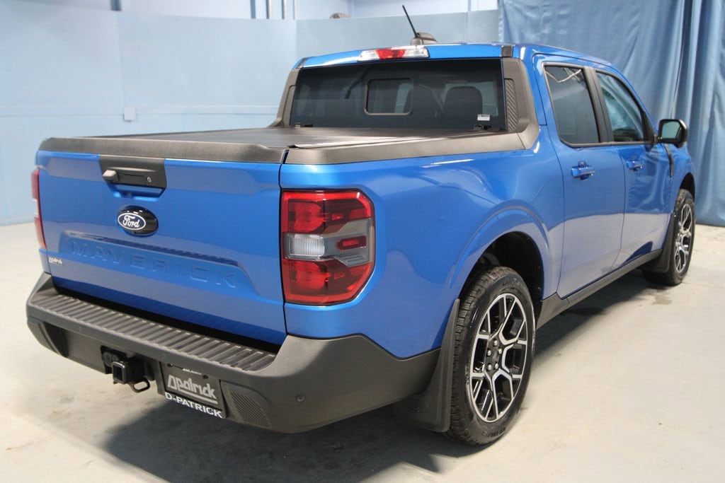 2025 Ford Maverick Lariat We want you to shop confidently for your next used car at The BIG Ford Store, D-Patrick Ford. We are located on Highway 41 and Walnut in Evansville, right next to the Lloyd Expressway. Buy this used vehicle 100% online or in-store. This pre-owned vehicle was put through an extensive inspection before hitting our lot. Because of this, we are able to offer a 3-month/3,000-mile comprehensive limited warranty. You also get our Love It or Return It 5-day, 300-mile Exchange Policy. See our website for more details on both. We also offer extended service plans, vehicle protection plans, and offer a CarFax vehicle history report. *Prices listed do not include a $250 documentation fee, applicable tax, title, tags, license, or $195 service and preparation. All pricing, vehicle information, and features (such as accessories and color) are believed to be accurate, but we do not warrant or guarantee such accuracy. The prices shown above may vary from region to region, and incentives are subject to change. Some offers listed may not be available to all customers. All online sale commitments are subject to confirmation of continued availability of vehicle. Once availability is confirmed, online sale agreement becomes binding upon the parties. If any information found on the website is thought to be erroneous, please verify information with a customer service representative. See dealer for full details. Looking to sell your current vehicle? We buy cars for cash. Every test drive at D-Patrick Ford in Evansville earns $10 to a local charity. Schedule your test drive today! 2.5L I-4 Hybrid, 2.91 Axle Ratio, 4-Wheel Disc Brakes, 4K Tow Package, 8 Speakers, ABS brakes, ActiveX Trimmed Heated Front Bucket Seats, Air Conditioning, Alloy wheels, AM/FM radio: SiriusXM with 360L, Apple CarPlay/Android Auto, Auto High-beam Headlights, Automatic temperature control, Brake assist, Bumpers: body-color, Compass, Delay-off headlights, Driver door bin, Driver vanity mirror, Dual front impact airbags, Dual front side impact airbags, Electronic Stability Control, Emergency communication system: SYNC 4 911 Assist, Equipment Group 501A, Exterior Parking Camera Rear, Four wheel independent suspension, Front & Rear Floor Liners w/o Carpet Mats, Front & Rear Molded Splash Guards (4-Piece), Front anti-roll bar, Front Bucket Seats, Front Center Armrest, Front dual zone A/C, Front reading lights, Fully automatic headlights, Heated door mirrors, Heated front seats, Heated steering wheel, Illuminated entry, Internet access capable: FordPass Connect 5G, Knee airbag, Low tire pressure warning, Navigation system: Connected Navigation, Occupant sensing airbag, Outside temperature display, Overhead airbag, Overhead console, Panic alarm, Passenger door bin, Passenger vanity mirror, Power door mirrors, Power driver seat, Power Moonroof, Power steering, Power windows, Radio data system, Radio: B&O Sound System by Bang & Olufsen, Rear anti-roll bar, Rear seat center armrest, Rear step bumper, Remote keyless entry, Security system, SiriusXM w/360L, Speed control, Speed-sensing steering, Steering wheel mounted audio controls, SYNC 4 w/Enhanced Voice Recognition, Telescoping steering wheel, Tilt steering wheel, Tonneau Pickup Box Cover - Hard Rollup, Traction control, Trailer Brake Controller, Trailer Hitch (Class III) 2 Receiver, Transmission Oil Cooler, Trip computer, Upgraded Cooling Fan, Wheels: 19 Machined Painted Aluminum, 2.5L I-4 Hybrid. CARFAX One-Owner. 4D Crew Cab Lariat CVT 2.5L I-4 Hybrid AWD Blue CALL TODAY (812) 625-4823 OR SHOP ONLINE AT WWW.DPATRICKFORD.COM.