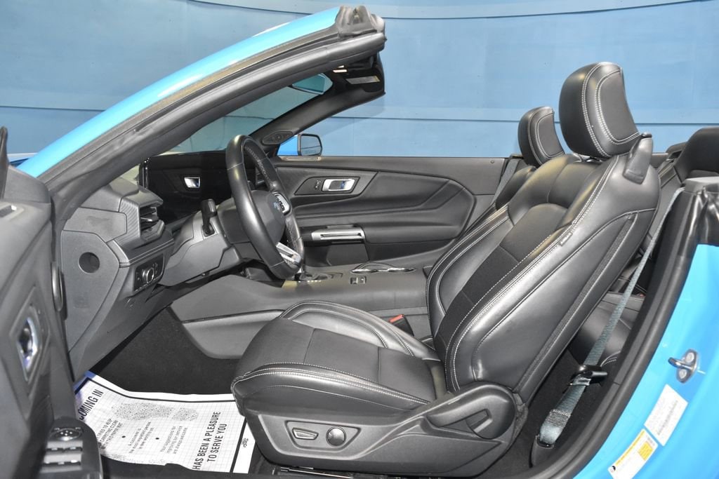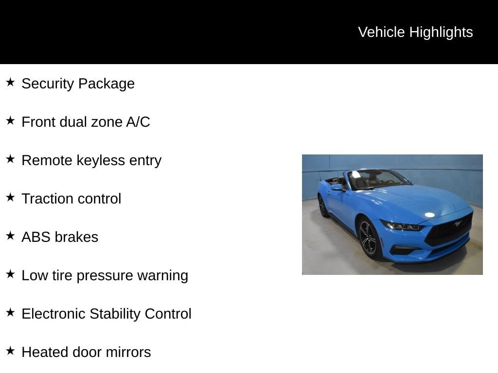 2025 Ford Mustang EcoBoost Premium Recent Arrival! Buy this used vehicle 100% online or in-store. We want you to shop confidently for your next used car at D-Patrick #1 Used Cars on Green River Road. D-Patrick #1 Used Cars are put through an extensive inspection before hitting our lot. Because of this, we are able to offer a 3-month/3,000-mile comprehensive limited warranty. You also get our Love It or Return It 5-day, 300-mile Exchange Policy. See our website for more details on both. We also offer extended warranties, additional protection plans, and offer a CarFax vehicle history report. We have a large selection of D-Patrick #1 Used Cars and AS-IS vehicles, all in one location with sale prices starting as low as $2500. We also have a large selection of certified, Audi, BMW, Mercedes-Benz, Porsche, Volkswagen, Ford, Lincoln, Honda, and Nissan. Looking to sell your current vehicle? We have partnered with Kelley Blue Book as Evansville's Instant Cash Offer Buying Center. *Prices listed do not include a $250 documentation fee, applicable tax, title, tags, license, or $195 service and preparation. All pricing, vehicle information, and features (such as accessories and color) are believed to be accurate, but we do not warrant or guarantee such accuracy. The prices shown above may vary from region to region, and incentives are subject to change. Some offers listed may not be available to all customers. All online sale commitments are subject to confirmation of continued availability of vehicle. Once availability is confirmed, online sale agreement becomes binding upon the parties. If any information found on the website is thought to be erroneous, please verify information with a customer service representative. See dealer for full details. ABS brakes, Alloy wheels, Compass, Electronic Stability Control, Front dual zone A/C, Heated door mirrors, Heated front seats, Illuminated entry, Low tire pressure warning, Remote keyless entry, Security Package, Traction control. CARFAX One-Owner. Clean CARFAX. 2D Convertible EcoBoost Premium 10-Speed Automatic EcoBoost 2.3L I4 GTDi DOHC Turbocharged VCT RWD Grabber Blue Metallic CALL US TODAY 812-471-7791 and shop online at www.evansvilleusedcars.com.