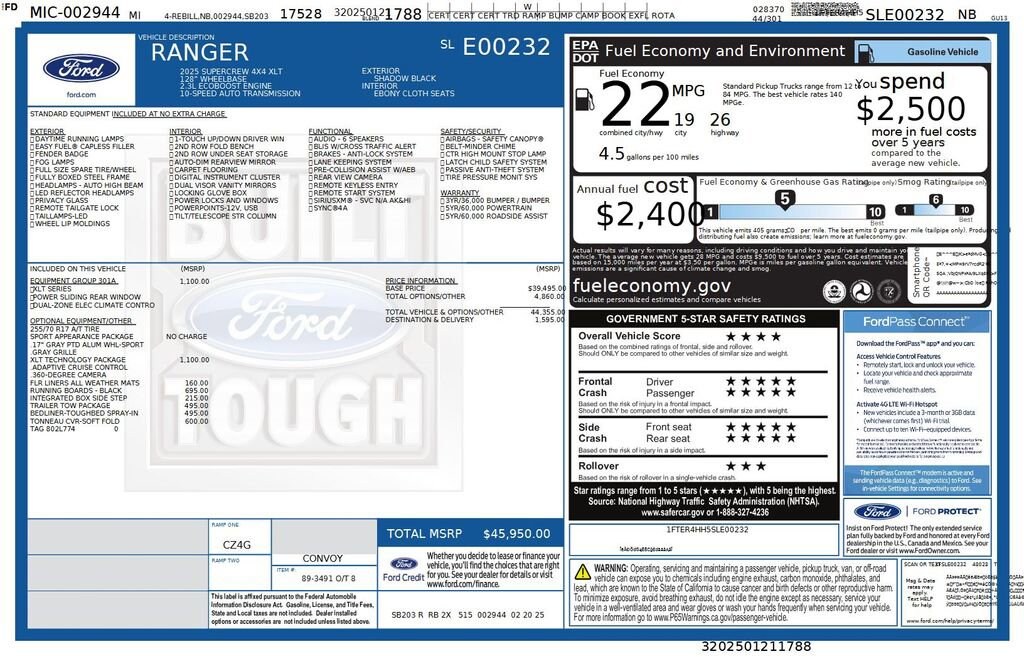 2025 Ford Ranger XLT We want you to shop confidently for your next used car at The BIG Ford Store, D-Patrick Ford. We are located on Highway 41 and Walnut in Evansville, right next to the Lloyd Expressway. Buy this used vehicle 100% online or in-store. This pre-owned vehicle was put through an extensive inspection before hitting our lot. Because of this, we are able to offer a 3-month/3,000-mile comprehensive limited warranty. You also get our Love It or Return It 5-day, 300-mile Exchange Policy. See our website for more details on both. We also offer extended service plans, vehicle protection plans, and offer a CarFax vehicle history report. *Prices listed do not include a $250 documentation fee, applicable tax, title, tags, license, or $195 service and preparation. All pricing, vehicle information, and features (such as accessories and color) are believed to be accurate, but we do not warrant or guarantee such accuracy. The prices shown above may vary from region to region, and incentives are subject to change. Some offers listed may not be available to all customers. All online sale commitments are subject to confirmation of continued availability of vehicle. Once availability is confirmed, online sale agreement becomes binding upon the parties. If any information found on the website is thought to be erroneous, please verify information with a customer service representative. See dealer for full details. Looking to sell your current vehicle? We buy cars for cash. Every test drive at D-Patrick Ford in Evansville earns $10 to a local charity. Schedule your test drive today! 4WD, 12 Display in Center Stack, 3.73 Axle Ratio, 360-Degree Camera, 4-Wheel Disc Brakes, 6 Speakers, ABS brakes, Adaptive Cruise Control, Air Conditioning, Alloy wheels, AM/FM radio: SiriusXM, AM/FM Stereo, Auto High-beam Headlights, Auto-dimming Rear-View mirror, Black Running Boards, Brake assist, Class IV Trailer Hitch Receiver, Cloth Front Bucket Seats, Compass, Delay-off headlights, Driver door bin, Driver vanity mirror, Dual front impact airbags, Dual front side impact airbags, Dual-Zone Electronic Climate Control (DEATC), Electronic Stability Control, Emergency communication system: SYNC 4 911 Assist, Equipment Group 301A High, Front anti-roll bar, Front Bucket Seats, Front Center Armrest, Front fog lights, Front Parking Sensors, Front reading lights, Front wheel independent suspension, Fully automatic headlights, Gray Painted Center Bar & Grille Surround, Gray Painted Front Fascia & Rear Bumper, Illuminated entry, Integrated Box Side Step, Leather Shift Knob, Low tire pressure warning, Navigation system: Connected Navigation, Occupant sensing airbag, Outside temperature display, Overhead airbag, Overhead console, Panic alarm, Passenger door bin, Passenger vanity mirror, Power door mirrors, Power steering, Power windows, Power-Sliding Rear Window, Rear reading lights, Rear seat center armrest, Rear step bumper, Rear window defroster, Remote keyless entry, Security system, SiriusXM Satellite Radio, Soft Folding Tonneau Pickup Box Cover, Speed control, Speed-sensing steering, Sport Appearance Package, Sport Box Decal, Steering wheel mounted audio controls, SYNC 4A w/Connected Navigation, Technology Package, Telescoping steering wheel, Tilt steering wheel, Tough Bed Spray-In Bedliner, Traction control, Trailer Tow Package, Tray Style Floor Liner, Trip computer, Variably intermittent wipers, Voltmeter, Wheels: 17 Gray-Painted Aluminum, 4WD. CARFAX One-Owner. Clean CARFAX. 4D Crew Cab XLT 10-Speed Automatic EcoBoost 2.3L I4 GTDi DOHC Turbocharged VCT 4WD Shadow Black CALL TODAY (812) 625-4823 OR SHOP ONLINE AT WWW.DPATRICKFORD.COM.
