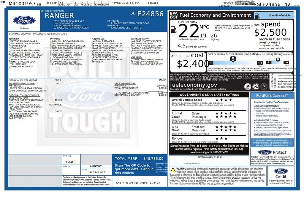 2025 Ford Ranger XLT We want you to shop confidently for your next used car at The BIG Ford Store, D-Patrick Ford. We are located on Highway 41 and Walnut in Evansville, right next to the Lloyd Expressway. Buy this used vehicle 100% online or in-store. This pre-owned vehicle was put through an extensive inspection before hitting our lot. Because of this, we are able to offer a 3-month/3,000-mile comprehensive limited warranty. You also get our Love It or Return It 5-day, 300-mile Exchange Policy. See our website for more details on both. We also offer extended service plans, vehicle protection plans, and offer a CarFax vehicle history report. *Prices listed do not include a $250 documentation fee, applicable tax, title, tags, license, or $195 service and preparation. All pricing, vehicle information, and features (such as accessories and color) are believed to be accurate, but we do not warrant or guarantee such accuracy. The prices shown above may vary from region to region, and incentives are subject to change. Some offers listed may not be available to all customers. All online sale commitments are subject to confirmation of continued availability of vehicle. Once availability is confirmed, online sale agreement becomes binding upon the parties. If any information found on the website is thought to be erroneous, please verify information with a customer service representative. See dealer for full details. Looking to sell your current vehicle? We buy cars for cash. Every test drive at D-Patrick Ford in Evansville earns $10 to a local charity. Schedule your test drive today! 4WD, 12 Display in Center Stack, 3.73 Axle Ratio, 360-Degree Camera, 4-Wheel Disc Brakes, 6 Speakers, ABS brakes, Adaptive Cruise Control, Air Conditioning, Alloy wheels, AM/FM radio: SiriusXM, AM/FM Stereo, Auto High-beam Headlights, Auto-dimming Rear-View mirror, Brake assist, Cloth Front Bucket Seats, Compass, Delay-off headlights, Driver door bin, Driver vanity mirror, Dual front impact airbags, Dual front side impact airbags, Dual-Zone Electronic Climate Control (DEATC), Electronic Stability Control, Emergency communication system: SYNC 4 911 Assist, Equipment Group 301A High, Front anti-roll bar, Front Bucket Seats, Front Center Armrest, Front fog lights, Front Parking Sensors, Front reading lights, Front wheel independent suspension, Fully automatic headlights, Gray Painted Center Bar & Grille Surround, Gray Painted Front Fascia & Rear Bumper, Illuminated entry, Leather Shift Knob, Low tire pressure warning, Navigation system: Connected Navigation, Occupant sensing airbag, Outside temperature display, Overhead airbag, Overhead console, Panic alarm, Passenger door bin, Passenger vanity mirror, Power door mirrors, Power steering, Power windows, Power-Sliding Rear Window, Rear reading lights, Rear seat center armrest, Rear step bumper, Rear window defroster, Remote keyless entry, Security system, SiriusXM Satellite Radio, Speed control, Speed-sensing steering, Sport Appearance Package, Sport Box Decal, Steering wheel mounted audio controls, SYNC 4A w/Connected Navigation, Technology Package, Telescoping steering wheel, Tilt steering wheel, Traction control, Trip computer, Variably intermittent wipers, Voltmeter, Wheels: 17 Gray-Painted Aluminum, 4WD. CARFAX One-Owner. Clean CARFAX. 4D Crew Cab XLT 10-Speed Automatic EcoBoost 2.3L I4 GTDi DOHC Turbocharged VCT 4WD Ruby Red Metallic CALL TODAY (812) 625-4823 OR SHOP ONLINE AT WWW.DPATRICKFORD.COM.