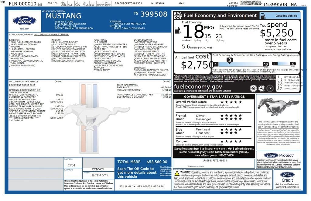 2026 Ford Mustang GT We want you to shop confidently for your next used car at The BIG Ford Store, D-Patrick Ford. We are located on Highway 41 and Walnut in Evansville, right next to the Lloyd Expressway. Buy this used vehicle 100% online or in-store. This pre-owned vehicle was put through an extensive inspection before hitting our lot. Because of this, we are able to offer a 3-month/3,000-mile comprehensive limited warranty. You also get our Love It or Return It 5-day, 300-mile Exchange Policy. See our website for more details on both. We also offer extended service plans, vehicle protection plans, and offer a CarFax vehicle history report. *Prices listed do not include a $250 documentation fee, applicable tax, title, tags, license, or $195 service and preparation. All pricing, vehicle information, and features (such as accessories and color) are believed to be accurate, but we do not warrant or guarantee such accuracy. The prices shown above may vary from region to region, and incentives are subject to change. Some offers listed may not be available to all customers. All online sale commitments are subject to confirmation of continued availability of vehicle. Once availability is confirmed, online sale agreement becomes binding upon the parties. If any information found on the website is thought to be erroneous, please verify information with a customer service representative. See dealer for full details. Looking to sell your current vehicle? We buy cars for cash. Every test drive at D-Patrick Ford in Evansville earns $10 to a local charity. Schedule your test drive today! 3.55 Limited Slip Rear Axle, 4-Wheel Disc Brakes, ABS brakes, Air Conditioning, Alloy wheels, AM/FM Stereo, Auto High-beam Headlights, Automatic temperature control, Black Painted Wedge Decklid Spoiler, Brake assist, Brembo Brake System with Performance Linings, Bronze Appearance Package, Bumpers: body-color, Cloth Bucket Seats, Compass, Delay-off headlights, Driver door bin, Driver vanity mirror, Dual front impact airbags, Dual front side impact airbags, Electronic Stability Control, Emergency communication system: 911 Assist, Equipment Group 300A Standard Package, Exterior Parking Camera Rear, Four wheel independent suspension, Front anti-roll bar, Front Bucket Seats, Front Center Armrest, Front dual zone A/C, Front reading lights, Fully automatic headlights, Illuminated entry, International Orange Seat Belt, Knee airbag, Leather Shift Knob, Leather steering wheel, Low tire pressure warning, Occupant sensing airbag, Outside temperature display, Overhead airbag, Overhead console, Panic alarm, Passenger door bin, Passenger vanity mirror, Power door mirrors, Power steering, Power windows, Radio data system, Rain sensing wipers, Rear anti-roll bar, Rear Parking Sensors, Rear window defroster, Red Painted Brake Calipers with White Logo, Remote keyless entry, Speed control, Speed-sensing steering, Speed-Sensitive Wipers, Split folding rear seat, Sport steering wheel, Steering wheel mounted audio controls, SYNC 4, Tachometer, Telescoping steering wheel, Tilt steering wheel, Traction control, Trip computer, Variably intermittent wipers, Voltmeter, Wedge Decklid Spoiler. CARFAX One-Owner. Clean CARFAX. 2D Coupe GT 6-Speed Manual 5.0L V8 Ti-VCT RWD Orange Fury Metallic Tri-Coat CALL TODAY (812) 625-4823 OR SHOP ONLINE AT WWW.DPATRICKFORD.COM.
