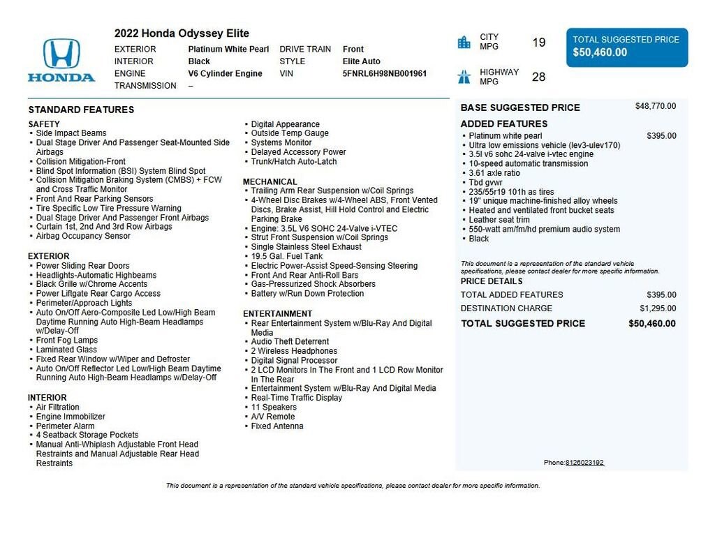 Every test drive at D-Patrick Ford in Evansville earns $10 to a local charity. Schedule your test drive today! 11 Speakers, 3.61 Axle Ratio, 3rd row seats: split-bench, 4-Wheel Disc Brakes, A/V remote: CabinControl, ABS brakes, Adaptive Cruise Control: Adaptive Cruise Control (ACC) with Low-Speed Follow, Air Conditioning, Alloy wheels, AM/FM radio: SiriusXM, Anti-whiplash front head restraints, Apple CarPlay/Android Auto, Auto High-beam Headlights, Auto-dimming door mirrors, Auto-dimming Rear-View mirror, Automatic temperature control, Blind Spot Information (BSI) System warning, Brake assist, Bumpers: body-color, CD player, Compass, Delay-off headlights, Driver door bin, Driver vanity mirror, Driver's Seat Mounted Armrest, Dual front impact airbags, Dual front side impact airbags, DVD-Audio, Electronic Stability Control, Emergency communication system: HondaLink, Exterior Parking Camera Rear, Forward collision: Collision Mitigation Braking System (CMBS) + FCW mitigation, Four wheel independent suspension, Front anti-roll bar, Front Bucket Seats, Front dual zone A/C, Front fog lights, Front reading lights, Fully automatic headlights, Garage door transmitter: HomeLink, Headphones, Heated & Ventilated Front Bucket Seats, Heated door mirrors, Heated front seats, Heated steering wheel, Illuminated entry, Knee airbag, Lane departure: Lane Keeping Assist System (LKAS) active, Leather Seat Trim, Leather steering wheel, Low tire pressure warning, Memory seat, Navigation system: Honda Satellite-Linked Navigation System, Occupant sensing airbag, Outside temperature display, Overhead airbag, Overhead console, Panic alarm, Passenger door bin, Passenger seat mounted armrest, Passenger vanity mirror, Power door mirrors, Power driver seat, Power Liftgate, Power moonroof, Power passenger seat, Power steering, Power windows, Radio data system, Radio: 550-Watt AM/FM/HD Premium Audio System, Rain sensing wipers, Rear air conditioning, Rear anti-roll bar, Rear audio controls, Rear reading lights, Rear seat center armrest, Rear window defroster, Rear window wiper, Reclining 3rd row seat, Remote keyless entry, Security system, Speed control, Speed-sensing steering, Speed-Sensitive Wipers, Split folding rear seat, Spoiler, Steering wheel mounted audio controls, Tachometer, Telescoping steering wheel, Tilt steering wheel, Traction control, Trip computer, Turn signal indicator mirrors, Variably intermittent wipers, Ventilated front seats, Wheels: 19 Unique Machine-Finished Alloy. Clean CARFAX. 4D Passenger Van Elite 10-Speed Automatic 3.5L V6 SOHC i-VTEC 24V FWD Platinum White Pearl CALL TODAY (812) 625-4823 OR SHOP ONLINE AT WWW.DPATRICKFORD.COM.
