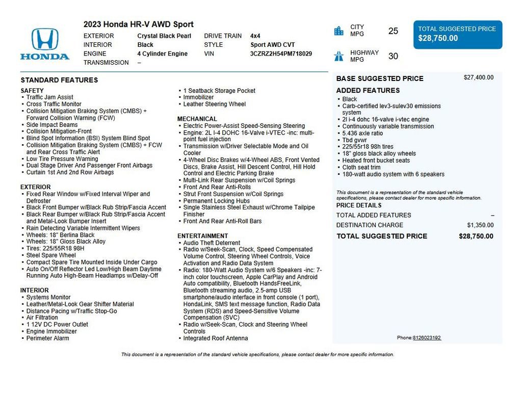 2023 Honda HR-V Sport We want you to shop confidently for your next used car at The BIG Ford Store, D-Patrick Ford. We are located on Highway 41 and Walnut in Evansville, right next to the Lloyd Expressway. Buy this used vehicle 100% online or in-store. This pre-owned vehicle was put through an extensive inspection before hitting our lot. Because of this, we are able to offer a 3-month/3,000-mile comprehensive limited warranty. You also get our Love It or Return It 5-day, 300-mile Exchange Policy. See our website for more details on both. We also offer extended service plans, vehicle protection plans, and offer a CarFax vehicle history report. *Prices listed do not include a $250 documentation fee, applicable tax, title, tags, license, or $195 service and preparation. All pricing, vehicle information, and features (such as accessories and color) are believed to be accurate, but we do not warrant or guarantee such accuracy. The prices shown above may vary from region to region, and incentives are subject to change. Some offers listed may not be available to all customers. All online sale commitments are subject to confirmation of continued availability of vehicle. Once availability is confirmed, online sale agreement becomes binding upon the parties. If any information found on the website is thought to be erroneous, please verify information with a customer service representative. See dealer for full details. Looking to sell your current vehicle? We buy cars for cash. Every test drive at D-Patrick Ford in Evansville earns $10 to a local charity. Schedule your test drive today! 4-Wheel Disc Brakes, 5.436 Axle Ratio, 6 Speakers, ABS brakes, Adaptive Cruise Control: Adaptive Cruise Control (ACC) with Low-Speed Follow, Air Conditioning, Alloy wheels, AM/FM radio, Apple CarPlay/Android Auto, Auto High-beam Headlights, Automatic temperature control, Blind Spot Information (BSI) System warning, Brake assist, Bumpers: body-color, Cloth Seat Trim, Delay-off headlights, Driver door bin, Driver vanity mirror, Dual front impact airbags, Dual front side impact airbags, Electronic Stability Control, Emergency communication system: HondaLink, Exterior Parking Camera Rear, Four wheel independent suspension, Front anti-roll bar, Front Bucket Seats, Front Center Armrest, Front reading lights, Fully automatic headlights, Heated door mirrors, Heated Front Bucket Seats, Heated front seats, Illuminated entry, Knee airbag, Leather Shift Knob, Low tire pressure warning, Occupant sensing airbag, Outside temperature display, Overhead airbag, Panic alarm, Passenger door bin, Passenger vanity mirror, Power door mirrors, Power steering, Power windows, Radio data system, Radio: 180-Watt Audio System w/6 Speakers, Rear anti-roll bar, Rear reading lights, Rear side impact airbag, Rear window defroster, Rear window wiper, Remote keyless entry, Security system, Speed control, Speed-sensing steering, Split folding rear seat, Spoiler, Steering wheel mounted audio controls, Tachometer, Telescoping steering wheel, Tilt steering wheel, Traction control, Trip computer, Turn signal indicator mirrors, Variably intermittent wipers, Wheels: 18 Gloss Black Alloy. CARFAX One-Owner. 4D Sport Utility Sport CVT 2.0L I4 DOHC 16V i-VTEC AWD Black CALL TODAY (812) 625-4823 OR SHOP ONLINE AT WWW.DPATRICKFORD.COM.