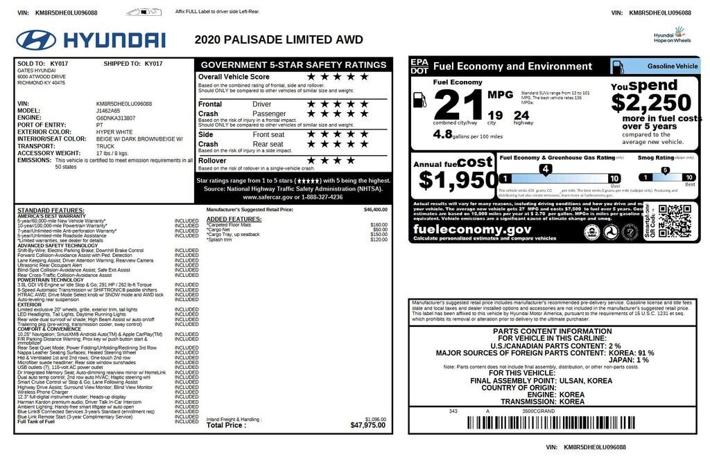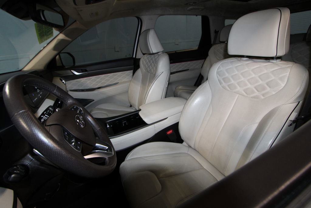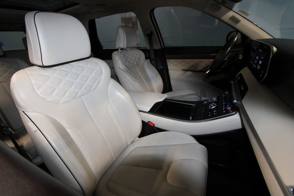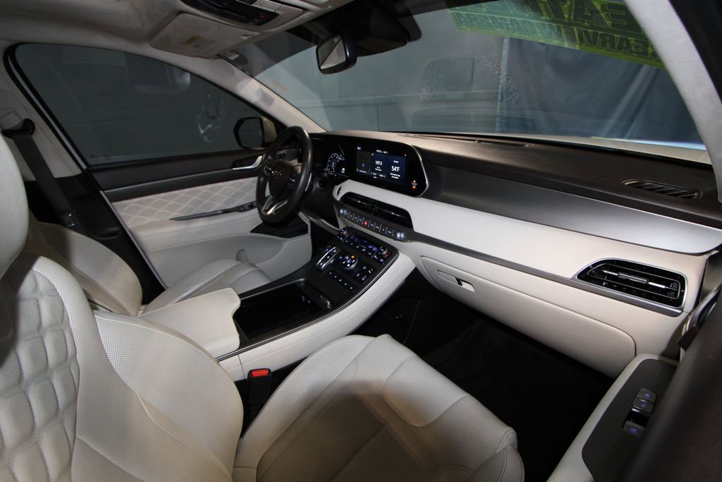 2020 Hyundai Palisade Limited We want you to shop confidently for your next used car at The BIG Ford Store, D-Patrick Ford. We are located on Highway 41 and Walnut in Evansville, right next to the Lloyd Expressway. Buy this used vehicle 100% online or in-store. This pre-owned vehicle was put through an extensive inspection before hitting our lot. Because of this, we are able to offer a 3-month/3,000-mile comprehensive limited warranty. You also get our Love It or Return It 5-day, 300-mile Exchange Policy. See our website for more details on both. We also offer extended service plans, vehicle protection plans, and offer a CarFax vehicle history report. *Prices listed do not include a $250 documentation fee, applicable tax, title, tags, license, or $195 service and preparation. All pricing, vehicle information, and features (such as accessories and color) are believed to be accurate, but we do not warrant or guarantee such accuracy. The prices shown above may vary from region to region, and incentives are subject to change. Some offers listed may not be available to all customers. All online sale commitments are subject to confirmation of continued availability of vehicle. Once availability is confirmed, online sale agreement becomes binding upon the parties. If any information found on the website is thought to be erroneous, please verify information with a customer service representative. See dealer for full details. Looking to sell your current vehicle? We buy cars for cash. Every test drive at D-Patrick Ford in Evansville earns $10 to a local charity. Schedule your test drive today! 12 Speakers, 3.648 Axle Ratio, 3rd row seats: split-bench, 4-Wheel Disc Brakes, ABS brakes, Air Conditioning, Alloy wheels, AM/FM radio: SiriusXM, Apple CarPlay & Android Auto, Auto High-beam Headlights, Auto-dimming Rear-View mirror, Auto-leveling suspension, Automatic temperature control, Brake assist, Bumpers: body-color, Cargo Net, Cargo Tray, Carpeted Floor Mats, Compass, Delay-off headlights, Driver door bin, Driver vanity mirror, Dual front impact airbags, Dual front side impact airbags, Electronic Stability Control, Emergency communication system, Four wheel independent suspension, Front anti-roll bar, Front Bucket Seats, Front Center Armrest, Front dual zone A/C, Front reading lights, Fully automatic headlights, Garage door transmitter: HomeLink, harman/kardon® Speakers, Heads-Up Display, Heated & Ventilated Front Bucket Seats, Heated door mirrors, Heated front seats, Heated rear seats, Heated steering wheel, Illuminated entry, Knee airbag, Low tire pressure warning, Memory seat, Mudguards, Navigation System, Occupant sensing airbag, Option Group 01, Outside temperature display, Overhead airbag, Overhead console, Panic alarm, Passenger door bin, Passenger vanity mirror, Power door mirrors, Power driver seat, Power Liftgate, Power moonroof, Power passenger seat, Power steering, Power windows, Premium Nappa Leather Seat Trim, Radio data system, Radio: AM/FM/MP3 Premium Audio System, Rain sensing wipers, Rear air conditioning, Rear anti-roll bar, Rear window defroster, Rear window wiper, Reclining 3rd row seat, Remote keyless entry, Security system, Speed control, Speed-sensing steering, Split folding rear seat, Spoiler, Steering wheel mounted audio controls, Tachometer, Telescoping steering wheel, Tilt steering wheel, Traction control, Trip computer, Turn signal indicator mirrors, Variably intermittent wipers, Ventilated front seats, Ventilated rear seats, Wheels: 20 x 7.5J 14-Spoke Premium Finish Alloy. 4D Sport Utility Limited 8-Speed Automatic with SHIFTRONIC V6 AWD Hyper White CALL TODAY (812) 625-4823 OR SHOP ONLINE AT WWW.DPATRICKFORD.COM.