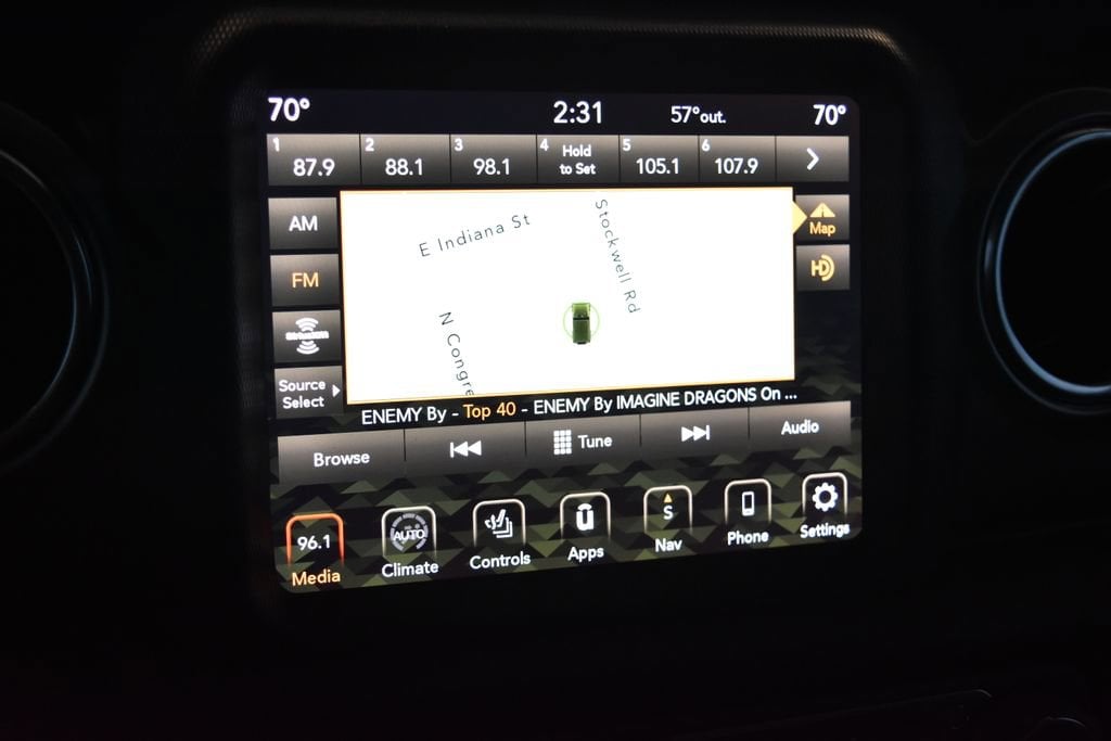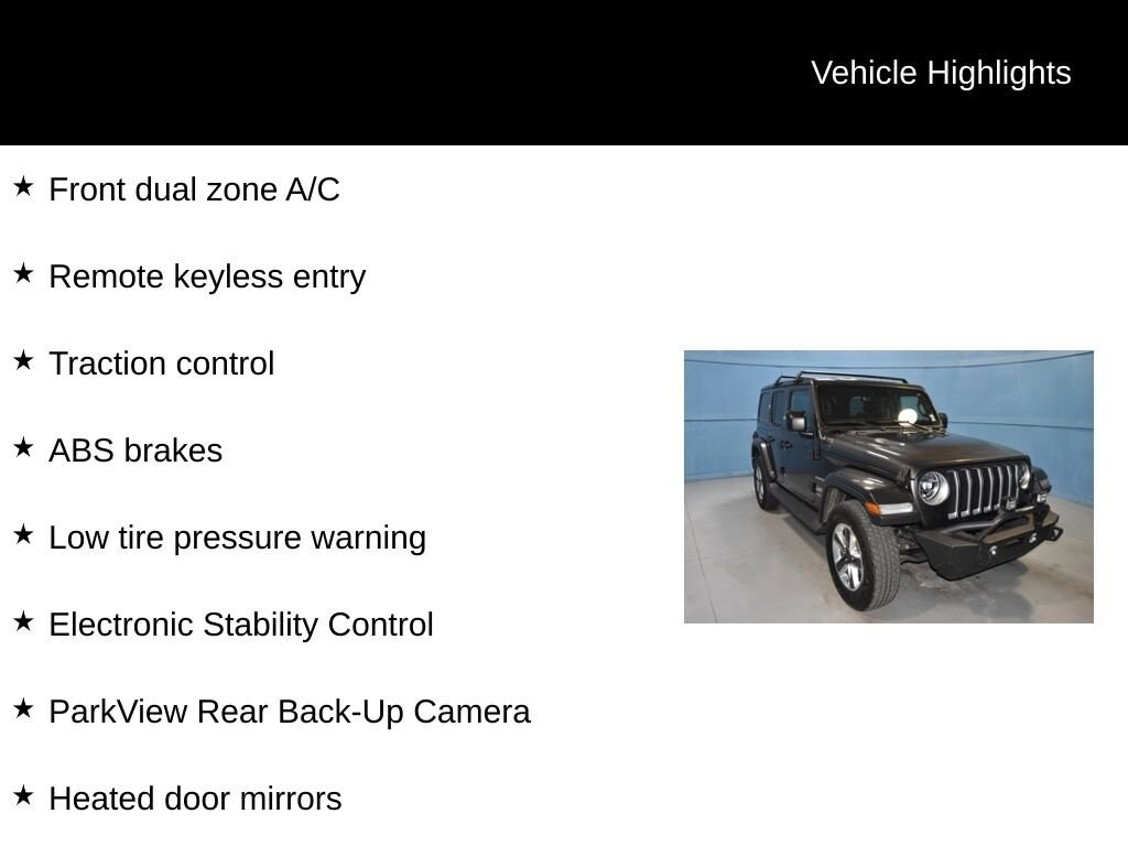 • ALPINE PREMIUM AUDIO SYSTEM,BLACK CLOTH LOW-BACK BUCKET SEATS,MOPAR CARGO TUB LINER,RADIO: UCONNECT 4C NAV W/8.4 DISPLAY,2.72:1 SELEC-TRAC FULL TIME 4WD SYSTEM,8.4 RADIO & PREMIUM AUDIO GROUP -inc: SiriusXM Traffic Plus Alpine Premium Audio System HD Radio Radio: Uconnect 4C Nav w/8.4 Display For Details Visit DriveUconnect.com Rear View Auto Dim Mirror 1-Year SiriusXM Guardian Trial 5-Year SiriusXM Travel Link Service GPS Navigation 5-Year SiriusXM Traffic Service SiriusXM Travel Link 4G LTE Wi-Fi Hot Spot Emergency/Assistance Call 8.4 Touchscreen Display,BODY COLOR 3-PIECE HARD TOP,MOPAR ALL-WEATHER FLOOR MATS,3.45 REAR AXLE RATIO (STD),MOPAR STAINLESS DOOR SILL GUARDS,WHEELS: 18 X 7.5 POLISHED W/GRAY SPOKES (STD),COLD WEATHER GROUP -inc: Heated Steering Wheel Heated Front Seats,REMOTE START SYSTEM,TRAILER TOW & HD ELECTRICAL GROUP -inc: Class II Receiver Hitch 700 Amp Maintenance Free Battery 7 & 4 Pin Wiring Harness 240 Amp Alternator Auxiliary Switches,GVWR: 5 500 LBS.,MOPAR HARDTOP HEADLINER,ENGINE: 3.6L V6 24V VVT ETORQUE UPG I -inc: 600 Amp Maintenance Free Battery 48V Belt Starter Generator Engine Oil Cooler Delete Alternator GVWR: 5 500 lbs,QUICK ORDER PACKAGE 25G -inc: Engine: 3.6L V6 24V VVT eTorque UPG I Transmission: 8-Speed Automatic (850RE),ANTI-SPIN DIFFERENTIAL REAR AXLE -inc: Tires: 255/70R18 All-Terrain Goodyear Brand Tires,TRANSMISSION: 8-SPEED AUTOMATIC (850RE) -inc: Dana M200 Rear Axle Selec-Speed Control,LED LIGHTING GROUP -inc: Daytime Running Lamps LED Accents Front LED Fog Lamps LED Premium Reflector Headlamps LED Taillamps,GRANITE CRYSTAL METALLIC CLEARCOAT,Four Wheel Drive,Power Steering,ABS,4-Wheel Disc Brakes,Brake Assist,Brake Actuated Limited Slip Differential,Aluminum Wheels,Conventional Spare Tire,Tow Hooks,Tow Hooks,Heated Mirrors,Power Mirror(s),Privacy Glass,Intermittent Wipers,Variable Speed Intermittent Wipers,Rollover Protection Bars,Convertible Soft Top,Running Boards/Side Steps,Power Door Locks,Daytime Running Lights,Automatic Headlights,Fog Lamps,AM/FM Stereo,Satellite Radio,Bluetooth Connection,Requires Subscription,MP3 Capability,Steering Wheel Audio Controls,Auxiliary Audio Input,Smart Device Integration,Driver Adjustable Lumbar,Driver Adjustable Lumbar,Pass-Through Rear Seat,Rear Bench Seat,Adjustable Steering Wheel,Trip Computer,Power Windows,Leather Steering Wheel,Keyless Start,Keyless Entry,Power Door Locks,Universal Garage Door Opener,Cruise Control,Climate Control,Multi-Zone A/C,A/C,Cloth Seats,Bucket Seats,Driver Vanity Mirror,Passenger Vanity Mirror,Driver Illuminated Vanity Mirror,Passenger Illuminated Visor Mirror,Floor Mats,Smart Device Integration,Bluetooth Connection,Smart Device Integration,Power Windows,Power Door Locks,Trip Computer,Security System,Immobilizer,Traction Control,Stability Control,Traction Control,Front Side Air Bag,Tire Pressure Monitor,Driver Air Bag,Passenger Air Bag,Passenger Air Bag Sensor,Child Safety Locks,Back-Up Camera