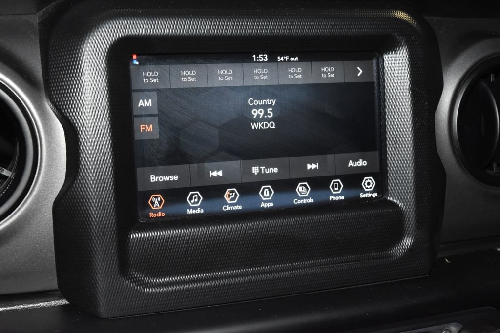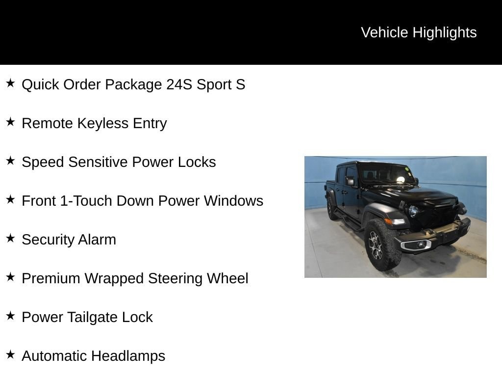 2023 Jeep Gladiator Sport Recent Arrival! We want you to shop confidently for your next used car at D-Patrick Motoplex on Green River Road. Buy this used vehicle 100% online or in-store. This pre-owned vehicle was put through an extensive inspection before hitting our lot. Because of this, we are able to offer a 3-month/3,000-mile comprehensive limited warranty. You also get our Love It or Return It 5-day, 300-mile Exchange Policy. See our website for more details on both. We also offer extended warranties, additional protection plans, and offer a CarFax vehicle history report. *Prices listed do not include a $250 documentation fee, applicable tax, title, tags, license, or $195 service and preparation. All pricing, vehicle information, and features (such as accessories and color) are believed to be accurate, but we do not warrant or guarantee such accuracy. The prices shown above may vary from region to region, and incentives are subject to change. Some offers listed may not be available to all customers. All online sale commitments are subject to confirmation of continued availability of vehicle. Once availability is confirmed, online sale agreement becomes binding upon the parties. If any information found on the website is thought to be erroneous, please verify information with a customer service representative. See dealer for full details. Looking to sell your current vehicle? We are Evansville's KBB Instant Cash Offer Buying Center. Automatic Headlamps, Deep Tint Sunscreen Windows, Front 1-Touch Down Power Windows, Normal Duty Plus Suspension, Power Heated Mirrors, Power Tailgate Lock, Premium Wrapped Steering Wheel, Quick Order Package 24S Sport S, Remote Keyless Entry, Security Alarm, Speed Sensitive Power Locks, Sport S, Sun Visors w/Illuminated Vanity Mirrors, Wheels: 17 x 7.5 Tech Silver Aluminum, 3.73 Rear Axle Ratio, 4-Wheel Disc Brakes, 4G LTE Wi-Fi Hot Spot, 8 Speakers, ABS brakes, Air Conditioning, AM/FM radio, Apple CarPlay, Apple CarPlay/Android Auto, Black 3-Piece Hard Top, Brake assist, Cloth Low-Back Bucket Seats, Compass, Delay-off headlights, Driver door bin, Driver vanity mirror, Dual front impact airbags, Dual front side impact airbags, Electronic Stability Control, Emergency communication system, Freedom Panel Storage Bag, Front anti-roll bar, Front Bucket Seats, Front Center Armrest w/Storage, Front fog lights, Front License Plate Bracket, Front reading lights, Google Android Auto, GPS Antenna Input, Integrated Center Stack Radio, Integrated roll-over protection, Integrated Voice Command w/Bluetooth, Low tire pressure warning, Normal Duty Suspension, Occupant sensing airbag, Outside temperature display, ParkView Rear Back-Up Camera, Passenger door bin, Passenger vanity mirror, Power steering, Radio data system, Radio: Uconnect 4 w/7 Display, Rear anti-roll bar, Rear reading lights, Rear Sliding Window, Rear Window Defroster, Speed control, Split folding rear seat, Steering wheel mounted audio controls, Tachometer, Telescoping steering wheel, Tilt steering wheel, Traction control, Trip computer, USB Host Flip, Variably intermittent wipers, Wheels: 17 x 7.5 Black Steel Styled, Wheels: 17 x 7.5 Tech Silver Aluminum (DISC), Automatic Headlamps, Deep Tint Sunscreen Windows, Front 1-Touch Down Power Windows, Normal Duty Plus Suspension, Power Heated Mirrors, Power Tailgate Lock, Premium Wrapped Steering Wheel, Quick Order Package 24S Sport S, Remote Keyless Entry, Security Alarm, Speed Sensitive Power Locks, Sport S, Sun Visors w/Illuminated Vanity Mirrors, Wheels: 17 x 7.5 Tech Silver Aluminum. 4D Crew Cab Sport 8-Speed Automatic 3.6L V6 24V VVT 4WD Black Clearcoat CALL US TODAY 812-471-7792 and shop online at www.dpat.com.